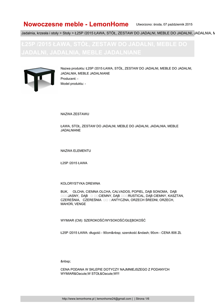 Nowoczesne meble - LemonHome Utworzono: środa, 07 październik 2015 Jadalnia, krzesła i stoły > Stoły > Ł25P /2015 ŁAWA, STÓŁ, ZESTAW DO JADALNI, MEBLE DO JADALNI, JADALNIA, M Ł25P /2015 ŁAWA, STÓŁ, ZESTAW DO JADALNI, MEBLE DO JADALNI, JADALNIA, MEBLE JADALNIANE Nazwa produktu: Ł25P /2015 ŁAWA, STÓŁ, ZESTAW DO JADALNI, MEBLE DO JADALNI, JADALNIA, MEBLE JADALNIANE Producent: Model produktu: - NAZWA ZESTAWU ŁAWA, STOŁ, ZESTAW DO JADALNI, MEBLE DO JADALNI, JADALNIA, MEBLE JADALNIANE NAZWA ELEMENTU Ł25P /2015 ŁAWA KOLORYSTYKA DREWNA BUK, OLCHA, CIEMNA OLCHA, CALVADOS, POPIEL, DĄB SONOMA, DĄB JASNY, DĄB CIEMNY, DĄB RUSTICAL, DĄB CIEMNY, KASZTAN, CZEREŚNIA, CZEREŚNIA ANTYCZNA, ORZECH ŚREDNI, ORZECH, MAHOŃ, VENGE WYMIAR (CM): SZEROKOŚĆ/WYSOKOŚĆ/GŁĘBOKOŚĆ Ł25P /2015 ŁAWA: długość - 90cm szerokość – 90cm - CENA 806 ZŁ CENA PODANA W SKLEPIE DOTYCZY NAJMNIEJSZEGO Z PODANYCH WYMIARÓW STOŁÓW!!! http://www.lemonhome.pl | [email protected] | | Strona 1/6 Nowoczesne meble - LemonHome Utworzono: środa, 07 październik 2015 Jadalnia, krzesła i stoły > Stoły > Ł25P /2015 ŁAWA, STÓŁ, ZESTAW DO JADALNI, MEBLE DO JADALNI, JADALNIA, M Ł25P /2015 ŁAWA, STÓŁ, ZESTAW DO JADALNI, MEBLE DO JADALNI, JADALNIA, MEBLE JADALNIANE GWARANCJA 24 MIESIĄCE CZAS DOSTAWY 1-4 TYGODNI WYKONANIE I OPIS MEBLE WYKONANE W OKLEINIE NATURALNEJ BUKOWEJ NIEKTÓRE TOWARY ZAWIERAJA ELEMENTY SZKLANE NIEKTÓRE TOWARY ZAWIERAJĄ ELEMENTY METALOWE NIKTÓRE TOWARY WYKONANE SĘ W LAMINACIE ABS NIEKTÓRE TOWRY WYKONANE SĄ W LAMINACIE MDF WYBRAWIENIA DREWNA W KOLORZE BIAŁYM LUB CZARNYM +20% CENY ZESTAW DO JADALNI, MEBLE DO JADALNI, JADALNIA, MEBLE JADALNIANE. ZESTAW IDEALNIE NADAJE SIĘ DO NOWOCZESNEJ JADALNI, BĘDZIE ON POŁĄCZENIEM NOWOCZESNOŚCI I KOMFORTU. http://www.lemonhome.pl | [email protected] | | Strona 2/6 Nowoczesne meble - LemonHome Utworzono: środa, 07 październik 2015 Jadalnia, krzesła i stoły > Stoły > Ł25P /2015 ŁAWA, STÓŁ, ZESTAW DO JADALNI, MEBLE DO JADALNI, JADALNIA, M Ł25P /2015 ŁAWA, STÓŁ, ZESTAW DO JADALNI, MEBLE DO JADALNI, JADALNIA, MEBLE JADALNIANE KOSZT DOSTAWY KONTAKT TEL. 665800193, EMAIL: [email protected] RATY SKORZYSTAJ Z RAT WYBIERAJĄC ODPOWIEDNIĄ FORMĘ PŁATNOŚCI W KOLEJNYCH KROKACH ZAKUPÓW I WYPEŁNIJ WNIOSEK!!! http://www.lemonhome.pl | [email protected] | | Strona 3/6 Nowoczesne meble - LemonHome Utworzono: środa, 07 październik 2015 Jadalnia, krzesła i stoły > Stoły > Ł25P /2015 ŁAWA, STÓŁ, ZESTAW DO JADALNI, MEBLE DO JADALNI, JADALNIA, M Ł25P /2015 ŁAWA, STÓŁ, ZESTAW DO JADALNI, MEBLE DO JADALNI, JADALNIA, MEBLE JADALNIANE http://www.lemonhome.pl | [email protected] | | Strona 4/6 Nowoczesne meble - LemonHome Utworzono: środa, 07 październik 2015 Jadalnia, krzesła i stoły > Stoły > Ł25P /2015 ŁAWA, STÓŁ, ZESTAW DO JADALNI, MEBLE DO JADALNI, JADALNIA, M Ł25P /2015 ŁAWA, STÓŁ, ZESTAW DO JADALNI, MEBLE DO JADALNI, JADALNIA, MEBLE JADALNIANE http://www.lemonhome.pl | [email protected] | | Strona 5/6 Nowoczesne meble - LemonHome Utworzono: środa, 07 październik 2015 Jadalnia, krzesła i stoły > Stoły > Ł25P /2015 ŁAWA, STÓŁ, ZESTAW DO JADALNI, MEBLE DO JADALNI, JADALNIA, M Ł25P /2015 ŁAWA, STÓŁ, ZESTAW DO JADALNI, MEBLE DO JADALNI, JADALNIA, MEBLE JADALNIANE Cena: 806.00zł Dostępność: Ten produkt został dodany do sklepu w dniu poniedziałek, 05 październik 2015 http://www.lemonhome.pl | [email protected] | | Strona 6/6