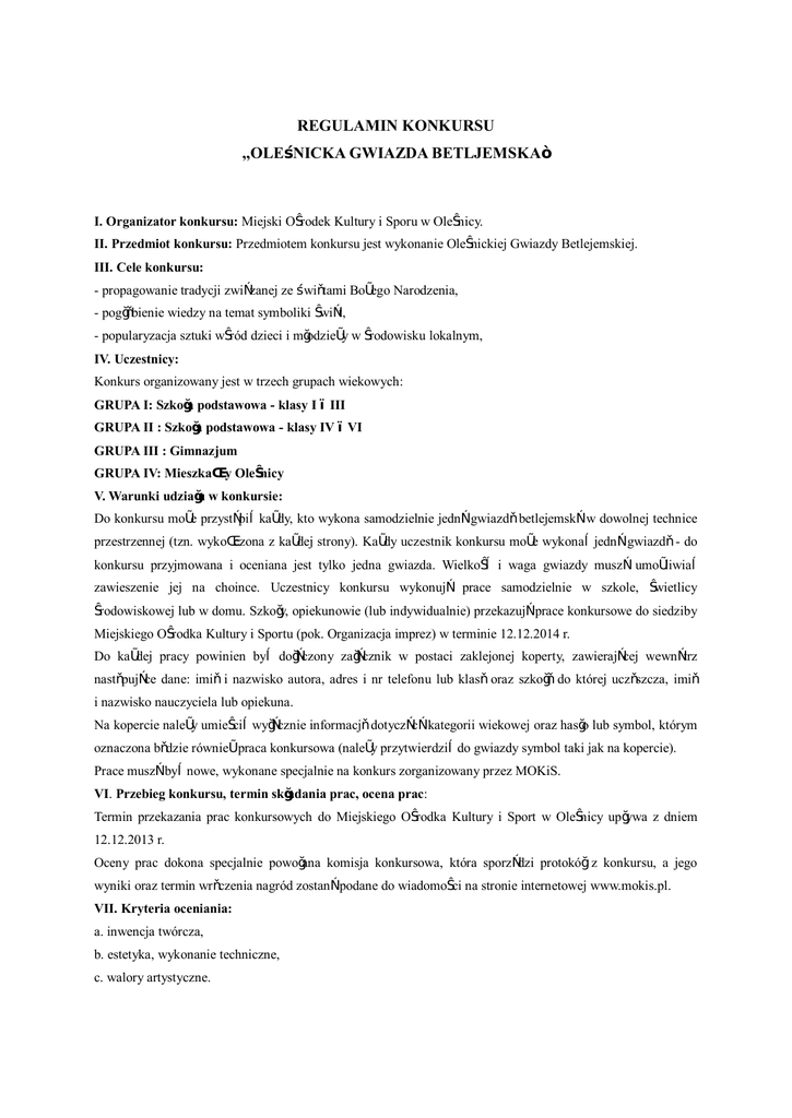 REGULAMIN KONKURSU ,,OLEŚNICKA GWIAZDA BETLJEMSKA” I. Organizator konkursu: Miejski Ośrodek Kultury i Sporu w Oleśnicy. II. Przedmiot konkursu: Przedmiotem konkursu jest wykonanie Oleśnickiej Gwiazdy Betlejemskiej. III. Cele konkursu: - propagowanie tradycji związanej ze Świętami Bożego Narodzenia, - pogłębienie wiedzy na temat symboliki świąt, - popularyzacja sztuki wśród dzieci i młodzieży w środowisku lokalnym, IV. Uczestnicy: Konkurs organizowany jest w trzech grupach wiekowych: GRUPA I: Szkoła podstawowa - klasy I – III GRUPA II : Szkoła podstawowa - klasy IV – VI GRUPA III : Gimnazjum GRUPA IV: Mieszkańcy Oleśnicy V. Warunki udziału w konkursie: Do konkursu może przystąpić każdy, kto wykona samodzielnie jedną gwiazdę betlejemską w dowolnej technice przestrzennej (tzn. wykończona z każdej strony). Każdy uczestnik konkursu może wykonać jedną gwiazdę - do konkursu przyjmowana i oceniana jest tylko jedna gwiazda. Wielkość i waga gwiazdy muszą umożliwiać zawieszenie jej na choince. Uczestnicy konkursu wykonują prace samodzielnie w szkole, świetlicy środowiskowej lub w domu. Szkoły, opiekunowie (lub indywidualnie) przekazują prace konkursowe do siedziby Miejskiego Ośrodka Kultury i Sportu (pok. Organizacja imprez) w terminie 12.12.2014 r. Do każdej pracy powinien być dołączony załącznik w postaci zaklejonej koperty, zawierającej wewnątrz następujące dane: imię i nazwisko autora, adres i nr telefonu lub klasę oraz szkołę do której uczęszcza, imię i nazwisko nauczyciela lub opiekuna. Na kopercie należy umieścić wyłącznie informację dotyczącą kategorii wiekowej oraz hasło lub symbol, którym oznaczona będzie również praca konkursowa (należy przytwierdzić do gwiazdy symbol taki jak na kopercie). Prace muszą być nowe, wykonane specjalnie na konkurs zorganizowany przez MOKiS. VI. Przebieg konkursu, termin składania prac, ocena prac: Termin przekazania prac konkursowych do Miejskiego Ośrodka Kultury i Sport w Oleśnicy upływa z dniem 12.12.2013 r. Oceny prac dokona specjalnie powołana komisja konkursowa, która sporządzi protokół z konkursu, a jego wyniki oraz termin wręczenia nagród zostaną podane do wiadomości na stronie internetowej www.mokis.pl. VII. Kryteria oceniania: a. inwencja twórcza, b. estetyka, wykonanie techniczne, c. walory artystyczne. VIII. Nagrody. W każdej kategorii wiekowej zostaną nagrodzone trzy najciekawsze prace. IX. Postanowienia końcowe. Zgłoszenie prac do konkursu jest równoznaczne z przekazaniem praw autorskich do nich na rzecz Organizatora, o których mowa w art. 50 ustawy z dnia 4 lutego 1994r. o prawach autorskich i prawach pokrewnych (Dz. U. z 1994r., Nr 24, poz. 83) oraz do publikacji w wydawnictwach wszelkiego typu, wydawanych przez Organizatora oraz w Internecie. Organizator zastrzega sobie prawo zatrzymania prac. Uczestnik konkursu oświadcza, że wyraża zgodę na wykorzystanie swoich danych osobowych przez Organizatora w celu wyłonienia zwycięzcy i przyznania nagrody; umieszczenia danych w materiałach publikowanych przez Organizatora i na stronie internetowej Organizatora; promocji konkursu lub idei konkursu. Uczestnik konkursu ma prawo wglądu do swoich danych osobowych oraz ich weryfikacji. Organizator nie ponosi odpowiedzialności za uszkodzenia prac powstałe podczas transportu. Wszystkie informacje pod numerem 71 314-30-38.
