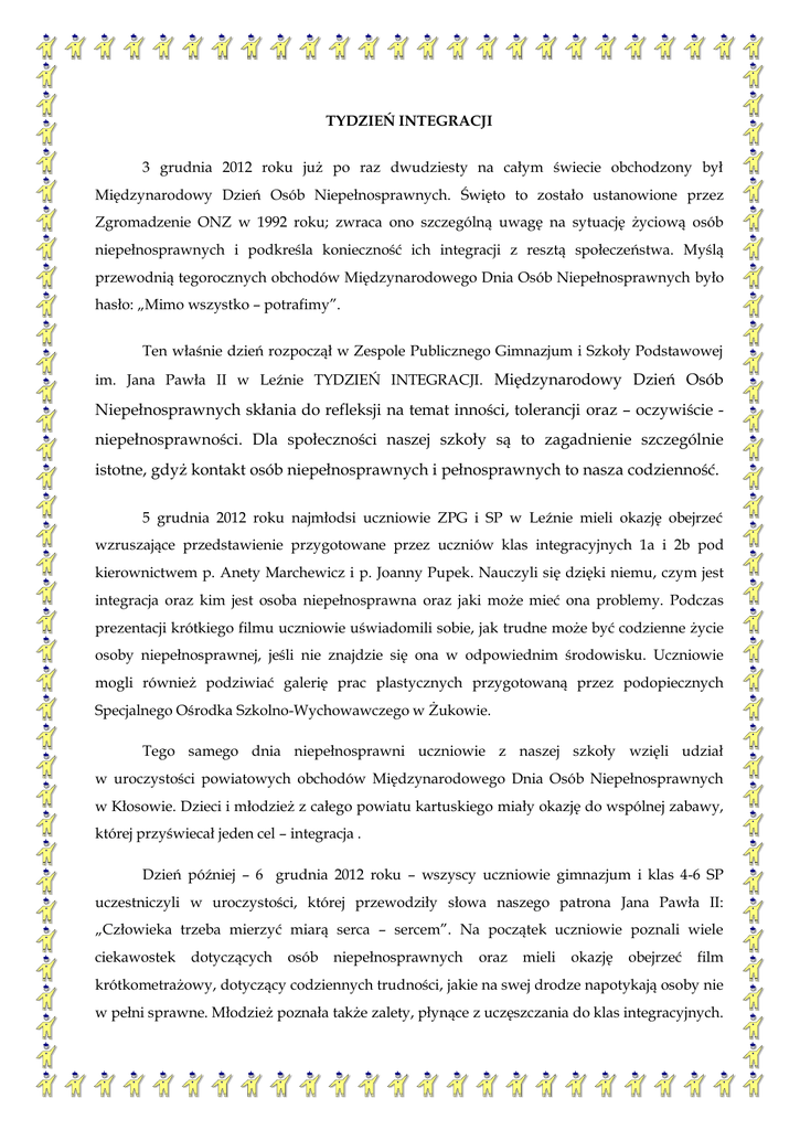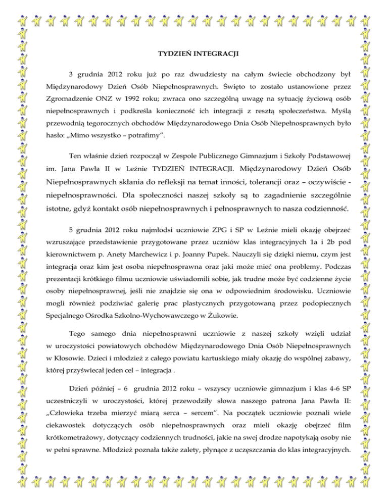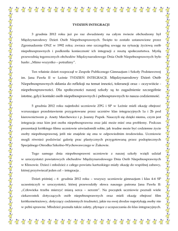 TYDZIEŃ INTEGRACJI 3 grudnia 2012 roku już po raz dwudziesty na całym świecie obchodzony był Międzynarodowy Dzień Osób Niepełnosprawnych. Święto to zostało ustanowione przez Zgromadzenie ONZ w 1992 roku; zwraca ono szczególną uwagę na sytuację życiową osób niepełnosprawnych i podkreśla konieczność ich integracji z resztą społeczeństwa. Myślą przewodnią tegorocznych obchodów Międzynarodowego Dnia Osób Niepełnosprawnych było hasło: „Mimo wszystko – potrafimy”. Ten właśnie dzień rozpoczął w Zespole Publicznego Gimnazjum i Szkoły Podstawowej im. Jana Pawła II w Leźnie TYDZIEŃ INTEGRACJI. Międzynarodowy Dzień Osób Niepełnosprawnych skłania do refleksji na temat inności, tolerancji oraz – oczywiście niepełnosprawności. Dla społeczności naszej szkoły są to zagadnienie szczególnie istotne, gdyż kontakt osób niepełnosprawnych i pełnosprawnych to nasza codzienność. 5 grudnia 2012 roku najmłodsi uczniowie ZPG i SP w Leźnie mieli okazję obejrzeć wzruszające przedstawienie przygotowane przez uczniów klas integracyjnych 1a i 2b pod kierownictwem p. Anety Marchewicz i p. Joanny Pupek. Nauczyli się dzięki niemu, czym jest integracja oraz kim jest osoba niepełnosprawna oraz jaki może mieć ona problemy. Podczas prezentacji krótkiego filmu uczniowie uświadomili sobie, jak trudne może być codzienne życie osoby niepełnosprawnej, jeśli nie znajdzie się ona w odpowiednim środowisku. Uczniowie mogli również podziwiać galerię prac plastycznych przygotowaną przez podopiecznych Specjalnego Ośrodka Szkolno-Wychowawczego w Żukowie. Tego samego dnia niepełnosprawni uczniowie z naszej szkoły wzięli udział w uroczystości powiatowych obchodów Międzynarodowego Dnia Osób Niepełnosprawnych w Kłosowie. Dzieci i młodzież z całego powiatu kartuskiego miały okazję do wspólnej zabawy, której przyświecał jeden cel – integracja . Dzień później – 6 grudnia 2012 roku – wszyscy uczniowie gimnazjum i klas 4-6 SP uczestniczyli w uroczystości, której przewodziły słowa naszego patrona Jana Pawła II: „Człowieka trzeba mierzyć miarą serca – sercem”. Na początek uczniowie poznali wiele ciekawostek dotyczących osób niepełnosprawnych oraz mieli okazję obejrzeć film krótkometrażowy, dotyczący codziennych trudności, jakie na swej drodze napotykają osoby nie w pełni sprawne. Młodzież poznała także zalety, płynące z uczęszczania do klas integracyjnych. Po części oficjalnej na uczniów czekała wspaniała zabawa i konkursy, w których chętnie brali udział na scenie. Wszystkie atrakcje uczniowie zawdzięczają nauczycielom, którzy zaangażowali się w zorganizowanie tego wspaniałego przedsięwzięcia – p. Markowi Krauza, p. Weronice Idzikowskiej, p. Aleksandrze Lew-Kiedrowskiej oraz p. Kamilli Król. Dzięki hojności sponsorów uczniowie naszej szkoły otrzymali piękne nagrody i słodki poczęstunek. Serdeczne podziękowania kierujemy do właścicieli: Centrum Handlowego Zieger z Kartuz, Sklepu Sieć 34 z Żukowa oraz Delikatesów Justynka z Pępowa. Miejmy nadzieję, iż wiedza i doświadczenie nabyte podczas Tygodnia Integracji będą owocowały coraz większą tolerancją i zrozumieniem dla osób niepełnosprawnych, w szkole i poza nią.
