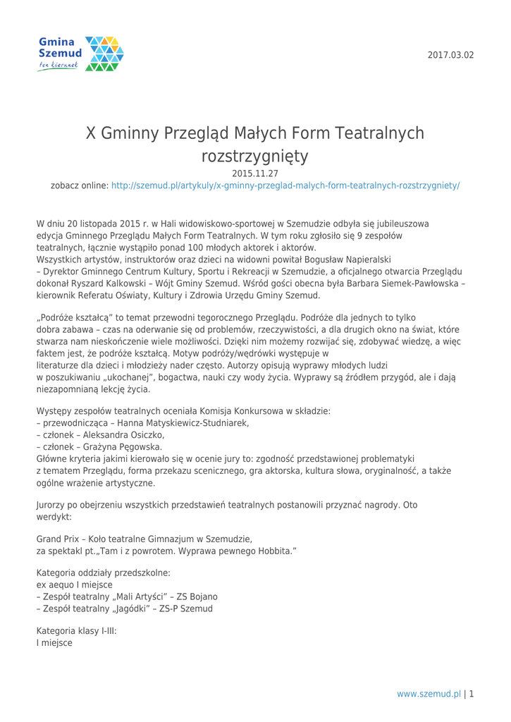 2017.03.02 X Gminny Przegląd Małych Form Teatralnych rozstrzygnięty 2015.11.27 zobacz online: http://szemud.pl/artykuly/x-gminny-przeglad-malych-form-teatralnych-rozstrzygniety/ W dniu 20 listopada 2015 r. w Hali widowiskowo-sportowej w Szemudzie odbyła się jubileuszowa edycja Gminnego Przeglądu Małych Form Teatralnych. W tym roku zgłosiło się 9 zespołów teatralnych, łącznie wystąpiło ponad 100 młodych aktorek i aktorów. Wszystkich artystów, instruktorów oraz dzieci na widowni powitał Bogusław Napieralski – Dyrektor Gminnego Centrum Kultury, Sportu i Rekreacji w Szemudzie, a oficjalnego otwarcia Przeglądu dokonał Ryszard Kalkowski – Wójt Gminy Szemud. Wśród gości obecna była Barbara Siemek-Pawłowska – kierownik Referatu Oświaty, Kultury i Zdrowia Urzędu Gminy Szemud. „Podróże kształcą” to temat przewodni tegorocznego Przeglądu. Podróże dla jednych to tylko dobra zabawa – czas na oderwanie się od problemów, rzeczywistości, a dla drugich okno na świat, które stwarza nam nieskończenie wiele możliwości. Dzięki nim możemy rozwijać się, zdobywać wiedzę, a więc faktem jest, że podróże kształcą. Motyw podróży/wędrówki występuje w literaturze dla dzieci i młodzieży nader często. Autorzy opisują wyprawy młodych ludzi w poszukiwaniu „ukochanej”, bogactwa, nauki czy wody życia. Wyprawy są źródłem przygód, ale i dają niezapomnianą lekcję życia. Występy zespołów teatralnych oceniała Komisja Konkursowa w składzie: – przewodnicząca – Hanna Matyskiewicz-Studniarek, – członek – Aleksandra Osiczko, – członek – Grażyna Pęgowska. Główne kryteria jakimi kierowało się w ocenie jury to: zgodność przedstawionej problematyki z tematem Przeglądu, forma przekazu scenicznego, gra aktorska, kultura słowa, oryginalność, a także ogólne wrażenie artystyczne. Jurorzy po obejrzeniu wszystkich przedstawień teatralnych postanowili przyznać nagrody. Oto werdykt: Grand Prix – Koło teatralne Gimnazjum w Szemudzie, za spektakl pt.„Tam i z powrotem. Wyprawa pewnego Hobbita.” Kategoria oddziały przedszkolne: ex aequo I miejsce – Zespół teatralny „Mali Artyści” – ZS Bojano – Zespół teatralny „Jagódki” – ZS-P Szemud Kategoria klasy I-III: I miejsce www.szemud.pl | 1 2017.03.02 – Zespół teatralny „Jelonki” – SP Jeleńska Huta II miejsce – Szkolny teatrzyk „Koleczkowianie” – ZS-P Koleczkowo III miejsce – Zespół teatralny „Bez Próby” – ZS-P Szemud Kategoria klasy IV-VI: ex aequo I miejsce – Zespół teatralny „ Teatrałki” – SP Łebno – Zespół teatralny „Tęczowa Maskarada” – ZS Bojano II miejsce – Zespół teatralny „Kopciuszek” – SP Częstkowo Wspaniałe występy młodych aktorów nagradzane były gromkimi oklaskami przez zgromadzoną dziecięcą publiczność. Wrażenie artystyczne potęgowały wspaniale kostiumy, rekwizyty i dekoracje sceniczne oraz adekwatna muzyka podkreślająca odpowiedni nastrój. W ocenie Komisji Konkursowej na uwagę zasługują także świetnie autorskie teksty przedstawień napisane przez instruktorów zespołów teatralnych tj. przez p. Bogumiłę Mejer, p. Aleksandrę Wesołowską, p. Renatę Kos, p. Magdalenę Naczk. Wielkie brawa ! Wręczenie nagród laureatom Przeglądu odbędzie się w trakcie „Szemudzkich Targów Artystycznych – Boże Narodzenie 2015”, które odbędą się w niedzielę 13 grudnia 2015 r. w Hali widowiskowo-sportowej w Szemudzie. Po uroczystości wręczenia nagród, około godz. 17.00 odbędzie się przedstawienie Koła teatralnego Gimnazjum w Szemudzie, na które wszystkich miłośników teatru zapraszamy. Organizatorzy pragną podziękować za wysiłek i zaangażowanie wszystkim instruktorom grup teatralnych oraz złożyć gratulacje młodym talentom aktorskim za wspaniałe występy. Leszek Walkowiak www.szemud.pl | 2