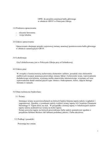 OPIS do projektu aranżacji hallu głównego w obiekcie GRYF w Połczynie Zdroju 1.0 Podstawa opracowania - zlecenie Inwestora wizja lokalna 2.0 Zakres opracowania: Opracowanie obejmuje projekt częściowej zmiany aranżacji pomieszczenia hallu głównego w obiekcie sanatoryjnym GRYF. 3.0 Lokalizacja: Gryf zlokalizowany jest w Połczynie Zdroju przy ul Solankowej. 4.0 Zakres prac: W związku z koniecznością zachowania elementów sufitów, posadzki oraz elementów meblowych recepcji aranżacja przewiduje zmiany faktur i kolorystyki ścian, wprowadzenie dodatkowego oświetlenia, wymianę mebla stanowiska internetowego, wymianę sof oraz wprowadzenie detali aranżacyjnych typu: donice z bukszpanem, lustro, zdjęcia dużego formatu w ramach. 5.0 Dane techniczno budowlane: 5.1 Ściany: Istniejące ściany na powierzchniach na których będzie klejona tapeta należy wygładzić i zagruntować. Zgodnie z rysunkami należy wykleić ściany tapetą AS Creations Ornament Hermitage 9. Tapete kleic na styk . W przypadku ciemnej tapety w lokalizacjach styków tapety należy podmalować ścianę na kolor tapety. Ściany powyżej tapety na których przewidziano farbe należy pomalować zgodnie z projektem farbami Beckers lub farbami podobnej jakości. Farba akrylowa. 5.2 Podłogi i posadzki: Pozostają bez zmian. 1 5.3 Tynki: Istniejące – wygładzone masami gipsowymi . 5.4 Malowanie: Kolorystyka scian zgodnie z projektem aranżacji w/g wzornika kolorów NCS. Farby Beckers lub farba odpowiadająca jakości wymienionej farbie. 5.5. Stolarka okienna i drzwiowa: Bez zmian. 5.7 Sufit podwieszony: Istniejące sufity – pomalowane zgodnie z projektem. 5.8Oświetlenie Zaprojektowano oświetlenie lampami ab ażurowymi nad ladą recepcji. Wprowadzono w centralnej części sufitu dodatkowa Lampe abażurową. Nie ingerowano w pozostałe oświetlenie hallu. Załączanie dodatkowych lamp należy przewidzieć z recepcji. 5.9 Wentylacja : Istniejąca. 6.0 Zabudowy grzejników: Zaprojektowano obudowy grzejników . . Zabudowa wykonana z płyt laminowanych analogicznych jak obudowy słupów. Wypełnienie zabudowy z blachy perforowanej malowanej. 7.0 Elementy meblowe zgodnie z dokumentacją. mgr inż. arch. Dobrosława Matela - Łapczuk 2