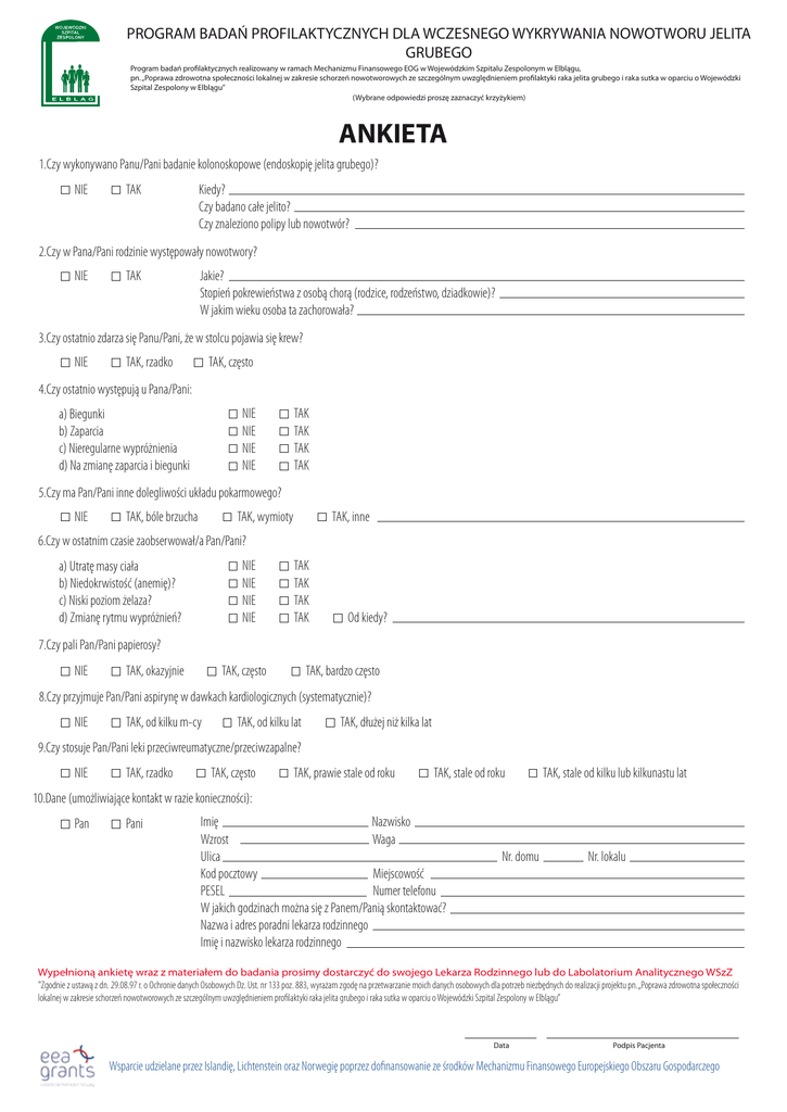 PROGRAM BADAŃ PROFILAKTYCZNYCH DLA WCZESNEGO WYKRYWANIA NOWOTWORU JELITA GRUBEGO Program badań profilaktycznych realizowany w ramach Mechanizmu Finansowego EOG w Wojewódzkim Szpitalu Zespolonym w Elblągu, pn. „Poprawa zdrowotna społeczności lokalnej w zakresie schorzeń nowotworowych ze szczególnym uwzględnieniem profilaktyki raka jelita grubego i raka sutka w oparciu o Wojewódzki Szpital Zespolony w Elblągu” (Wybrane odpowiedzi proszę zaznaczyć krzyżykiem) ANKIETA 1.Czy wykonywano Panu/Pani badanie kolonoskopowe (endoskopię jelita grubego)? NIE TAK Kiedy? Czy badano całe jelito? Czy znaleziono polipy lub nowotwór? 2.Czy w Pana/Pani rodzinie występowały nowotwory? NIE TAK Jakie? Stopień pokrewieństwa z osobą chorą (rodzice, rodzeństwo, dziadkowie)? W jakim wieku osoba ta zachorowała? 3.Czy ostatnio zdarza się Panu/Pani, że w stolcu pojawia się krew? NIE TAK, rzadko TAK, często 4.Czy ostatnio występują u Pana/Pani: NIE NIE NIE NIE a) Biegunki b) Zaparcia c) Nieregularne wypróżnienia d) Na zmianę zaparcia i biegunki TAK TAK TAK TAK 5.Czy ma Pan/Pani inne dolegliwości układu pokarmowego? NIE TAK, bóle brzucha TAK, wymioty TAK, inne 6.Czy w ostatnim czasie zaobserwował/a Pan/Pani? NIE NIE NIE NIE a) Utratę masy ciała b) Niedokrwistość (anemię)? c) Niski poziom żelaza? d) Zmianę rytmu wypróżnień? TAK TAK TAK TAK Od kiedy? 7.Czy pali Pan/Pani papierosy? NIE TAK, okazyjnie TAK, często TAK, bardzo często 8.Czy przyjmuje Pan/Pani aspirynę w dawkach kardiologicznych (systematycznie)? NIE TAK, od kilku m-cy TAK, od kilku lat TAK, dłużej niż kilka lat 9.Czy stosuje Pan/Pani leki przeciwreumatyczne/przeciwzapalne? NIE TAK, rzadko TAK, często TAK, prawie stale od roku TAK, stale od roku TAK, stale od kilku lub kilkunastu lat 10.Dane (umożliwiające kontakt w razie konieczności): Pan Pani Imię Nazwisko Wzrost Waga Ulica Kod pocztowy Miejscowość PESEL Numer telefonu W jakich godzinach można się z Panem/Panią skontaktować? Nazwa i adres poradni lekarza rodzinnego Imię i nazwisko lekarza rodzinnego Nr. domu Nr. lokalu Wypełnioną ankietę wraz z materiałem do badania prosimy dostarczyć do swojego Lekarza Rodzinnego lub do Labolatorium Analitycznego WSzZ "Zgodnie z ustawą z dn. 29.08.97 r. o Ochronie danych Osobowych Dz. Ust. nr 133 poz. 883, wyrażam zgodę na przetwarzanie moich danych osobowych dla potrzeb niezbędnych do realizacji projektu pn. „Poprawa zdrowotna społeczności lokalnej w zakresie schorzeń nowotworowych ze szczególnym uwzględnieniem profilaktyki raka jelita grubego i raka sutka w oparciu o Wojewódzki Szpital Zespolony w Elblągu” Data Podpis Pacjenta Wsparcie udzielane przez Islandię, Lichtenstein oraz Norwegię poprzez dofinansowanie ze środków Mechanizmu Finansowego Europejskiego Obszaru Gospodarczego