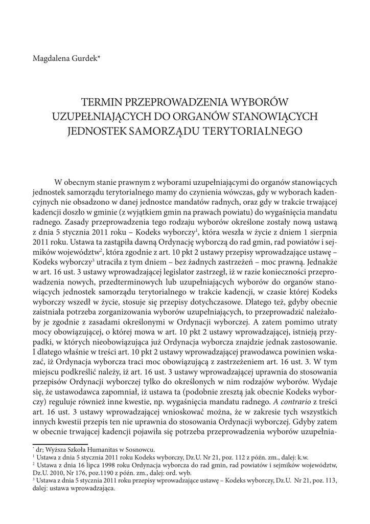 Magdalena Gurdek* TERMIN PRZEPROWADZENIA WYBORÓW UZUPEŁNIAJĄCYCH DO ORGANÓW STANOWIĄCYCH JEDNOSTEK SAMORZĄDU TERYTORIALNEGO W obecnym stanie prawnym z wyborami uzupełniającymi do organów stanowiących jednostek samorządu terytorialnego mamy do czynienia wówczas, gdy w wyborach kadencyjnych nie obsadzono w danej jednostce mandatów radnych, oraz gdy w trakcie trwającej kadencji doszło w gminie (z wyjątkiem gmin na prawach powiatu) do wygaśnięcia mandatu radnego. Zasady przeprowadzenia tego rodzaju wyborów określone zostały nową ustawą z dnia 5 stycznia 2011 roku – Kodeks wyborczy1, która weszła w życie z dniem 1 sierpnia 2011 roku. Ustawa ta zastąpiła dawną Ordynację wyborczą do rad gmin, rad powiatów i sejmików województw2, która zgodnie z art. 10 pkt 2 ustawy przepisy wprowadzające ustawę – Kodeks wyborczy3 utraciła z tym dniem – bez żadnych zastrzeżeń – moc prawną. Jednakże w art. 16 ust. 3 ustawy wprowadzającej legislator zastrzegł, iż w razie konieczności przeprowadzenia nowych, przedterminowych lub uzupełniających wyborów do organów stanowiących jednostek samorządu terytorialnego w trakcie kadencji, w czasie której Kodeks wyborczy wszedł w życie, stosuje się przepisy dotychczasowe. Dlatego też, gdyby obecnie zaistniała potrzeba zorganizowania wyborów uzupełniających, to przeprowadzić należałoby je zgodnie z zasadami określonymi w Ordynacji wyborczej. A zatem pomimo utraty mocy obowiązującej, o której mowa w art. 10 pkt 2 ustawy wprowadzającej, istnieją przypadki, w których nieobowiązująca już Ordynacja wyborcza znajdzie jednak zastosowanie. I dlatego właśnie w treści art. 10 pkt 2 ustawy wprowadzającej prawodawca powinien wskazać, iż Ordynacja wyborcza traci moc obowiązującą z zastrzeżeniem art. 16 ust. 3. W tym miejscu podkreślić należy, iż art. 16 ust. 3 ustawy wprowadzającej uprawnia do stosowania przepisów Ordynacji wyborczej tylko do określonych w nim rodzajów wyborów. Wydaje się, że ustawodawca zapomniał, iż ustawa ta (podobnie zresztą jak obecnie Kodeks wyborczy) reguluje również inne kwestie, np. wygaśnięcia mandatu radnego. A contrario z treści art. 16 ust. 3 ustawy wprowadzającej wnioskować można, że w zakresie tych wszystkich innych kwestii przepis ten nie uprawnia do stosowania Ordynacji wyborczej. Gdyby zatem w obecnie trwającej kadencji pojawiła się potrzeba przeprowadzenia wyborów uzupełniadr; Wyższa Szkoła Humanitas w Sosnowcu. Ustawa z dnia 5 stycznia 2011 roku Kodeks wyborczy, Dz.U. Nr 21, poz. 112 z późn. zm., dalej: k.w. 2 Ustawa z dnia 16 lipca 1998 roku Ordynacja wyborcza do rad gmin, rad powiatów i sejmików województw, Dz.U. 2010, Nr 176, poz.1190 z późn. zm., dalej: ord. wyb. 3 Ustawa z dnia 5 stycznia 2011 roku przepisy wprowadzające ustawę – Kodeks wyborczy, Dz.U. Nr 21, poz. 113, GDOHMXVWDZDZSURZDG]DMąFD * 1 ROCZNIKI ADMINISTRACJI I PRAWA. TEORIA I PRAKTYKA. ROK XII jących, to poprzedzające ją stwierdzenie wygaśnięcia mandatu radnego następowałoby już na podstawie nowych przepisów Kodeksu wyborczego, zaś same wybory przeprowadzić należałoby na zasadach określonych w dawnej Ordynacji wyborczej. Wracając jednak do meritum sprawy, przypomnieć należy, że przepisy Ordynacji wyborczej nieco odmiennie regulowały kwestie związane z wyborami uzupełniającymi. Co prawda, tak samo jak Kodeks wyborczy przewidywały wybory uzupełniające w razie nieobsadzenia w wyborach kadencyjnych mandatów radnych wszystkich jednostek samorządowych, ale inne zasady określały w odniesieniu do wyborów, których przeprowadzenie wiązało się z wygaśnięciem mandatu radnego. Przede wszystkim przewidywały, że w razie wygaśnięcia mandatu radnego w gminie do 20 000 mieszkańców przeprowadza się wybory uzupełniające, zaś w pozostałych gminach, powiatach i województwach w pierwszej kolejności właściwy organ stanowiący zobowiązany był podjąć uchwałę o obsadzeniu wolnego mandatu kolejnym kandydatem z tej samej listy, który w wyborach kadencyjnych uzyskał kolejno największą liczbę głosów, a nie utracił prawa wybieralności. Wybory uzupełniające zaś przeprowadzało się dopiero wówczas, gdy wskutek wygaśnięcia mandatów, których obsadzenie w sposób opisany powyżej nie było możliwe, skład rady zmniejszył się więcej niż o 1/5, chyba że do zakończenia kadencji rady zostało mniej niż 6 miesięcy (art. 194 ust. 3 ord. wyb.). A zatem samo nieobsadzenie wolnego mandatu, w związku z brakiem kandydatów, którzy uzyskali kolejno największą liczbę głosów i mogliby objąć wygaszony mandat, nie przesądzało jeszcze o przeprowadzaniu wyborów uzupełniających. Dopiero bowiem zmniejszenie się składu rady o więcej niż 1/5 rodziło konieczność ich przeprowadzenia4. Obecnie w takim przypadku zamiast wyborów uzupełniających rada zostaje rozwiązana z mocy prawa5 i przeprowadza się wybory nowej rady (art. 387 § 3 k.w.). Z uwagi na różnorodność uregulowań Kodeksu wyborczego i Ordynacji wyborczej konieczne jest – przy analizie tytułowego problemu – prowadzenie rozważań w tym zakresie niejako dwutorowo, w odniesieniu do przepisów Kodeksu wyborczego oraz równolegle w odniesieniu do przepisów Ordynacji wyborczej. OKOLICZNOŚCI UZASADNIAJĄCE PRZEPROWADZENIE WYBORÓW UZUPEŁNIAJĄCYCH Pierwszą z takich okoliczności, zarówno na gruncie Kodeksu wyborczego, jak i Ordynacji wyborczej, jest nieobsadzenie mandatów radnych w wyborach kadencyjnych. Z taWydaje się, że inaczej F. Rymarz, który twierdził: „W przypadku wygaśnięcia mandatu radnego wybranego w okręgu wyborczym dla wyboru rady w gminie liczącej powyżej 20 000 mieszkańców oraz mandatu radnego powiatu lub województwa, gdy wystąpiła wyjątkowa sytuacja braku kandydatów, którzy uzyskali kolejno największą liczbę głosów i mogliby objąć wygaszony mandat, lub jeżeli zaistnieje sytuacja określona w art. 1