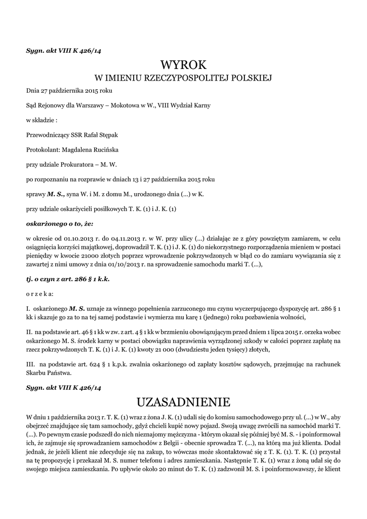 Sygn. akt VIII K 426/14 WYROK W IMIENIU RZECZYPOSPOLITEJ POLSKIEJ Dnia 27 października 2015 roku Sąd Rejonowy dla Warszawy – Mokotowa w W., VIII Wydział Karny w składzie : Przewodniczący SSR Rafał Stępak Protokolant: Magdalena Rucińska przy udziale Prokuratora – M. W. po rozpoznaniu na rozprawie w dniach 13 i 27 października 2015 roku sprawy M. S., syna W. i M. z domu M., urodzonego dnia (...) w K. przy udziale oskarżycieli posiłkowych T. K. (1) i J. K. (1) oskarżonego o to, że: w okresie od 01.10.2013 r. do 04.11.2013 r. w W. przy ulicy (...) działając ze z góry powziętym zamiarem, w celu osiągnięcia korzyści majątkowej, doprowadził T. K. (1) i J. K. (1) do niekorzystnego rozporządzenia mieniem w postaci pieniędzy w kwocie 21000 złotych poprzez wprowadzenie pokrzywdzonych w błąd co do zamiaru wywiązania się z zawartej z nimi umowy z dnia 01/10/2013 r. na sprowadzenie samochodu marki T. (...), tj. o czyn z art. 286 § 1 k.k. o r z e k a: I. oskarżonego M. S. uznaje za winnego popełnienia zarzuconego mu czynu wyczerpującego dyspozycję art. 286 § 1 kk i skazuje go za to na tej samej podstawie i wymierza mu karę 1 (jednego) roku pozbawienia wolności, II. na podstawie art. 46 § 1 kk w zw. z art. 4 § 1 kk w brzmieniu obowiązującym przed dniem 1 lipca 2015 r. orzeka wobec oskarżonego M. S. środek karny w postaci obowiązku naprawienia wyrządzonej szkody w całości poprzez zapłatę na rzecz pokrzywdzonych T. K. (1) i J. K. (1) kwoty 21 000 (dwudziestu jeden tysięcy) złotych, III. na podstawie art. 624 § 1 k.p.k. zwalnia oskarżonego od zapłaty kosztów sądowych, przejmując na rachunek Skarbu Państwa. Sygn. akt VIII K 426/14 UZASADNIENIE W dniu 1 października 2013 r. T. K. (1) wraz z żona J. K. (1) udali się do komisu samochodowego przy ul. (...) w W., aby obejrzeć znajdujące się tam samochody, gdyż chcieli kupić nowy pojazd. Swoją uwagę zwrócili na samochód marki T. (...). Po pewnym czasie podszedł do nich nieznajomy mężczyzna - którym okazał się później być M. S. - i poinformował ich, że zajmuje się sprowadzaniem samochodów z Belgii - obecnie sprowadza T. (...), na którą ma już klienta. Dodał jednak, że jeżeli klient nie zdecyduje się na zakup, to wówczas może skontaktować się z T. K. (1). T. K. (1) przystał na tę propozycję i przekazał M. S. numer telefonu i adres zamieszkania. Następnie T. K. (1) wraz z żoną udał się do swojego miejsca zamieszkania. Po upływie około 20 minut do T. K. (1) zadzwonił M. S. i poinformowawszy, że klient zrezygnował z zakupu pojazdu zapytał, czy są dalej zainteresowani jego nabyciem. Mężczyzna potwierdził. Po upływie około 15 minut M. S. zjawił się w mieszkaniu K.. Pokazał im zdjęcia pojazdu znajdujące się na stronie internetowej po czym J. K. (1) spisała dokument o nazwie "zamówienie – oświadczenie". M. S. własnoręcznie podpisał się i podał swój numer pesel (...). M. S. zobowiązał się sprowadzić samochód marki T. (...) rok produkcji 2008 w ciągu 10 dni, następnie przerejestrować go i dostarczyć K.. Koszt zakupu samochodu został ustalony na kwotę 16500 złotych plus opłaty rejestracyjne, akcyzowe i recyklingowe w łącznej kwocie 2890 złotych. Na poczet umowy J. K. (1) przekazała M. S. zaliczkę w kwocie 3500 złotych, której odbiór pokwitował. Tożsamość M. S. została potwierdzona na podstawie okazanego przez niego dowodu osobistego seria (...) (zeznania T. K. (1) - k. 125, 2v, częściowo J. K. (1) - k. 125, 9v, pismo - k. 4, kserokopia dowodu osobistego - k. 25). W dniu 8 października 2013 r. M. S. skontaktował się telefonicznie z T. K. (1) informując go, że samochód został sprowadzony do Polski i został umieszczony na parkingu w G. wraz z czterema innymi samochodami, za które należy zapłacić podatek VAT w łącznej kwocie 70 000 złotych. Dodał, iż wszyscy pozostali odbiorcy pojazdów wpłacili już zaliczki na podatek i brakowało 10 000 złotych. Małżonkowie zdecydowali, iż przekażą mu tę kwotę. Po jakimś czasie M. S. przyjechał do nich do domu. J. K. (1) wsiadła do jego pojazdu i pojechała wraz z nim do banku (...) S.A. na ul. (...) w W. i wypłaciła z konta kwotę 10 000 złotych, które następnie przekazała S. bez pokwitowania (zeznania T. K. (1) - k. 125, 2v - 3, częściowo J. K. (1) - k. 125, 9v, potwierdzenie wypłaty - k. 5). Po kilku dniach M. S. ponownie zjawił się w domu K. i poinformował ich, że pieniądze na podatek VAT zostały wpłacone i teraz należy czekać. Następnego dnia zadzwonił do J. K. (1) i powiedział, że potrzebuje kwotę 2500 złotych na poczet opłat związanych z przerejestrowaniem pojazdu. Małżonkowie uzgodnili, iż przekażą mu tą kwotę. M. S. udał się do ich miejsca pracy - szpitala na ul. (...) - gdzie kobieta przekazała mu bez pokwitowania kwotę 2 500 złotych (zeznania T. K. (1) - k. 125, 3). Po jakimś czasie M. S. zjawił się w mieszkaniu pod nieobecność T. K. (2) i poinformował, iż potrzebuje jeszcze 5000 złotych na dokonanie końcowych czynności związanych z przerejestrowaniem pojazdu. J. K. (1) posiadała w domu 3000 złotych. Po wypłaceniu z bankomatu brakującej kwoty 2000 złotych przekazała M. S. łącznie 5000 złotych nie biorąc żadnego pokwitowania (zeznania T. K. (1) - k. 125, 3, częściowo J. K. (1) - k. 125, 9v - 10). Po tym czasie M. S. kilkukrotnie kontaktował się z T. K. (1) informując go, iż wszystko jest w porządku i żeby się nie denerwował. Pod koniec października 2013 r. M. S. przyjechał do domu K. i poprosił o kwotę 2500 złotych celem opłacenia opłat skarbowych. T. K. (1) nie przekazał mu pieniędzy twierdząc, że sam dokona tych opłat na co M. S. się nie zgodził. Następnego dnia M. S. zadzwonił do T. K. (1) i poinformował go, że pojazd zostanie przekazany przed dniem 1 listopada. Był to ostatni kontakt telefoniczny z M. S. - po tym czasie po wybraniu jego numeru telefonu