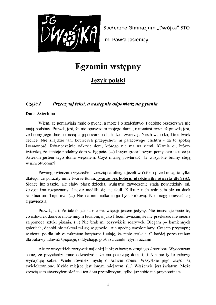 Społeczne Gimnazjum „Dwójka” STO im. Pawła Jasienicy Egzamin wstępny Język polski Część I Przeczytaj tekst, a następnie odpowiedz na pytania. Dom Asteriona Wiem, że pomawiają mnie o pychę, a może i o szaleństwo. Podobne oszczerstwa nie mają podstaw. Prawdą jest, że nie opuszczam mojego domu, natomiast również prawdą jest, że bramy jego dniem i nocą stoją otworem dla ludzi i zwierząt. Niech wchodzi, ktokolwiek zechce. Nie znajdzie tam kobiecych przepychów ni pałacowego blichtru - za to spokój i samotność. Równocześnie odkryje dom, którego nie ma na ziemi. Kłamią ci, którzy twierdzą, że istnieje podobny dom w Egipcie. (...) Innym groteskowym pomysłem jest, że ja Asterion jestem tego domu więźniem. Czyż muszę powtarzać, że wszystkie bramy stoją w nim otworem? Pewnego wieczoru wyszedłem zresztą na ulicę, a jeżeli wróciłem przed nocą, to tylko dlatego, że poraziły mnie twarze tłumu, twarze bez koloru, płaskie niby otwarta dłoń (A). Słońce już zaszło, ale słaby płacz dziecka, wulgarne zawodzenie stada powiedziały mi, że zostałem rozpoznany. Ludzie modlili się, uciekali. Kilku z nich wdrapało się na dach sanktuarium Toporów. (...) Nie darmo matka moja była królową. Nie mogę mieszać się z gawiedzią. Prawdą jest, że takich jak ja nie ma więcej: jestem jedyny. Nie interesuje mnie to, co człowiek donieść może innym ludziom, a jako filozof uważam, że nic przekazać nie można za pomocą sztuki pisania. (...) Nie brak mi oczywiście rozrywek. Biegam po kamiennych galeriach, dopóki nie zakręci mi się w głowie i nie upadnę oszołomiony. Czasem przycupnę w cieniu poidła lub za zakrętem korytarza i udaję, że mnie szukają. O każdej porze umiem dla zabawy udawać śpiącego, oddychając głośno z zamkniętymi oczami. Ale ze wszystkich rozrywek najlepiej lubię zabawę w drugiego Asteriona. Wyobrażam sobie, że przychodzi mnie odwiedzić i że mu pokazuję dom. (...) Ale nie tylko zabawy wynajduję sobie. Wiele również myślę o samym domu. Wszystkie jego części są zwielokrotnione. Każde miejsce jest innym miejscem. (...) Właściwie jest światem. Może zresztą sam stworzyłem słońce i ten dom przeolbrzymi, tylko już sobie nie przypominam. 1 Co dziewięć lat nawiedza dom dziewięciu ludzi, ażebym ich uwolnił od wszelkiego zła. Słyszę ich głosy i wesoło biegnę na ich spotkanie. Ceremonia trwa krótko: padają jeden za drugim. (...) Nie wiem, kim są, wiem tylko, że jeden z nich przepowiedział mi w godzinie śmierci, że kiedyś przyjdzie mój wybawiciel. Od tego czasu nie boli mnie już samotność (B), bo wiem, że istnieje ktoś, kto mnie wyzwoli. Gdyby moje uszy mogły słyszeć wszystkie odgłosy świata, dosłyszałyby jego odgłosy. (...) Jaki będzie mój wybawiciel? - zastanawiam się czasami. Będzie to byk czy też człowiek? A może będzie taki jak ja? Poranne słońce zalśniło na szpadzie z brązu. Nie było już ani śladu krwi. "Czy uwierzyłabyś, Ariadno? - powiedział Tezeusz - Minotaur prawie się nie bronił. J. L. Borges, Dom Asteriona [w:] Opowiadania, przeł. Z. Chądzyńska, Kraków 1978. Pytania do tekstu 1. Do jakiej mitologicznej historii odnosi się opowiadanie "Dom Asteriona"? Uzasadnij swoją odpowiedź. ………………………………………………………………………………………………….. ………………………………………………………………………………………………….. ………………………………………………………………………………………………….. 2. Wymień dwa miejsca, w których rozgrywa się akcja opowiadania. ………………………………………………………………………………………………….. ………………………………………………………………………………………………….. 3. Wymień 3 najważniejsze cechy bohatera opowiadania. ………………………………………………………………………………………………….. ………………………………………………………………………………………………….. 4. W jednym z akapitów bohater mów: "Jestem jedyny". Wytłumacz, jak rozumiesz te słowa. ………………………………………………………………………………………………….. ………………………………………………………………………………………………….. ………………………………………………………………………………………………….. 5. Wyjaśnij, dlaczego bohater najbardziej lubi zabawę w drugiego Asteriona. ………………………………………………………………………………………………….. ………………………………………………………………………………………………….. ………………………………………………………………………………………………….. 2 6.Wyjaśnij, na co i dlaczego czeka Asterion. ………………………………………………………………………………………………….. ………………………………………………………………………………………………….. ………………………………………………………………………………………………….. 7. Wytłumacz, co może oznaczać imię bohatera? ………………………………………………………………………………………………….. 8. Kim Twoim zdaniem jest bohater tej historii? ………………………………………………………………………………………………….. ………………………………………………………………………………………………….. 9. Podaj, kto opowiada zaprezentowaną historię. ……………………………………