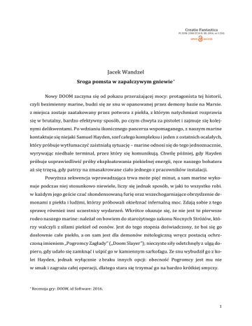 Creatio Fantastica PL ISSN: 2300-2514 R. XII, 2016, nr 3 (54) Jacek Wandzel Sroga pomsta w zapalczywym gniewie ∗ Nowy DOOM zaczyna się od pokazu przerażającej mocy: protagonista tej historii, czyli bezimienny marine, budzi się ze snu w opanowanej przez demony bazie na Marsie. z miejsca zostaje zaatakowany przez potwora z piekła, z którym natychmiast rozprawia się w brutalny, bardzo efektywny sposób, po czym chwyta za pistolet i zajmuje się kolejnymi delikwentami. Po wdzianiu ikonicznego pancerza wspomaganego, z naszym marine kontaktuje się niejaki Samuel Hayden, szef całego kompleksu i jeden z ostatnich ocalałych, który próbuje wytłumaczyć zaistniałą sytuację – marine odnosi się do tego jednoznacznie, wyrywając niedbale terminal, przez który się komunikują. Chwilę później, gdy Hayden próbuje usprawiedliwić próby eksploatowania piekielnej energii, ręce naszego bohatera aż się trzęsą, gdy patrzy na zmasakrowane ciało jednego z pracowników instalacji. Powyższa sekwencja wprowadzająca trwa może pięć minut, a sam marine wyko- nuje podczas niej stosunkowo niewiele, liczy się jednak sposób, w jaki to wszystko robi. w każdym jego geście czuć skondensowaną furię oraz wszechogarniające obrzydzenie de- monami z piekła i ludźmi, którzy próbowali okiełznać infernalną moc. Zdają sobie z tego sprawę również inni uczestnicy wydarzeń. Wkrótce okazuje się, że nie jest to pierwsze rodeo naszego marine: należał on bowiem do starożytnego zakonu Nocnych Stróżów, któ- rzy walczyli z siłami piekieł od eonów. Jest do tego stopnia doświadczony, że boi się go dosłownie całe piekło, a on sam jest dla demonów mitologiczną wręcz postacią ochrzczoną imieniem „Pogromcy Zagłady” („Doom Slayer”); nieczyste siły odetchnęły z ulgą do- piero, gdy udało się zamknąć i uśpić go w kamiennym sarkofagu. Ze snu wybudził go z ko- lei Hayden, jednak wyłącznie z braku innych opcji: obecność Pogromcy jest mu nie w smak i zagraża całej operacji, dlatego stara się trzymać go na bardzo krótkiej smyczy. ∗ Recenzja gry: DOOM, id Software: 2016. 1 Zwykle, gdy mamy do czynienia z historiami o człowieku, który staje wobec niepo- jętych mocy, ludzkość jest stosunkowo bezradna. Horror lovecraftowski stawia nasz gatunek w pozycji absolutnie beznadziejnej: jesteśmy ćmami przy potędze przedwiecznych istot, a zgłębianie tajemnic świata prowadzi jedynie do obłędu, upadku i śmierci. Dobitnie eksponują to m.in. gry będące częścią nowej fali horroru ostatnich lat, takie jak Slender, Amnesia: The Dark Descent czy Outlast – gracz jest w nich nawet całkowicie bezbronny i może tylko uciekać, a i tak finał jego historii okazuje się być raczej dołujący. Owa bezrad- ność przewija się również w nieco lżejszych gatunkowo historiach zawierających w sobie niepojęte siły, jak antyczne rasy kosmitów. w nich ludzkość walczy, ale z pozycji chłopców do bicia lub potencjalnych czarnych koni; wiecznie na granicy porażki, często wyrywając resztkami sił zwycięstwo, nierzadko zresztą pyrrusowe. Dobrym przykładem byłyby ostatnie wielkie serie studia BioWare, Dragon Age i Mass Effect. Świat ludzi ostatecznie triumfuje w walce przeciw okrutnym bogom lub „bogom” czy żywym, kałamarnico-po2 dobnym statkom, ale te zwycięstwa zawsze mają w sobie sporo dziegciu. Tytuły te zmuszają do poświęceń i ponoszenia konsekwencji, często każąc się zastanowić, czy w ogóle było warto. Dominują więc w tej gestii fantazje o porażce, albo chociaż o wydarciu zwycięstwa w ostatniej chwili. Niewiele gier daje szansę, żeby wcielić się właśnie w niepowstrzymaną siłę, której triumf jest wyłącznie kwestią czasu i hektolitrów rozpaczy pozostawianej na jej drodze. Kogoś, kto traktuje Piekło jako przystanek w swojej krwawej podróży, a nie ostateczny cel. W końcu protagonistą historii o starciu człowieka z niezrozumiałymi, złymi siłami potężniejszymi od niego nie jest bezbronna ofiara czy everyman, który próbuje stanąć na wysokości rozpaczliwego zadania. w najnowszym DOOMie wcielamy się w oszalałą Godzillę, którą ludzkość wypuściła, by pozbyć się innego zagrożenia; w seryjnego mordercę ro- dem ze slashera, który wraca już po raz kolejny. Tyle tylko, że ów psychopata jest postacią niewątpliwie pozytywną – okrutną, brutalną i gniewną, ale niewątpliwie dobrą. 3 id Software udało się stworzyć chyba najlepszego niemego protagonistę w grach wideo. Na papierze, Pogromca być może nie należy do najambitniejszych kreacji – facet jest niesamowicie wściekły i naprawdę nienawidzi demonów – jednak twórcom udało się minimalnymi środkami subtelnie i precyzyjnie zarysować tego bohatera. Jedna z głów- nych mechanik tytułu pozwala graczowi dokonywać brutalnych egzekucji przeciwników w zamian za regenerację zdrowia; motyw ten został otwarcie zainspirowany popularnym modem do klasycznych części serii, Brutal Doom. Brutalizowanie przeciwników może kojarzyć się z serią Mortal Kombat, gdzie dokonywane egzekucje są szalenie kreatywne i wy- soce niepraktyczne – w przypadku DOOMa uwagę zwraca precyzja, z jaką marine eliminuje przeciwników. „Finishery” są, owszem, szalenie brutalne, ale Pogromca jest w swoim morderczym szale przede wszystkim w y d a j n y : łamie karki, wyrywa ręce, zgniata czaszki z chirurgiczną precyzją, zdradzając w ten sposób nie tylko swoje pokaźne doświad- czenie, ale również podkreślając, jak bardzo się tymi demonami brzydzi. Nie są to stworzenia warte jego uwagi ponad moment, w którym je eliminuje; z kolei mignięcia autentycznej paniki na diabelskich gębach pokazują, kto tutaj jest oprawcą. w innej scenie Hayden tłumaczy protagoniście, w jaki sposób powyciągać kanistry z piekielną energią, by nie naruszyć instalacji i jak ważnym jest, żeby postępować delikatnie i nie wysłać ludzko