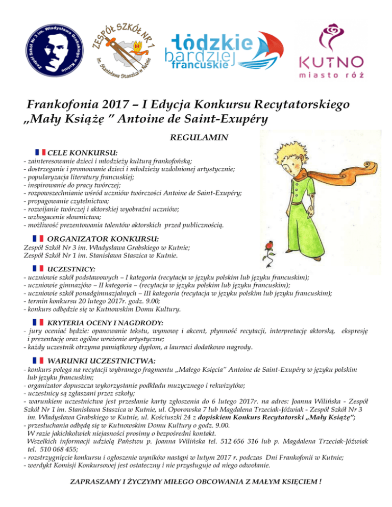 Frankofonia 2017 – I Edycja Konkursu Recytatorskiego „Mały Książę ” Antoine de Saint-Exupéry REGULAMIN CELE KONKURSU: - zainteresowanie dzieci i młodzieży kulturą frankofońską; - dostrzeganie i promowanie dzieci i młodzieży uzdolnionej artystycznie; - popularyzacja literatury francuskiej; - inspirowanie do pracy twórczej; - rozpowszechnianie wśród uczniów twórczości Antoine de Saint-Exupéry; - propagowanie czytelnictwa; - rozwijanie twórczej i aktorskiej wyobraźni uczniów; - wzbogacenie słownictwa; - możliwość prezentowania talentów aktorskich przed publicznością. ORGANIZATOR KONKURSU: Zespół Szkół Nr 3 im. Władysława Grabskiego w Kutnie; Zespół Szkół Nr 1 im. Stanisława Staszica w Kutnie. UCZESTNICY: - uczniowie szkół podstawowych – I kategoria (recytacja w języku polskim lub języku francuskim); - uczniowie gimnazjów – II kategoria – (recytacja w języku polskim lub języku francuskim); - uczniowie szkół ponadgimnazjalnych – III kategoria (recytacja w języku polskim lub języku francuskim); - termin konkursu 20 lutego 2017r. godz. 9.00; - konkurs odbędzie się w Kutnowskim Domu Kultury. KRYTERIA OCENY I NAGDRODY: - jury oceniać będzie: opanowanie tekstu, wymowę i akcent, płynność recytacji, interpretację aktorską, ekspresję i prezentację oraz ogólne wrażenie artystyczne; - każdy uczestnik otrzyma pamiątkowy dyplom, a laureaci dodatkowo nagrody. WARUNKI UCZESTNICTWA: - konkurs polega na recytacji wybranego fragmentu „Małego Księcia” Antoine de Saint-Exupéry w języku polskim lub języku francuskim; - organizator dopuszcza wykorzystanie podkładu muzycznego i rekwizytów; - uczestnicy są zgłaszani przez szkoły; - warunkiem uczestnictwa jest przesłanie karty zgłoszenia do 6 lutego 2017r. na adres: Joanna Wilińska - Zespół Szkół Nr 1 im. Stanisława Staszica w Kutnie, ul. Oporowska 7 lub Magdalena Trzeciak-Jóźwiak - Zespół Szkół Nr 3 im. Władysława Grabskiego w Kutnie, ul. Kościuszki 24 z dopiskiem Konkurs Recytatorski „Mały Książę”; - przesłuchania odbędą się w Kutnowskim Domu Kultury o godz. 9.00. W razie jakichkolwiek niejasności prosimy o bezpośredni kontakt. Wszelkich informacji udzielą Państwu p. Joanna Wilińska tel. 512 656 316 lub p. Magdalena Trzeciak-Jóźwiak tel. 510 068 455; - rozstrzygnięcie konkursu i ogłoszenie wyników nastąpi w lutym 2017 r. podczas Dni Frankofonii w Kutnie; - werdykt Komisji Konkursowej jest ostateczny i nie przysługuje od niego odwołanie. ZAPRASZAMY I ŻYCZYMY MIŁEGO OBCOWANIA Z MAŁYM KSIĘCIEM ! FORMULARZ UCZESTNICTWA W KONKURSIE RECYTATORSKIM PEŁNA NAZWA SZKOŁY: ADRES: TELEFON: UCZESTNICY: IMIĘ I NAZWISKO: DATA URODZENIA: KATEGORIA WIEKOWA (SZKOŁA PODSTAWOWA, GIMNAZJUM, SZKOŁA PONADGIMNAZJALNA - WŁAŚCIWE ZAKREŚLIĆ). CZAS WYSTĘPU (3, 5, 8, 10 MINUT – WŁAŚCIWE ZAKREŚLIĆ). IMIĘ I NAZWISKO: DATA URODZENIA: KATEGORIA WIEKOWA (SZKOŁA PODSTAWOWA, GIMNAZJUM, SZKOŁA PONADGIMNAZJALNA - WŁAŚCIWE ZAKREŚLIĆ). CZAS WYSTĘPU (3, 5, 8, 10 MINUT – WŁAŚCIWE ZAKREŚLIĆ). IMIĘ I NAZWISKO: DATA URODZENIA: KATEGORIA WIEKOWA (SZKOŁA PODSTAWOWA, GIMNAZJUM, SZKOŁA PONADGIMNAZJALNA - WŁAŚCIWE ZAKREŚLIĆ). CZAS WYSTĘPU (3, 5, 8, 10 MINUT – WŁAŚCIWE ZAKREŚLIĆ). OPIEKUNOWIE UCZESTNIKÓW: IMIĘ I NAZWISKO: TELEFON: