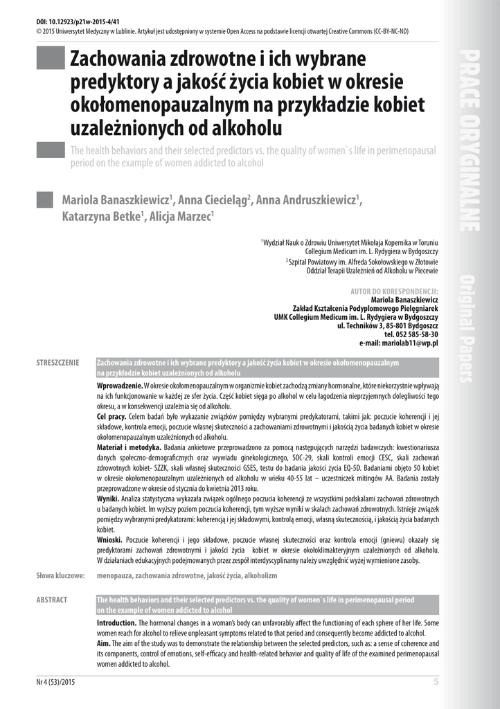 DOI: 10.12923/p21w-2015-4/41 © 2015 Uniwersytet Medyczny w Lublinie. Artykuł jest udostępniony w systemie Open Access na podstawie licencji otwartej Creative Commons (CC-BY-NC-ND) Zachowania zdrowotne i ich wybrane predyktory a jakość życia kobiet w okresie okołomenopauzalnym na przykładzie kobiet uzależnionych od alkoholu The health behaviors and their selected predictors vs. the quality of women`s life in perimenopausal period on the example of women addicted to alcohol Mariola Banaszkiewicz1, Anna Ciecieląg2, Anna Andruszkiewicz1, Katarzyna Betke1, Alicja Marzec1 1 Wydział Nauk o Zdrowiu Uniwersytet Mikołaja Kopernika w Toruniu Collegium Medicum im. L. Rydygiera w Bydgoszczy 2 Szpital Powiatowy im. Alfreda Sokołowskiego w Złotowie Oddział Terapii Uzależnień od Alkoholu w Piecewie AUTOR DO KORESPONDENCJI: Mariola Banaszkiewicz Zakład Kształcenia Podyplomowego Pielęgniarek UMK Collegium Medicum im. L. Rydygiera w Bydgoszczy ul. Techników 3, 85-801 Bydgoszcz tel. 052 585-58-30 e-mail: [email protected] STRESZCZENIE Zachowania zdrowotne i ich wybrane predyktory a jakość życia kobiet w okresie okołomenopauzalnym na przykładzie kobiet uzależnionych od alkoholu Wprowadzenie. W okresie okołomenopauzalnym w organizmie kobiet zachodzą zmiany hormonalne, które niekorzystnie wpływają na ich funkcjonowanie w każdej ze sfer życia. Część kobiet sięga po alkohol w celu łagodzenia nieprzyjemnych dolegliwości tego okresu, a w konsekwencji uzależnia się od alkoholu. Cel pracy. Celem badań było wykazanie związków pomiędzy wybranymi predykatorami, takimi jak: poczucie koherencji i jej składowe, kontrola emocji, poczucie własnej skuteczności a zachowaniami zdrowotnymi i jakością życia badanych kobiet w okresie okołomenopauzalnym uzależnionych od alkoholu. Materiał i metodyka. Badania ankietowe przeprowadzono za pomocą następujących narzędzi badawczych: kwestionariusza danych społeczno-demograficznych oraz wywiadu ginekologicznego, SOC-29, skali kontroli emocji CESC, skali zachowań zdrowotnych kobiet- SZZK, skali własnej skuteczności GSES, testu do badania jakości życia EQ-5D. Badaniami objęto 50 kobiet w okresie okołomenopauzalnym uzależnionych od alkoholu w wieku 40-55 lat – uczestniczek mitingów AA. Badania zostały przeprowadzone w okresie od stycznia do kwietnia 2013 roku. Wyniki. Analiza statystyczna wykazała związek ogólnego poczucia koherencji ze wszystkimi podskalami zachowań zdrowotnych u badanych kobiet. Im wyższy poziom poczucia koherencji, tym wyższe wyniki w skalach zachowań zdrowotnych. Istnieje związek pomiędzy wybranymi predykatorami: koherencją i jej składowymi, kontrolą emocji, własną skutecznością, i jakością życia badanych kobiet. Wnioski. Poczucie koherencji i jego składowe, poczucie własnej skuteczności oraz kontrola emocji (gniewu) okazały się predyktorami zachowań zdrowotnymi i jakości życia kobiet w okresie okołoklimakteryjnym uzależnionych od alkoholu. W działaniach edukacyjnych podejmowanych przez zespół interdyscyplinarny należy uwzględnić wyżej wymienione zasoby. Słowa kluczowe: menopauza, zachowania zdrowotne, jakość życia, alkoholizm ABSTRACT The health behaviors and their selected predictors vs. the quality of women`s life in perimenopausal period on the example of women addicted to alcohol Introduction. The hormonal changes in a woman’s body can unfavorably affect the functioning of each sphere of her life. Some women reach for alcohol to relieve unpleasant symptoms related to that period and consequently become addicted to alcohol. Aim. The aim of the study was to demonstrate the relationship between the selected predictors, such as: a sense of coherence and its components, control of emotions, self-efficacy and health-related behavior and quality of life of the examined perimenopausal women addicted to alcohol. Nr 4 (53)/2015 5 Zachowania zdrowotne a jakość życia kobiet w okresie okołomenopauzalnym uzależnionych od alkoholu Material and methods. The study was conducted using the following survey research tools: a Sense of Coherence-Orientation to Life Questionnaire (SOC-29), and gynecological history, Courtland Emotional Control Scale (CESC), health behavior scale for women (SZZK), Generalized Self-Efficacy Scale (GSES), a standardized test of the quality of life (EQ-5D). The study involved 50 perimenopausal women with alcohol dependence aged 40-55 years – the participants of the AA meetings. The study was conducted throughout January-April 2013. Results. Statistical analysis showed the relationship between an overall sense of coherence with all subscales of health behaviors in the examined women. The higher level of sense of coherence, the higher scores on the scales of health behaviors. The analysis of the results showed the relationship between selected predictors of coherence and its components, control of emotions, self-efficacy and quality of life of the respondents. Conclusion. Sense of coherence and its components, self-efficacy and control of emotions (anger) proved to be the predictors of health behavior and quality of life of perimenopausal women addicted to alcohol. In the educational activities undertaken by an interdisciplinary team, the above-mentioned resources should be taken into account. Key words: menopause, health behaviors, quality of life, alcoholism WPROWADZENIE Zmiany hormonalne zachodzące w organizmie kobiety w okresie okołomenopauzalnym, niekorzystnie wpływają na funkcjonowanie w każdej ze sfer życia. Kobiety często nie mogąc poradzić sobie z problemami tego okresu szukają różnych sposobów radzenia sobie. Jednym z nich staje się picie alkoholu. Doniesienia literaturowe wskazują, iż do placówek uzależnienia od alkoholu zgłasza się coraz więcej kobiet w okresie okołomenopauzalnym [1]. Okres okołomenopauzalny w życiu kobiety wiąże się z szeregiem zmian, które mają ogromne znaczenie dla jej samopoczuci