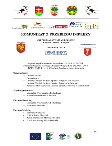 KOMUNIKAT Z PRZEBIEGU IMPREZY XXI PÓŁMARATONU MLECZNEGO Korycin - Janów - Korycin Patronat Honorowy 10 czerwca 2012 r. Marszałek Województwa Podlaskiego PATRONAT HONOROWY WOJEWODA PODLASKI Impreza współfinansowana ze środków UE, Oś 4 – LEADER w ramach Programu Rozwoju Obszarów Wiejskich na lata 2007 – 2013 DZIAŁANIE 4.1/413 Wdrażanie lokalnych strategii rozwoju Organizatorzy: Gmina Korycin Gmina Janów Gminny Ośrodek Kultury, Sportu i Turystyki w Korycinie Gminny Ośrodek Kultury, Sportu i Turystyki w Janowie Podlaskie Stowarzyszenie Ludowe Zespoły Sportowe w Białymstoku Współorganizatorzy: Marszałek Województwa Podlaskiego Starostwo Powiatowe w Sokółce Patronat Honorowy: Marszałek Województwa Podlaskiego Wojewoda Podlaski Patronat Medialny: Telewizja Białystok Polskie Radio Białystok Portal internetowy Maratony Polskie Portal internetowy Wrota Podlasia str. 1 Patronat prasowy: Wielkopolskie Wydawnictwo Rolnicze Ogólnopolskie Czasopismo Specjalistyczne „BYDŁO” Stowarzyszenia, instytucje i osoby wspierające: Marszałek Województwa Podlaskiego Bank Spółdzielczy w Sokółce Piekarnia „REVMOD” w Mońkach Przedsiębiorstwo Handlowo Usługowe Konar w Skindzierzu Gospodarstwo Ogrodnicze w Białousach - Jerzy Wilczewski Zespół Szkół w Korycinie Przedszkole im. Jana Pawła II w Korycinie Zespół Szkół Samorządowych w Janowie Ochotnicza Straż Pożarna w Korycinie Ochotnicza Straż Pożarna w Janowie POLICJA Bieg główny: Dystans - 21 097,5 m Trasa Korycin - Jasionowa Dolina(Gmina Janów) - Korycin z atestem PZLA (Podlaski Związek Lekkiej Atletyki) Sędzia główny: Roman Ostapczuk ( może się zmienić – będzie wiadomo w dniu imprezy) Nagroda główna - ŻYWA KROWA OTWARCIE IMPREZY, START: Teren rekreacyjny na zalewem w Korycinie PÓŁMETEK - Jasionowa Dolina ( Gmina Janów) META - nad zalewem w Korycinie - droga powiatowa Nr 1318B ( KorycinZakale) DEKORACJA ZWYCIĘŻCÓW - Scena nad zalewem w Korycinie W biegu głównym zarejestrowało się 171 zawodników z Polski, Białorusi, Ukrainy, Litwy i Rosji. To rekordowa liczba uczestników naszej imprezy w ciągu jej 19 edycji. Dla organizatorów to potwierdzenie, że impreza się rozwija, zyskuje uznanie wśród zawodników i jest rozpoznawalna w różnych zakątkach kraju i za zagranicą, co bardzo cieszy organizatorów. Po raz pierwszy w historii Półmaratonu Mlecznego została zmieniona trasa biegu głównego, która rozpoczynała się w Korycinie przy ternach rekreacyjnych nad zalewem natomiast półmetek był w Jasionowej Dolinie. Wśród zawodników z trasą Półmaratonu Mlecznego zmierzyło się 10 zawodników na wózkach inwalidzkich (8 mężczyzn i 3 kobiety) i 6 biegaczy niepełnosprawnych z innymi dysfunkcjami. Drugi raz z rzędu zwycięzcą biegu głównego został Tsetserukou Ihar ukończył bieg z czasem 1:11.11. Nagrodę główną w naturze, którą była młoda, rasowa, krowa, zamienił na zryczałtowaną nagrodę pieniężną w wysokości 1 500 zł. Za miejsca I – VI w każdej kategorii zawodnicy otrzymali nagrody pieniężne. Wszyscy zawodnicy, którzy ukończyli bieg zostali osobiście udekorowani, otrzymali pamiątkowe medale, dyplomy i posiłek regeneracyjny oraz zaproszenie na piknik w plenerze przy pieczonym baranie. Wśród zawodników rozlosowano również liczne nagrody rzeczowe. str. 2 Zawodnikom sprzyjała również pogoda, wielu z nich pobiło własne rekordy. Jak co roku imprezie towarzyszą integracyjne biegi dzieci i młodzieży, które organizowane są na półmetku biegu głównego w Janowie. 1. Dodatkowe atrakcje : "PCK - Podlasie TOUR" - bieg organizowany przez Podlaski Oddział Okręgowy Polskiego Czerwonego Krzyża wspólnie z Półmaratonem Mlecznym, dodatkowo na scenie zaprezentują pokaz resuscytacji. Turniej wiedzy o Półmaratonie Mlecznym Korycin - Janów - Korycin z nagrodami Występ Zespołu Mażoretkowego "TAKT" z Jasionówki Koncert dziecięcego zespołu wokalnego z GOKSiT w Korycinie - instruktor Małgorzata Trojanowska Prezentacje taneczne zespołów tańca tańca towarzyskiego w Korycinie instruktor Izabela Słomka - Łabanowska Prezentacje artystyczne : Zespół Mażoretkowy "TAKT" z Jasionówki Dziewczęta prowadzi Pani Maria Gierasimiuk. Mażoretki najczęściej występują z Młodzieżową Orkiestrą Dętą z Jasionówki TANIEC TOWARZYSKI Klub tańca towarzyskiego „PRESTIGRE” : Instruktor grupy i prezes klubu Pani Izabela Słomka Łabanowska Zajęcia tańca towarzyskiego w GOKSiT odbywają się od X.2009 r. w dwóch grupach wiekowych 5- 11 lat i 12 – 15 lat. Zajęcia prowadzą instruktorzy Klubu tańca towarzyskiego „PRESTIGE” Tancerze tańczą w kategorii tańca rekreacyjnego wykonają różne układy taneczne i mają już osiągnięcia. Dziś zaprezentują się tancerze ze starszej grupy GRUPA WOKALNA działająca przy GOKSiT w Korycinie Grupa wokalna pracuje pod kierunkiem muzycznym Małgorzaty Trojanowskiej Dziewczęta uczestniczą w przeglądach i festiwalach wokalnych i otrzymują liczne nagrody i wyróżnienia za zajęte miejsca oraz wyróżnienia. str. 3