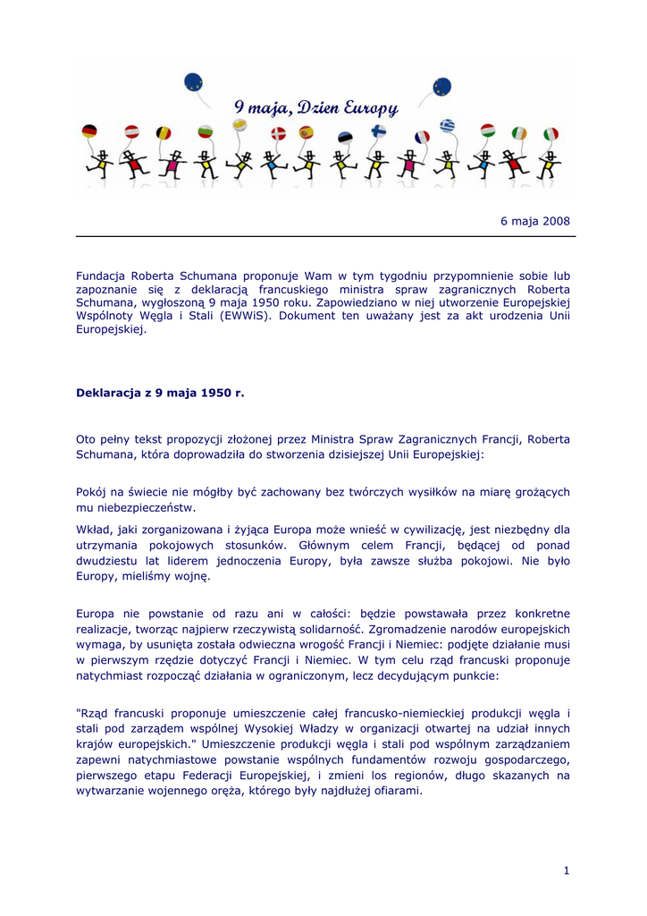 6 maja 2008 Fundacja Roberta Schumana proponuje Wam w tym tygodniu przypomnienie sobie lub zapoznanie się z deklaracją francuskiego ministra spraw zagranicznych Roberta Schumana, wygłoszoną 9 maja 1950 roku. Zapowiedziano w niej utworzenie Europejskiej Wspólnoty Węgla i Stali (EWWiS). Dokument ten uważany jest za akt urodzenia Unii Europejskiej. Deklaracja z 9 maja 1950 r. Oto pełny tekst propozycji złożonej przez Ministra Spraw Zagranicznych Francji, Roberta Schumana, która doprowadziła do stworzenia dzisiejszej Unii Europejskiej: Pokój na świecie nie mógłby być zachowany bez twórczych wysiłków na miarę grożących mu niebezpieczeństw. Wkład, jaki zorganizowana i żyjąca Europa może wnieść w cywilizację, jest niezbędny dla utrzymania pokojowych stosunków. Głównym celem Francji, będącej od ponad dwudziestu lat liderem jednoczenia Europy, była zawsze służba pokojowi. Nie było Europy, mieliśmy wojnę. Europa nie powstanie od razu ani w całości: będzie powstawała przez konkretne realizacje, tworząc najpierw rzeczywistą solidarność. Zgromadzenie narodów europejskich wymaga, by usunięta została odwieczna wrogość Francji i Niemiec: podjęte działanie musi w pierwszym rzędzie dotyczyć Francji i Niemiec. W tym celu rząd francuski proponuje natychmiast rozpocząć działania w ograniczonym, lecz decydującym punkcie: "Rząd francuski proponuje umieszczenie całej francusko-niemieckiej produkcji węgla i stali pod zarządem wspólnej Wysokiej Władzy w organizacji otwartej na udział innych krajów europejskich." Umieszczenie produkcji węgla i stali pod wspólnym zarządzaniem zapewni natychmiastowe powstanie wspólnych fundamentów rozwoju gospodarczego, pierwszego etapu Federacji Europejskiej, i zmieni los regionów, długo skazanych na wytwarzanie wojennego oręża, którego były najdłużej ofiarami. 1 Solidarność produkcji, która się w ten sposób nawiąże, ukaże, że wszelka wojna między Francją a Niemcami jest nie tylko nie do pomyślenia, ale i fizycznie niemożliwa. Powstanie tej potężnej jednostki produkcyjnej otwartej na wszelkie kraje, które zechcą w niej uczestniczyć, mogącej dostarczyć wszystkim krajom, które złączy, podstawowych elementów produkcji przemysłowej na takich samych warunkach, stworzy rzeczywiste fundamenty ich ekonomicznego zjednoczenia. Ta produkcja oferowana będzie całemu światu bez różnicy i wyjątków, aby przyczynić się do podniesienia poziomu życia i do rozwoju dzieł pokojowych. [...] W ten sposób, prosto i szybko, dokona się fuzja interesów niezbędna do założenia wspólnoty gospodarczej i wprowadzony zostanie zaczyn szerszej i głębszej wspólnoty krajów przez długi czas podzielonych krwawymi konfliktami. Przez umieszczenie podstawowej produkcji pod wspólnym zarządem i instytucję nowej Wysokiej Władzy, której decyzję zwiążą Francję, Niemcy i kraje, które do niej przystąpią, ta propozycja stanie się pierwszą konkretną podstawą Federacji Europejskiej, niezbędnej dla zachowania pokoju. Aby kontynuować realizację tak nakreślonych celów, rząd francuski gotowy jest na przystąpienie do negocjacji na następujących podstawach. Zadaniem należącym do Wysokiej Władzy będzie zapewnienie, możliwie jak najszybciej, modernizacji produkcji i poprawy jej jakości; dostarczenie węgla i stali na rynek francuski i niemiecki oraz państw przystępujących do nich na identycznych warunkach; rozwój wspólnego eksportu na inne kraje; wyrównanie postępu warunków życia robotników tych gałęzi produkcji. Aby osiągnąć te cele, wychodząc od bardzo zróżnicowanych warunków, w jakich odbywa się obecnie produkcja w różnych krajach przystępujących, konieczne będzie czasowe wprowadzenie pewnych rozporządzeń, zawierające zastosowanie planu produkcji i inwestycji, wprowadzenie mechanizmów wyrównywania cen, utworzenie funduszu przekształceniowego, pozwalającego na racjonalizację produkcji. Przepływ węgla i stali między krajami przystępującymi zostanie natychmiast uwolniony od jakichkolwiek opłat celnych i nie będzie mógł być obciążony żadnymi opłatami transportowymi. Stopniowo powstaną warunki zapewniające spontaniczne najbardziej racjonalne rozmieszczenie produkcji na najwyższym poziomie wydajności. W przeciwieństwie do międzynarodowego kartelu, dążącego do podziału i eksploatacji rynków państwowych przez stosowanie restrykcyjnych praktyk i utrzymanie wysokich zysków, planowana organizacja zapewni fuzję rynków i wzrost produkcji. Najważniejsze zasady i zobowiązania określone wyżej będą stanowić przedmiot traktatu sygnowanego przez państwa. Negocjacje konieczne dla określenia sposobów ich realizacji 2 będą prowadzone z udziałem arbitra wyznaczonego za wspólną zgodą. Jego zadaniem będzie czuwanie nad tym, by porozumienie było zgodne z zasadami, a w razie niepokonalnego sporu, wskaże rozstrzygnięcie, które zostanie przyjęte. Wspólna Wysoka Władza, odpowiedzialna za funkcjonowanie całego systemu, będzie się składać z niezależnych osobistości wyznaczonych przez rządy na podstawie parytetu; rządy za wspólną zgodą wybiorą jej przewodniczącego; jej decyzje będą wiążące we Francji, Niemczech i innych krajach przystępujących. Właściwe rozporządzenia zapewnią konieczne sposoby odwoływania się od decyzji Wysokiej Władzy. Przedstawiciel Narodów Zjednoczonych przy tej organizacji będzie odpowiedzialny za sporządzanie dwa razy w roku publicznego raportu ONZ, ukazującego funkcjonowanie nowego organizmu, zwłaszcza w tym, co dotyczy strzeżenia jej pokojowych celów. Powołanie Wysokiej Władzy w niczym nie przesądza o własności przedsiębiorstw. W sprawowaniu swojej misji wspólna Wysoka Władza będzie liczyła się z uprawnieniami przyznanymi międzynarodowym władzom Zagłębia Ruhry i wszelkiej natury zobowiązaniami nałożonymi na Niemcy tak długo, jak będą one trwać
