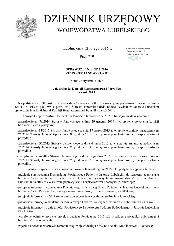 DZIENNIK URZĘDOWY WOJEWÓDZTWA LUBELSKIEGO Lublin, dnia 12 lutego 2016 r. Elektronicznie podpisany przez: Cezary Widomski; LUW Poz. 719 Data: 2016-02-12 07:42:14 SPRAWOZDANIE NR 1/2016 STAROSTY JANOWSKIEGO z dnia 28 stycznia 2016 r. z działalności Komisji Bezpieczeństwa i Porządku za rok 2015 Na podstawie art. 38b ust. 3 ustawy z dnia 5 czerwca 1998 r. o samorządzie powiatowym (tekst jednolity Dz. U. z 2013 r. poz. 595 z późn. zm.) Starosta Janowski składa Radzie Powiatu w Janowie Lubelskim sprawozdanie z działalności Komisji Bezpieczeństwa i Porządku za rok 2014. Komisja Bezpieczeństwa i Porządku w Powiecie Janowskim w 2015 r. funkcjonowała w oparciu o: - zarządzenie nr 76/2014 Starosty Janowskiego z dnia 29 grudnia 2014 r. w sprawie powołania komisji bezpieczeństwa i porządku; - zarządzenie nr 13/2015 Starosty Janowskiego z dnia 17 marca 2015 r. w sprawie zmiany zarządzenia nr 76/2014 Starosty Janowskiego z dnia 29 grudnia 2014 r. w sprawie powołania komisji bezpieczeństwa i porządku; - zarządzenie nr 30/2015 Starosty Janowskiego z dnia 4 maja 2015 r. w sprawie zmiany zarządzenia nr 76/2014 Starosty Janowskiego z dnia 29 grudnia 2014 r. w sprawie powołania komisji bezpieczeństwa i porządku; - zarządzenie nr 76/2015 Starosty Janowskiego z dnia 15 grudnia 2015 r. w sprawie zmiany zarządzenia nr 76/2014 Starosty Janowskiego z dnia 29 grudnia 2014 r. w sprawie powołania komisji bezpieczeństwa i porządku. Komisja Bezpieczeństwa i Porządku Powiatu Janowskiego w 2015 roku podjęła następujące tematy: - przyjęcie sprawozdania Komendanta Powiatowego Policji w Janowie Lubelskim, dotyczącego oceny stanu bezpieczeństwa na terenie powiatu za 2014 rok oraz głównych kierunków działań KPP w Janowie Lubelskim na 2015 rok w zakresie poprawy stanu bezpieczeństwa i porządku publicznego; - przyjęcie informacji Komendanta Powiatowego Państwowej Straży Pożarnej w Janowie Lubelskim o stanie bezpieczeństwa Powiatu Janowskiego w zakresie ochrony przeciwpożarowej za 2014 rok; - przyjęcie informacji za 2014 rok o stanie bezpieczeństwa sanitarnego Powiatu Janowskiego; - przyjęcie informacji o działalności Powiatowego Lekarza Weterynarii w Janowie Lubelskim za 2014 rok; - przyjęcie informacji o działalności Powiatowego Inspektoratu Nadzoru Budowlanego w Janowie Lubelskim za 2014 rok; - wyrażenie opinii w sprawie projektu budżetu Powiatu na 2016 rok w zakresie porządku publicznego i bezpieczeństwa obywateli; - zajęcie stanowiska w sprawie remontu drogi wojewódzkiej nr 857 na odcinku Modliborzyce – Potoczek; Dziennik Urzędowy Województwa Lubelskiego –2– Poz. 719 _______________________________________________________________________________________________________________ - omówienie przygotowania służb powiatowych do okresu zimowego 2015/2016; - bieżące sprawy z zakresu bezpieczeństwa mieszkańców powiatu. W 2015 roku odbyły się dwa posiedzenia Komisji Bezpieczeństwa i Porządku w Powiecie Janowskim. Pierwsze posiedzenie odbyło w dniu 23 marca. Podczas posiedzenia komisji Ocenę stanu bezpieczeństwa na terenie powiatu za 2014 rok przedstawił Zastępca Komendanta Powiatowego Policji w Janowie Lubelskim. Według informacji janowska Komenda może pochwalić się wskaźnikiem wykrywalności przestępstw na poziomie 80,4%, przy średniej dla województwa lubelskiego 72,3%. Natomiast wskaźnik zagrożenia przestępstwami ogółem w powiecie janowskim był niższy niż średni w całym województwie i wyniósł dla powiatu 102,97 na 10 tys. mieszkańców, przy wskaźniku wojewódzkim wynoszącym 173,95 na 10 tys. mieszkańców. Zastępca Komendanta Policji przedstawił również zamierzenia na 2015 rok, wśród których znalazły się: poprawa bezpieczeństwa w ruchu drogowym, zwłaszcza w zakresie osób poruszających się pieszo, organizację debat społecznych, poświęconych bezpieczeństwu publicznemu, zacieśnianie współpracy z samorządem w zakresie działalności Policji oraz skrócenie czasu reakcji na zdarzenia. Komendant Powiatowy PSP w Janowie Lubelskim przedstawił informację o stanie bezpieczeństwa Powiatu Janowskiego w zakresie ochrony przeciwpożarowej za 2014 rok. Z analiz prowadzonych przez KP PSP wynika, że ilość pożarów w porównaniu do 2013 r. spadła ze 164 w 2013 r. do 113 w roku 2014. Natomiast miejscowych zagrożeń było w 2014 r. 531, co stanowi znaczny wzrost w stosunku do roku 2013, kiedy to odnotowano 346 takich zdarzeń. Wśród zamierzeń na 2015 rok Komendant wymienił m.in. zakup nowego sprzętu: lekkiego samochodu rozpoznawczo-ratowniczego, pojazdu czterokołowego typu ATV oraz kamery termowizyjnej. Informację o stanie bezpieczeństwa sanitarnego Powiatu Janowskiego przedstawił Państwowy Powiatowy Inspektor Sanitarny. Zgodnie z przedstawioną informacją w 2014 roku PSSE obejmowała swoim nadzorem łącznie 1034 obiekty, natomiast w celu zapewnienia bezpieczeństwa sanitarnego powiatu przeprowadziła łącznie 1570 kontroli. Celem wyegzekwowania nałożonych podczas kontroli obowiązków wydano 239 decyzji administracyjnych, nałożono 62 mandaty karne na łączną kwotę 5.940 zł. Do badań w zakresie urzędowej kontroli żywności, monitoringu jakości wody pobrano łącznie 376 próbek. Dzięki bieżącemu i zapobiegawczemu nadzorowi, prowadzonemu przez Powiatową Inspekcję Sanitarną, osiągnięta została stabilizacja sytuacji sanitarnej w powiecie janowskim. Stan sanitarny w 2014 był dobry, nie odnotowano żadnego incydentu żywnościowego, który stanowiłby istotne zagrożenie dla zdrowia i życia ludzi, zarówno pod względem skali zjawiska jak i rodzaju zagrożenia. Nie odnotowano też epidemicznego występowania chorób zakaźnych, a obserwowany wzrost zachorowań na wybrane choroby zakaźne był kontynuacją trendów wieloletnich. Powiatowy Lekarz Weterynarii przedstawił informację z której wynika, że w 2014 roku w ramach czynności nadzorczych przeprowadzono łącznie