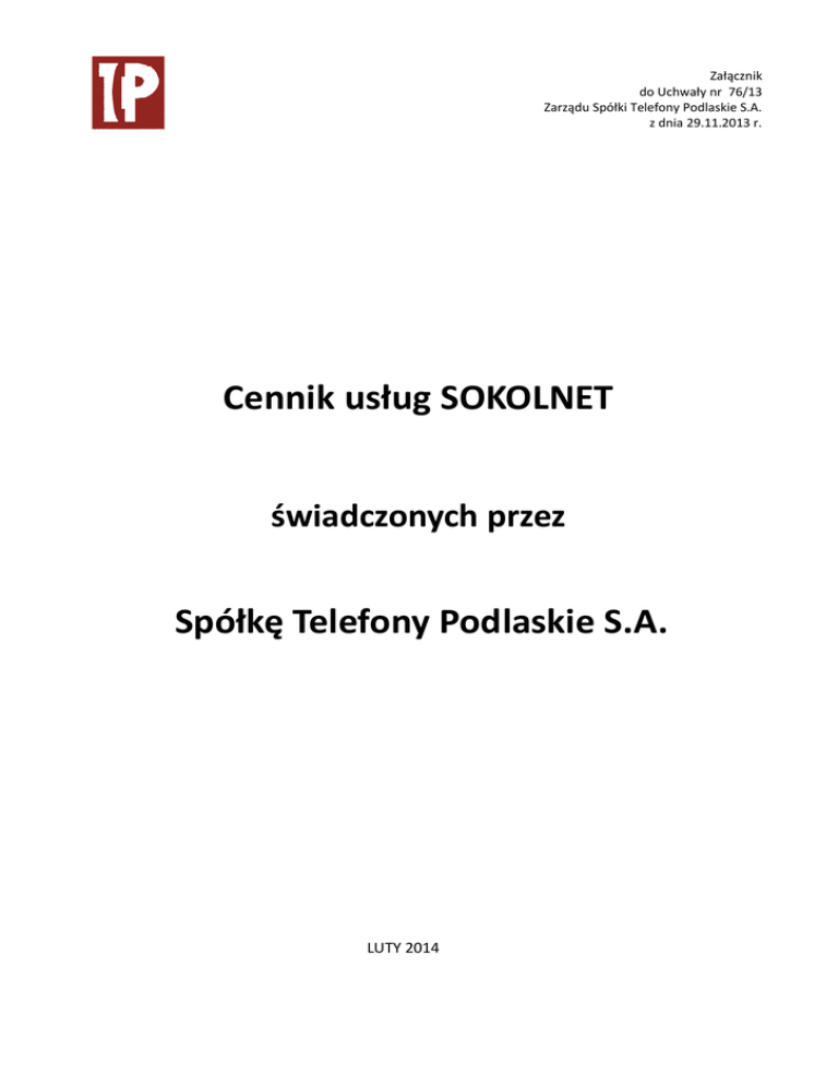 Cennik usług SOKOLNET Spółkę Telefony Podlaskie S.A.