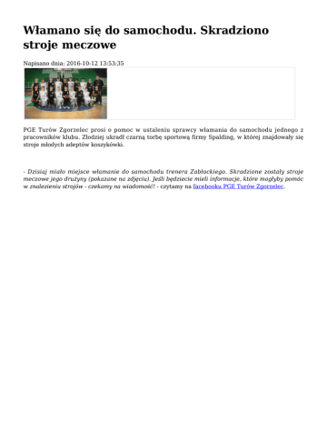 Włamano się do samochodu. Skradziono stroje meczowe Napisano dnia: 2016-10-12 13:53:35 PGE Turów Zgorzelec prosi o pomoc w ustaleniu sprawcy włamania do samochodu jednego z pracowników klubu. Złodziej ukradł czarną torbę sportową firmy Spalding, w której znajdowały się stroje młodych adeptów koszykówki. - Dzisiaj miało miejsce włamanie do samochodu trenera Zabłockiego. Skradzione zostały stroje meczowe jego drużyny (pokazane na zdjęciu). Jeśli będziecie mieli informacje, które mogłyby pomóc w znalezieniu strojów - czekamy na wiadomość! - czytamy na facebooku PGE Turów Zgorzelec. Wszystkie osoby, które posiadają jakiekolwiek informacje na temat kradzieży lub dowiedzą się, że ktoś próbuje sprzedać stroje meczowe proszone są o kontakt z klubem lub z Komendą Powiatową Policji w Zgorzelcu – osobiście lub pod nr telefonów: 75/6494200, 75/6494207, 75/6494244 albo numerem alarmowym policji: 997/112. fot.: PGE Turów Zgorzelec