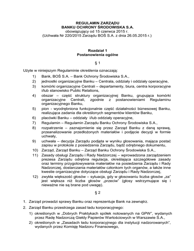 REGULAMIN ZARZĄDU BANKU OCHRONY ŚRODOWISKA S.A. obowiązujący od 15 czerwca 2015 r. (Uchwała Nr 220/2015 Zarządu BOŚ S.A. z dnia 26.05.2015 r.) Rozdział 1 Postanowienia ogólne §1 Użyte w niniejszym Regulaminie określenia oznaczają: Bank, BOŚ S.A. – Bank Ochrony Środowiska S.A., jednostki organizacyjne Banku – Centrala, oddziały i oddziały operacyjne, komórki organizacyjne Centrali – departamenty, biura, centra korporacyjne i/lub stanowisko Public Relations, 4) obszar – część struktury organizacyjnej Banku, grupująca komórki organizacyjne Centrali, zgodnie z postanowieniami Regulaminu organizacyjnego Banku, 5) pion - wyodrębniona funkcjonalnie część działalności biznesowej Banku, realizująca zadania dla określonych segmentów klientów Banku, 6) placówki Banku – oddziały i/lub oddziały operacyjne, 7) Regulamin – Regulamin Zarządu Banku Ochrony Środowiska S.A., 8) rozpatrzenie – zaznajomienie się przez Zarząd Banku z daną sprawą, przeanalizowanie przedłożonych materiałów i podjęcie decyzji w formie uchwały, 9) uchwała – decyzja Zarządu podjęta w wyniku głosowania, mająca postać zapisu w protokole z posiedzenia Zarządu, bądź odrębnego dokumentu, 10) Zarząd, Zarząd Banku – Zarząd Banku Ochrony Środowiska S.A., 11) Zasady obsługi Zarządu i Rady Nadzorczej – wprowadzona zarządzeniem prezesa Zarządu odrębna regulacja, określająca szczegółowe zasady oraz terminy przygotowywania materiałów na posiedzenia Zarządu i Rady Nadzorczej, dostarczania materiałów członkom tych organów, a także inne kwestie organizacyjne dotyczące obsługi Zarządu i Rady Nadzorczej, 12) zwykła większość głosów – sytuacja, gdy w głosowaniu liczba głosów „za” jest większa niż liczba głosów „przeciw” (głosy wstrzymujące się i nieważne nie są brane pod uwagę). 1) 2) 3) §2 1. Zarząd prowadzi sprawy Banku oraz reprezentuje Bank na zewnątrz. 2. Zarząd Banku przestrzega zasad ładu korporacyjnego: 1) określonych w „Dobrych Praktykach spółek notowanych na GPW”, wydanych przez Radę Nadzorczą Giełdy Papierów Wartościowych w Warszawie S.A., 2) określonych w „Zasadach ładu korporacyjnego dla instytucji nadzorowanych”, wydanych przez Komisję Nadzoru Finansowego, 3. O wszelkich odstępstwach od zasad, o których mowa w ust.2 Zarząd informuje zgodnie z określonym w tych dokumentach trybem. 4. Zarząd działa kolegialnie i podejmuje decyzje w formie uchwał. Rozdział 2 Kompetencje Zarządu §3 1. Do kompetencji Zarządu należą wszelkie sprawy nie zastrzeżone innym organom Banku. 2. Kolegialne kompetencje Zarządu określa Statut Banku, ustawa Prawo bankowe, ustawa Kodeks spółek handlowych oraz inne przepisy wewnętrzne i zewnętrzne regulujące działalność Banku, w tym w szczególności uchwały i rekomendacje Komisji Nadzoru Finansowego, a także dyrektywy i zalecenia Komisji Wspólnot Europejskich odnoszące się do działalności banków. 3. Realizując swoje funkcje Zarząd Banku podejmuje uchwały w sprawach, o których mowa w przepisach wymienionych w ust. 2 niniejszego paragrafu, a ponadto w sprawach mających wpływ na: 1) kształtowanie wyników finansowych Banku, w tym w szczególności dotyczących: ustalania planów finansowych i strategii działania Banku, określania poziomu oprocentowania środków pieniężnych oraz kredytów i pożyczek w Banku, 2) kształtowanie relacji Banku z otoczeniem zewnętrznym, w tym w szczególności w sprawach dotyczących: ustalania zasad powoływania i odwoływania pełnomocników i prokurentów, określania warunków i zasad postępowania Banku wobec klientów oraz na rynku międzybankowym i finansowym, w tym: wzorów regulaminów dla klientów, 3) kształtowanie i zakres kompetencji w Banku, w tym w szczególności w sprawach dotyczących ustalania zasad oceny ryzyka kredytowego oraz zasad podejmowania decyzji kredytowych w BOŚ S.A. 4. Do zadań Zarządu należy także: 1) rozpatrywanie okresowych informacji dotyczących przebiegu realizacji zadań Banku, jego sytuacji ekonomiczno-finansowej i organizacyjno-kadrowej, 2) podejmowanie decyzji kredytowych, zgodnie z przepisami wewnętrznymi w tym zakresie, 3) akceptowanie Nadzorczą. materiałów kierowanych do rozpatrzenia przez Radę §4 Prezes Zarządu: 1) koordynuje całokształt działalności Banku, 2) wykonuje zadania określone w Statucie Banku oraz innych przepisach wewnętrznych, w tym w szczególności: w niniejszym Regulaminie, Regulaminie organizacyjnym Banku oraz zarządzeniu dotyczącym podziału kompetencji w 2 Zarządzie BOŚ S.A. i zakresu poszczególnych członków Zarządu, kierowania działalnością Banku przez 3) wydaje zarządzenia odnoszące się do wszystkich obszarów działalności Banku, w tym w sprawach dotyczących m.in.: a) podziału kompetencji i zakresu kierowania działalnością Banku przez poszczególnych członków Zarządu, b) pełnienia zastępstw w sprawowanym nadzorze na czas nieobecności członka/ów Zarządu, c) legislacji wewnętrznej, d) obsługi prawnej, e) spraw organizacyjno-kadrowych, w tym w szczególności: regulaminu organizacyjnego Banku, regulaminu organizacyjnego placówki Banku oraz regulaminu pracy BOŚ S.A., f) sposobu ustalania limitu etatów w Banku Ochrony Środowiska S.A. oraz ustalenia limitów etatów dla poszczególnych obszarów, g) powoływania i rozwiązywania komitetów lub zespołów dla określonych spraw oraz powoływania przewodniczących i członków tych komitetów/zespołów - z wyłączeniem komitetów, których powoływanie leży w kompetencjach Zarządu, h) tworzenia i znoszenia wyodrębnionych stanowisk, i) organizacyjnej obsługi organów Banku. 4) podejmuje decyzje kadrowe w zakresie wskazanym w Statucie Banku oraz przepisach wewnętrznych dotyczących zasad doboru i zatrudniania pracowników Banku, 5) zatwierdza kwartalne plany pracy Zarządu Banku, 6) zatwierdza regulaminy organizacyjne komórek organ