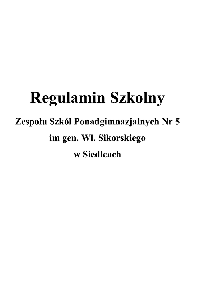 Regulamin Szkolny Zespołu Szkół Ponadgimnazjalnych Nr 5 im gen. Wł. Sikorskiego w Siedlcach Postanowienia ogólne: 1. Regulamin szkolny Zespołu Szkół Ponadgimnazjalnych Nr 5 im gen. Wł. Sikorskiego w Siedlcach określa szczegółowe zasady przebiegu procesu dydaktyczno - .wychowawczego w szkole oraz sprawy porządkowe dotyczące uczniów, nieokreślone precyzyjnie w Statucie Szkoły. 2. Regulamin szkolny nie pozostaje w sprzeczności z prawem oświatowym oraz Statutem Szkoły. 3. Regulamin szkolny obowiązuje wszystkich uczniów szkoły. I Prawa ucznia. Uczeń ma prawo do: 1. właściwie zorganizowanego procesu kształcenia zgodnie z zasadami higieny pracy umysłowej, 2. opieki wychowawczej i takich warunków pobytu w szkole, które zapewniają bezpieczeństwo oraz ochronę przed wszelkimi formami przemocy fizycznej i psychicznej oraz do ochrony i poszanowania jego godności, 3. korzystania z pomocy stypendialnej bądź doraźnej, zgodnie z odrębnymi przepisami, 4. Ŝyczliwego i podmiotowego traktowania w procesie dydaktyczno -wychowawczyrn, 5. swobody wyraŜania myśli i przekonań, jeśli nie narusza tym dobra innych osób, 6. rozwijania zainteresowań, zdolności i talentów, 7. sprawiedliwej, obiektywnej, jawnej i umotywowanej oceny, 8. informacji o wymaganiach edukacyjnych z poszczególnych przedmiotów oraz o sposobach i częstotliwości sprawdzania osiągnięć edukacyjnych, 9. pomocy w przypadku trudności w nauce, 10. korzystania z pomocy psychologiczno-pedagogicznej oraz poradnictwa zawodowego, 11. korzystania z pomieszczeń szkolnych, sprzętu, środków dydaktycznych, księgozbioru biblioteki podczas zajęć pozalekcyjnych 12. wpływania na Ŝycie szkoły poprzez działanie w samorządzie uczniowskim oraz innych organizacjach istniejących w szkole, 13. pomocy pielęgniarskiej, 14. reprezentowania szkoły w olimpiadach, konkursach, zawodach oraz wszelkich imprezach organizowanych w szkole lub poza nią. 15. odwołać się do dyrekcji szkoły w przypadku naruszenia zasad wewnątrzszkolnego systemu oceniania lub wystawiania ocen z zachowania. 2 II Obowiązki ucznia Uczeń ma obowiązek: 1. uczęszczać na zajęcia wynikające z planu zajęć, przybywać na nie punktualnie, a w przypadku spóźnienia przyjścia do sali, w której się one odbywają, 2. rzetelnie i systematycznie przygotowywać się do zajęć oraz aktywnie w nich uczestniczyć, 3. uzupełnić braki wynikające z absencji, 4. być zaangaŜowanym w Ŝycie klasy i szkoły, 5. godnie reprezentować szkołę, dbać o jej honor, tradycję, współtworzyć jej autorytet, 6. przestrzegać norm kultury współŜycia zarówno w odniesieniu do kolegów, jak i w odniesieniu do nauczycieli oraz innych pracowników szkoły, 7. być uczciwym, odpowiedzialnym, reagować na dostrzeŜone przejawy zła, szanować godność osobistą własną i innych osób, być tolerancyjnym dla postaw i poglądów innych, 8. wykazywać troskę o Ŝycie, zdrowie i higienę oraz rozwój własny i kolegów, 9. przestrzegać zakazu palenia papierosów, picia alkoholu, posiadania i uŜywania narkotyków na terenie szkoły i w innych miejscach publicznych, 10. pozostawać na terenie szkoły w czasie przerw i wolnych godzin lekcyjnych, 11. nosić w salach lekcyjnych i sali gimnastycznej obuwie zmienne lub okrycie na obuwie, 12. troszczyć się o mienie szkoły i jej estetyczny wygląd, 13. ze względu na bezpieczeństwo bezwzględnie wykonywać plecenia nauczycieli wychowania fizycznego oraz przestrzegać przepisy BHP w pracowniach przedmiotowych i pracowni zajęć praktycznych, 14. rzetelnie pełnić dyŜury w klasie i szkole, 15. znać Statut Szkoły, uchwały, obowiązujące regulaminy i zarządzenia, a w szczególności prawa i obowiązki ucznia oraz zasady wewnątrzszkolnego oceniania i zasady wystawiania ocen z zachowania, 16. posiadać i szanować legitymację szkolną jako dokument swej uczniowskiej toŜsamości, 17. posiadać zeszyt zajęć praktycznych, 18. posiadać identyfikator i nosić go w widocznym miejscu, przebywając na terenie szkoły; 19. być zawsze stosownie ubranym, 20. uczestniczyć w uroczystościach i imprezach szkolnych, 21. w przypadku tzw. okienka przebywać w czytelni szkolnej, a przypadku braku miejsc w czytelni we wnęce na I piętrze, nie zakłócając swoim zachowaniem odbywających się w tym czasie 3 lekcji, 22. w czasie zajęć dydaktycznych mieć wyłączony telefon komórkowy i przechowywać go w torbie szkolnej, a w uzasadnionych, wyjątkowych sytuacjach uzyskać zgodę nauczyciela na skorzystanie z telefonu komórkowego, 23. w przypadku nieuczęszczania na religię lub etykę, bądź zwolnienia z wychowania fizycznego przebywać w czasie tych lekcji w czytelni lub na lekcji, pod opieką nauczyciela. III Powinności ucznia 1. Ubiór codzienny oraz wygląd ucznia. Strój codzienny ucznia na terenie szkoły powinien być skromny, schludny a wygląd zadbany i czysty. Obowiązek wywiązywania się uczniów z noszenia odpowiedniego stroju ma wpływ na ocenę zachowania. Dziewczęta obowiązują następujące normy dotyczące stroju powszedniego: a) spódnica nie krótsza niŜ do połowy uda lub spodnie, b) bluzki nie prześwitujące, bez głębokich dekoltów, c) obuwie nie zagraŜające bezpieczeństwu, d) zabronione jest noszenie odzieŜy odsłaniającej brzuchy i plecy oraz koszulek na ramiączkach. Chłopców obowiązują następujące normy dotyczące stroju powszedniego: a) długie spodnie lub nie krótsze niŜ 3/4 długości, b) bluzka lub koszulka z przynajmniej krótkim rękawkiem, bez prowokujących napisów, naszywek, wulgarnych napisów i emblematów sugerujących m. in. przynaleŜność do grup nieformalnvch. 2. Ubiór galowy. Noszenie stroju galowego obowiązuje wszystkich uczniów podczas uroczystości szkolnych (rozpoczęcie i zakończenie roku szkolnego, egzaminy maturalne, egzaminy zawodowe, studniówka, wyjazdy do teatru i na koncerty oraz zawsze na polecenie nauczycieli). Ubiór galowy dz