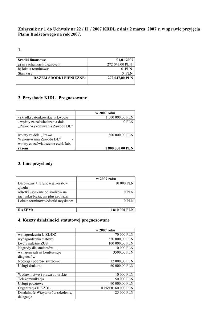Załącznik nr 1 do Uchwały nr 22 / II / 2007 KRDL z dnia 2 marca 2007 r. w sprawie przyjęcia Planu BudŜetowego na rok 2007. 1. Środki finansowe a) na rachunkach bieŜących: b) lokata terminowa: Stan kasy RAZEM ŚRODKI PIENIĘśNE: 01,01 2007 272 047,00 PLN 0 PLN 0 PLN 272 047,00 PLN 2. Przychody KIDL Prognozowane - składki członkowskie w kwocie - wpłaty za zaświadczenia dok. „Prawo Wykonywania Zawodu DL” wpłaty za dok. „Prawo Wykonywania Zawodu DL” wpłaty za zaświadczenie ewid. lab. razem w 2007 roku 1 500 000,00 PLN 0 PLN 300 000,00 PLN 1 800 000,00 PLN 3. Inne przychody Darowizny + refundacja kosztów zjazdu odsetki uzyskane od środków na rachunku bieŜącym plus prowizja Lokata terminowa/odsetki uzyskane: w 2007 roku 10 000 PLN 0 PLN 0 PLN RAZEM: 1 810 000 PLN 4. Koszty działalności statutowej prognozowane wynagrodzenia U.ZL/DZ wynagrodzenia etatowe kwoty naleŜne ZUS Nagrody dla studentów wynajem sali na konferencję diagnostów Noclegi i podróŜe słuŜbowe Usługi drukarni Wydawnictwo i prawa autorskie Telekomunikacja Usługi pocztowe Organizacja II KZDL Działalność Wizytatorów szkolenie, delegacje w 2007 roku 70 000 PLN 550 000,00 PLN 100 000,00 PLN 10 000 PLN 3500,00 PLN 32 000,00 PLN 60 000,00 PLN 10 000 PLN 50 000 PLN 90 000,00 PLN II NZDL 60 000 PLN 25 000 PLN Działalność Sądu Dyscyplinarnego Działalność Rzecznika Dyscyplinarnego KIDL Działalność Komisji Rewizyjnej Komisje Zagraniczne współpracujące z zagranicznymi ośrodkami naukowymi Sympozja naukowe współorganizowane i organizowane przez KIDL Archiwizacja dokumentów Krajowego Komitetu Organizacyjnego Izby Wydawnictwo, publikacji dot. Diagnostyki laboratoryjnej Zespoły robocze (eksperci, i ds. programów) Udział w programach med on line Prezydium (12x) delegacje,cathering itp. Przedstawiciele KRDL KRDL (4x) delegacje, cathering itp. Inne komisje KRDL Razem 20 000 PLN 15 000 PLN 10 000 PLN 15 000,00 PLN 30 000,00 PLN 6 000,00 PLN 10 000,00 PLN 40 000,00 PLN 20 000,00 PLN 12 000,00 PLN 25 000,00 PLN 40 000,00 PLN 15 000,00 PLN 1 318 500 PLN 5. Pozostałe koszty administracyjne: w 2007 roku DoposaŜenie w komp. i oprogramowanie biura, członków prezydium, przedstawicieli, składu sądu, wizytatorów KRDL w sprzęt komputerowy i elektroniczny zest. Nagłośnienie sali wykładowej KIDL Artykuły biurowe Artykuły remontowo budowlane (okna, drzwi) i materiały budowlane Projekty modernizacji budynku Remonty i naprawy Instalacja dźwigu osobowego i konserwacja Energia (woda, prąd, gaz) Środki czystości Ochrona i monitoring Pozostałe usługi (wywóz śmieci, przejazdy etc.) BHP szkolenie Reklama i reprezentacja Inne koszty, w tym ubezpieczenie budynku , sprzętu, podatki i opłaty RAZEM: Razem (pozycja 4 i 5) 30 000 PLN 10 000 PLN 45 000 PLN 50 000,00 PLN 6 000,00 PLN 10 000,00 PLN 25 000,00 PLN 40 000,00 PLN 12 000,00 PLN 2 500,00 PLN 35 000,00 PLN 200,00 PLN 20 000,00 PLN 40 000,00 PLN 325 700,00 PLN 1 644 200,00 PLN 6. Wydatki dotyczące posesji i jej modernizacji DzierŜawa przylegającej działki do posesji Modernizacja części elewacji budynku i wjazdu do bramy budynku Adaptowanie kondygnacji V dla potrzeb noclegowni RAZEM: RAZEM WSZYSTKIE KOSZTY w 2007 roku 55 000,00 PLN 15 000,00 PLN 250 000,00 PLN 320 000,00 PLN 1 964 200,00 PLN PoniewaŜ zamierzone prace na budynku w 2006 roku dotyczące adaptacji IV i V piętra nie zostały podjęte z przyczyny zaniechania kredytu bankowego i właściwego własnego zabezpieczenia finansowego istnieć zatem będzie konieczność rozwaŜenia zasadności przyjętej na wstępie wersji działalności gospodarczej i wystąpienia o kredyt bankowy. Posiadane rezerwy finansowe w 2006 r. pozwoliły na sfinansowanie w całości zakupu i instalację dźwigu osobowego Zamierzane prace na budynku w celu przygotowania noclegowni zakładać będą wystąpienie do KRDL o akceptację na zaciągnięcie kredytu bankowego w wysokości 600 000 PLN. Kredyt będzie zabezpieczeniem prognozowanych wydatków i prac modernizacyjnych budynku, poniewaŜ przewidywane wpływy będą się realizować sukcesywnie Zamknięcie bilansu na koniec roku 2007 będzie moŜliwe pod warunkiem zaciągnięcia kredytu. Wpływy ze składek członkowskich nie są równomierne dla kaŜdego miesiąca i brak będzie środków i sposobów zabezpieczających regularność i obligatoryjność wnoszonych składek przez członków korporacji. Realizacja celów statutowych będzie nadrzędną w programie budŜetowym na rok 2007, chociaŜ remonty i modernizacja budynku do celów oczekiwań członków korporacji są równie waŜne i uzasadniające wniosek o kredyt. Ponadto w roku 2007 z wpływów ze składek członkowskich winna zostać utrzymana: - rezerwa przeznaczona na specjalizację w kwocie: - 5% rezerwa przeznaczona na bliŜej nieprzewidziane wydatki: 150.000,00 PLN 90.000,00 PLN Zatrudnienie na dzień 01-01-2007 wynosiło 12 osób etatowo oraz 3 osoby na umowę o dzieło , a na koniec 2007 roku planowane jest zwiększenie zatrudnienia do 16 osób (w tym 3 osoby zatrudnione w niepełnym wymiarze czasu). Stawka bazowa na 2007 rok zakładana jest jak w 2006 w wysokości 2 200 PLN. Księgowość Izby prowadzona jest komputerowo za pomocą programu Symfonia. Komisja Rewizyjna w listopadzie 2006 r. przyjęła przedłoŜone sprawozdanie z działalności Izby za okres I Kadencji i przedstawiony bilans wykorzystania planu budŜetowego na rok 2006. Kierownik Biura KIDL Stanisław KręŜel