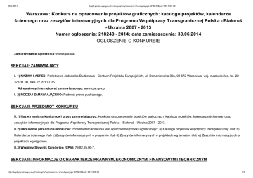 30.6.2014 bzp0.portal.uzp.gov.pl/index.php?ogloszenie=show&pozycja=218240&rok=2014-06-30 Warszawa: Konkurs na opracowanie projektów graficznych: katalogu projektów, kalendarza ściennego oraz zeszytów informacyjnych dla Programu Współpracy Transgranicznej Polska - Białoruś - Ukraina 2007 - 2013 Numer ogłoszenia: 218240 - 2014; data zamieszczenia: 30.06.2014 OGŁOSZENIE O KONKURSIE Zamieszczanie ogłoszenia: obowiązkowe. SEKCJA I: ZAMAWIAJĄCY I. 1) NAZWA I ADRES: Państwowa Jednostka Budżetowa - Centrum Projektów Europejskich, ul. Domaniewska 39a, 02-672 Warszawa, woj. mazowieckie, tel. 22 378 31 00, faks 22 201 97 25. Adres strony internetowej zamawiającego: www.cpe.gov.pl I. 2) RODZAJ ZAMAWIAJĄCEGO: Podmiot prawa publicznego. SEKCJA II: PRZEDMIOT KONKURSU II.1) Nazwa nadana konkursowi przez zamawiającego: Konkurs na opracowanie projektów graficznych: katalogu projektów, kalendarza ściennego oraz zeszytów informacyjnych dla Programu Współpracy Transgranicznej Polska - Białoruś - Ukraina 2007 - 2013. II.2) Określenie przedmiotu konkursu: Przedmiotem konkursu jest opracowanie projektu graficznego: a) Katalogu projektów współpracy transgranicznej; i/lub b) Kalendarza ściennego i/lub c) Zeszytów informacyjnych o programie i/lub d) Zeszytów informacyjnych o projektach wg tematów i/lub e) Zeszytów informacyjnych o projektach wg regionów. II.3) Wspólny Słownik Zamówień (CPV): 79.82.25.00-7. SEKCJA III: INFORMACJE O CHARAKTERZE PRAWNYM, EKONOMICZNYM, FINANSOWYM I TECHNICZNYM http://bzp0.portal.uzp.gov.pl/index.php?ogloszenie=show&pozycja=218240&rok=2014-06-30 1/5 30.6.2014 bzp0.portal.uzp.gov.pl/index.php?ogloszenie=show&pozycja=218240&rok=2014-06-30 WARUNKI UDZIAŁU Wymagania, jakie muszą spełniać uczestnicy konkursu: 1. O dopuszczenie do udziału w konkursie mogą ubiegać się Uczestnicy, którzy złożą wymagane dokumenty i oświadczenia oraz spełnią warunki dotyczące: 1) posiadania uprawnienia do wykonywania określonej działalności lub czynności, jeżeli przepisy nakładają obowiązek posiadania takich uprawnień; 2) posiadania wiedzy i doświadczenia tj. legitymowania się minimum sześcioma wykonanymi przez siebie usługami, polegającymi na wykonaniu projektu graficznego broszury (każda o objętości minimum 28 stron z okładkami) lub czasopisma o cyklu wydawniczym nie krótszym niż tydzień, o wartości każdej usługi nie mniejszej niż 1700,00 zł brutto (słownie: tysiąc siedemset zł), w okresie ostatnich trzech lat przed upływem terminu składania Wniosków o dopuszczenie do udziału w konkursie, a jeżeli okres prowadzenia działalności jest krótszy - w tym okresie; 3) dysponowania odpowiednim potencjałem technicznym oraz osobami zdolnymi do wykonania zamówienia, tj. możliwością prowadzenia prac bez opóźnień nad wieloma projektami graficznymi równolegle, niezależnie dla minimum 6 różnych publikacji jednocześnie, oraz dysponowania osobami które są w stanie kreować rozwiązania graficzne: minimum 3 osoby z minimum 2-letnim doświadczeniem w pracy w działach kreacji i/lub agencjach reklamowych na stanowiskach grafika, a także dysponowania osobami, które mogą koordynować proces powstawania publikacji: minimum 1 osoba z minimum 1-rocznym doświadczeniem w obsłudze klienta. 4) sytuacji ekonomicznej i finansowej. 2. Uczestnicy konkursu muszą posiadać autorskie prawa majątkowe do pracy konkursowej zgłoszonej do konkursu. 2. W celu potwierdzenia spełnienia warunków udziału w konkursie, o których mowa w art. 22 ust. 1 Ustawy, Uczestnik dołączy do Wniosku oświadczenie, podpisane przez osobę/y upoważnioną/e do reprezentowania Uczestnika. Wzór oświadczenia stanowi załącznik nr 2 do Regulaminu. 3. W celu potwierdzenia spełnienia przez Uczestnika warunku udziału w konkursie dotyczącego posiadania wiedzy i doświadczenia, Uczestnik dołączy do Wniosku wykaz co najmniej sześciu wykonanych przez siebie usług polegających na wykonaniu projektu graficznego broszury (każda o objętości minimum 28 stron z okładkami) lub czasopisma o cyklu wydawniczym nie krótszym niż tydzień, o wartości każdej usługi nie mniejszej niż 1700,00 zł brutto (słownie: tysiąc siedemset zł), z podaniem ich przedmiotu, odbiorcy, daty wykonania i wartości brutto. Wykazane usługi muszą być zrealizowane w okresie ostatnich trzech lat przed upływem terminu składania Wniosków o dopuszczenie do udziału w konkursie, a jeżeli okres prowadzenia działalności jest krótszy - w tym okresie. Wzór wykazu usług stanowi załącznik nr 3 do Regulaminu. Wraz z wykazem Uczestnik dołączy do Wniosku dokumenty potwierdzające, że każda z usług wymienionych w wykazie została wykonana należycie, oraz dysk optyczny (CD-R lub DVD/R) z zapisanymi w formacie PDF pracami, które zostały ujęte w wykazie. 4. W celu potwierdzenia spełnienia przez Uczestnika warunku udziału w konkursie dotyczącego dysponowania odpowiednim potencjałem technicznym oraz osobami zdolnymi do wykonania zamówienia Uczestnik dołączy do Wniosku wykaz osób, które będą uczestniczyć w wykonywaniu zamówienia wraz z informacjami nt. ich doświadczenia (wg wzoru określonego w załączniku nr 4 do Regulaminu) oraz informacją o podstawie do dysponowania tymi osobami. 5. Uczestnik może polegać na wiedzy i doświadczeniu, potencjale technicznym, osobach zdolnych do wykonania zamówienia lub zdolnościach finansowych innych podmiotów, http://bzp0.portal.uzp.gov.pl/index.php?ogloszenie=show&pozycja=218240&rok=2014-06-30 2/5 30.6.2014 bzp0.portal.uzp.gov.pl/index.php?ogloszenie=show&pozycja=218240&rok=2014-06-30 niezależnie od charakteru prawnego łączących go z nimi stosunków. Uczestnik w takiej sytuacji jest zobowiązany udowodnić Zamawiającemu, iż będzie dysponował zasobami niezbędnymi do realizacji zamówienia, w szczególności przedstawiając w tym celu pisemne zobowiązanie innych podmiotów do oddania mu do dyspozycji niezbędn