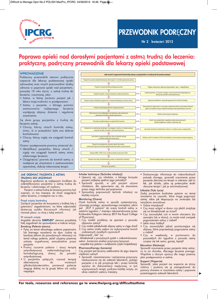 Difficult to Manage Opin No.2 POLISH MacPro_IPCRG 04/06/2013 16:46 Page 1 PRZEWODNIK PODRĘCZNY Nr 2 kwiecień 2012 Poprawa opieki nad dorosłymi pacjentami z astmą trudną do leczenia: praktyczny, podręczny przewodnik dla lekarzy opieki podstawowej WPROWADZENIE Podręczny przewodnik stanowi praktyczne wsparcie dla lekarzy podstawowej opieki zdrowotnej oraz innych pracowników służby zdrowia w poprawie opieki nad pacjentami, powyżej 18 roku życia, z astmą trudną do leczenia, rozumianą, jako: • Astma, w której zarówno pacjent jak i lekarz mają trudności w postępowaniu • Astma, u pacjenta, u którego pomimo zastosowania najlepszego leczenia występują objawy dzienne i regularne zaostrzenia. Jak ocenić i poprawić kontrolę astmy u pacjentów z trudną do leczenia astmą? Pacjent ma astmę niekontrolowaną i/lub częste (>=2/rok) zaostrzenia astmy TAK Pacjent ma potwierdzoną diagnozę astmy Wykaż zmienność obturacji (spirometria, test z metacholiną) NIE TAK Pacjent nie pali / nie jest narażony na dym tytoniowy NIE Zaoferuj pomoc w rzuceniu nałogu, w tym leczenie farmakologiczne, skieruj do poradni antynikotynowej NIE Zapewnij szkolenie i sprawdź poprawność techniki inhalacji NIE Sprawdź ilość zapisanych, na receptę, opakowań leków oraz liczbę inhalacji, jeżeli to możliwe oznacz stężenie kortyzolu lub prednizolonu we krwi TAK Pacjent używa inhalatory poprawnie i otrzymał edukację na temat astmy TAK Pacjent przestrzega zaleceń terapeutycznych TAK Alternatywna lub nakładająca się diagnoza, jako przyczyna pierwotna choroby została wykluczona NIE Wyklucz alternatywną dignozę NIE Oceń i lecz optymalnie: zapalenie zatok przynosowych, refluks żołądkowy, otyłość, depresję i lęk NIE Sprawdź narażenie środowiska w domu, w miejscu pracy, wypoczynku NIE Odstaw, jeśli to możliwe, NLPZ, beta-blokery, hormonalną terapię zastępczą NIE Powtórz diagnostykę i ponownie oceń stan pacjenta TAK Są dwie grupy pacjentów z trudną do leczenia astmą: • Chorzy, którzy utracili kontrolę astmy, mimo, iż w przeszłości była ona dobrze kontrolowana • Chorzy, którzy nigdy nie osiągnęli kontroli astmy Ocena i postępowanie powinny zmierzać do: • Identyfikacji pacjentów, którzy utracili / nigdy nie osiągnęli kontroli astmy mimo właściwego leczenia. • Osiągnięcia/ powrotu do kontroli astmy, a następnie jej utrzymania z zastosowaniem optymalnej, dobrze tolerowanej terapii. JAK OCENIAĆ PACJENTA Z ASTMĄ TRUDNĄ DO LECZENIA? Regularne spotkania są najlepszym środkiem do zidentyfikowania pacjentów z astmą trudną do leczenia i właściwego ich nadzoru. Pacjenci z astmą trudną do leczenia powinny być oceniani, co trzy miesiące, do chwili osiągnięcia celów leczenia, a następnie raz w roku. Przed wizytą kontrolną Zachęcić pacjentów do korzystania z krótkiej listy z pytaniami/ zagadnieniami, na które odpowiedzi dostarczą szybko kluczowych informacji jak również planu, co chcą z tobą omówić. W ramach wizyty Angielski akronim SIMPLES* stanowi przydatną listę zagadnień do sprawdzenia w trakcie wizyty: Smoking (Palenie tytoniu) • Pytaj na temat aktualnego palenia papierosów lub biernego narażenia na dym. Ludzie są bardziej skłonni do prawdziwych informacji na temat nałogu palenia, jeżeli użyjemy pisemnej ankiety wypełnianej samodzielnie przez pacjenta • Promuj rzucenie palenia i stosuj terapię antynikotynową niefarmakologiczną i farmakologiczną, skieruj do poradni antynikotynowej • U pacjentów palących, rozważ terapię alternatywną do wziewych glikokortykosteroidów, ponieważ palacze reagują słabiej na tą grupę leków niż osoby niepalące Choroby współistniejące są optymalnie leczone TAK Narażenie na substancje drażniące i uczulające w domu, w miejscu pracy, rozrywki zostało usunięte / jest kontrolowane TAK Leki, które mogą powodować skurcz oskrzeli zostały w miarę możliwości przerwane, TAK Pacjent ma przepisane wysokie dawki steroidów wziewnych łącznie z lub bez glikokortykosteroidów systemowych TAK Dodaj LABA/ LTRA/ inne/ zwiększ dawkę wziewnych GKS TAK Pacjent musi być monitorowany, przez co najmniej 6 miesięcy TAK Skieruj do specjalisty Inhaler technique (Technika inhalacji) • Upewnij się, czy inhalator, z którego korzysta pacjent najlepiej spełnia jego potrzeby? • Sprawdź sposób, w jaki pacjent używa inhalatora, dla upewnienia się, że stosowana przez niego technika jest poprawna. • Sprawdzaj poprawność techniki inhalacji na każdej wizycie. Monitoring (Ocena) Oceń kontrolę astmy w sposób systematyczny, używając prostego, sprawdzonego narzędzia, jakim jest „RCP 3 pytania” do oceny kontroli astmy w ostatnim tygodniu / miesiącu rekomendowane przez Królewskie Kolegium Lekarzy (RCP the Royal College of Physicians): 1. Czy miałeś problemy ze spaniem z powodu objawów astmy? 2. Czy miałeś jakiekolwiek objawy astmy w ciągu dnia? 3. Czy astma miała wpływ na wykonywanie twoich codziennych zwykłych czynności? Odpowiedź „Tak” na: - którekolwiek z powyższych pytań = niekontrolowana astma - konieczna analiza przyczyny/przyczyn - wszystkie trzy pytania = zwiększone ryzyko hospitalizacji Pharmacotherapy (Leczenie) Czy pacjent jest leczony adekwatnie do jego stopnia ciężkości astmy? • Sprawdź, niezamierzone i zamierzone przyczyny niestosowania się do zaleceń lekarskich, pytając pacjenta o to jak przyjmuje leki i przez kontrolę wpisów do dokumentacji medycznej, w tym wypisywanych recept, podczas każdej wizyty, za okres ostatnich sześciu miesięcy. • Dostosowując informacje do indywidualnych potrzeb chorego, sprawdź rozumienie przez pacjenta zleconej mu terapii w zakresie: jaki to lek, jak działa, jakie są potencjalne skutki uboczne terapii i jak je zminimalizować. Lifestyle (Tryb życia) Zadaj pacjentom konkretne pytania na temat narażenia na czynniki, które mogą pogorszyć astmę, takie jak ekspozycja 