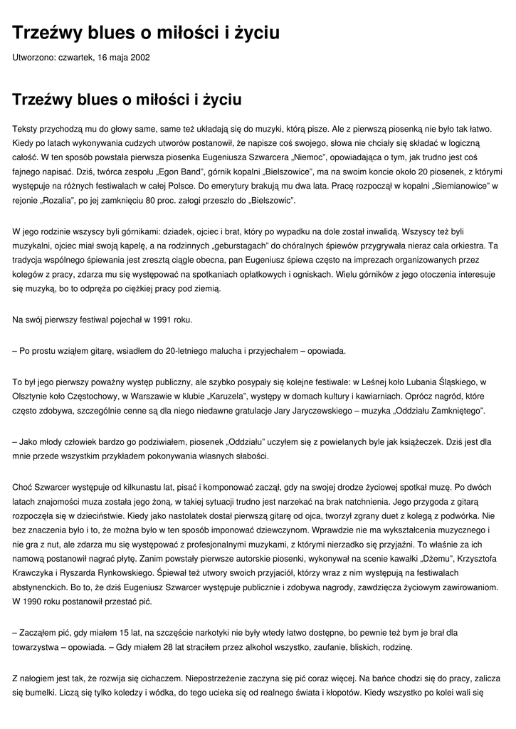 Trzeźwy blues o miłości i życiu Utworzono: czwartek, 16 maja 2002 Trzeźwy blues o miłości i życiu Teksty przychodzą mu do głowy same, same też układają się do muzyki, którą pisze. Ale z pierwszą piosenką nie było tak łatwo. Kiedy po latach wykonywania cudzych utworów postanowił, że napisze coś swojego, słowa nie chciały się składać w logiczną całość. W ten sposób powstała pierwsza piosenka Eugeniusza Szwarcera „Niemoc”, opowiadająca o tym, jak trudno jest coś fajnego napisać. Dziś, twórca zespołu „Egon Band”, górnik kopalni „Bielszowice”, ma na swoim koncie około 20 piosenek, z którymi występuje na różnych festiwalach w całej Polsce. Do emerytury brakują mu dwa lata. Pracę rozpoczął w kopalni „Siemianowice” w rejonie „Rozalia”, po jej zamknięciu 80 proc. załogi przeszło do „Bielszowic”. W jego rodzinie wszyscy byli górnikami: dziadek, ojciec i brat, który po wypadku na dole został inwalidą. Wszyscy też byli muzykalni, ojciec miał swoją kapelę, a na rodzinnych „geburstagach” do chóralnych śpiewów przygrywała nieraz cała orkiestra. Ta tradycja wspólnego śpiewania jest zresztą ciągle obecna, pan Eugeniusz śpiewa często na imprezach organizowanych przez kolegów z pracy, zdarza mu się występować na spotkaniach opłatkowych i ogniskach. Wielu górników z jego otoczenia interesuje się muzyką, bo to odpręża po ciężkiej pracy pod ziemią. Na swój pierwszy festiwal pojechał w 1991 roku. – Po prostu wziąłem gitarę, wsiadłem do 20-letniego malucha i przyjechałem – opowiada. To był jego pierwszy poważny występ publiczny, ale szybko posypały się kolejne festiwale: w Leśnej koło Lubania Śląskiego, w Olsztynie koło Częstochowy, w Warszawie w klubie „Karuzela”, występy w domach kultury i kawiarniach. Oprócz nagród, które często zdobywa, szczególnie cenne są dla niego niedawne gratulacje Jary Jaryczewskiego – muzyka „Oddziału Zamkniętego”. – Jako młody człowiek bardzo go podziwiałem, piosenek „Oddziału” uczyłem się z powielanych byle jak książeczek. Dziś jest dla mnie przede wszystkim przykładem pokonywania własnych słabości. Choć Szwarcer występuje od kilkunastu lat, pisać i komponować zaczął, gdy na swojej drodze życiowej spotkał muzę. Po dwóch latach znajomości muza została jego żoną, w takiej sytuacji trudno jest narzekać na brak natchnienia. Jego przygoda z gitarą rozpoczęła się w dzieciństwie. Kiedy jako nastolatek dostał pierwszą gitarę od ojca, tworzył zgrany duet z kolegą z podwórka. Nie bez znaczenia było i to, że można było w ten sposób imponować dziewczynom. Wprawdzie nie ma wykształcenia muzycznego i nie gra z nut, ale zdarza mu się występować z profesjonalnymi muzykami, z którymi nierzadko się przyjaźni. To właśnie za ich namową postanowił nagrać płytę. Zanim powstały pierwsze autorskie piosenki, wykonywał na scenie kawałki „Dżemu”, Krzysztofa Krawczyka i Ryszarda Rynkowskiego. Śpiewał też utwory swoich przyjaciół, którzy wraz z nim występują na festiwalach abstynenckich. Bo to, że dziś Eugeniusz Szwarcer występuje publicznie i zdobywa nagrody, zawdzięcza życiowym zawirowaniom. W 1990 roku postanowił przestać pić. – Zacząłem pić, gdy miałem 15 lat, na szczęście narkotyki nie były wtedy łatwo dostępne, bo pewnie też bym je brał dla towarzystwa – opowiada. – Gdy miałem 28 lat straciłem przez alkohol wszystko, zaufanie, bliskich, rodzinę. Z nałogiem jest tak, że rozwija się cichaczem. Niepostrzeżenie zaczyna się pić coraz więcej. Na bańce chodzi się do pracy, zalicza się bumelki. Liczą się tylko koledzy i wódka, do tego ucieka się od realnego świata i kłopotów. Kiedy wszystko po kolei wali się człowiekowi na głowę, okazuje się, że wokół jest pusto. Bliscy odeszli, bo nie wytrzymali codziennych zmagań z alkoholikiem, koledzy zniknęli, bo skończyła się balanga. – W 1990 roku powiedziałem sobie dosyć tego i pojechałem na odwyk do Gorzyc. Ale nie wytrzymałem, po roku był drugi odwyk i od tego czasu jestem trzeźwy. Choroba nie wybiera, na odwyku spotykał i profesorów, i elektryków. Każdy z nich potrzebował pomocy. Żaden na początku nie chciał się przyznać przed sobą, że jest alkoholikiem. Może jeden człowiek na milion potrafi poradzić sobie z chorobą alkoholową sam, wszyscy inni potrzebują pomocy fachowców. Taką pomocą służą kluby abstynentów, gdzie po odwyku przechodzi się rehabilitację. Niestety, nie wszystkim udaje się wrócić do życia, w którym nie trzeba gorączkowo szukać butelki. – Nie miałem momentów załamań, w których chciałem sięgnąć po kieliszek, ale zdarza mi się – tak jak zdrowym ludziom – mieć ochotę na zimne piwo z pianką. Nie wypijam nawet tego jednego piwa, bo mam świadomość, że to się może bardzo źle skończyć. W alkoholu topił też lęk przed pracą pod ziemią. – Nikt mi nie powie, że zjeżdżając na dół się nie boi. Ten lęk towarzyszy nawet podświadomie. Pamiętam, że kiedyś górnicy od razu po szychcie chodzili na piwo. Nie tylko ze względu na pragnienie, także po to, by się zrelaksować. Dziś kadra stawia ostre warunki – jesteś na dole pijany, to wylatujesz. Teraz w większości kiosków pod kopalnią zamiast piwa można kupić słonecznik. Szwarcer podkreśla, że żeby przestać pić, trzeba mieć motywację. Sam przestał pić ze względu na dzieci, dziś motywuje go także miłość do muzyki i drugiej żony. Wsparciem był dla niego zawsze przykład, jaki swoim życiem dawali mu rodzice. Kiedyś pisał piosenki o wychodzeniu z nałogu, ale dziś woli, jak sam mówi, trzeźwe teksty o miłości i życiu. Anna Zych