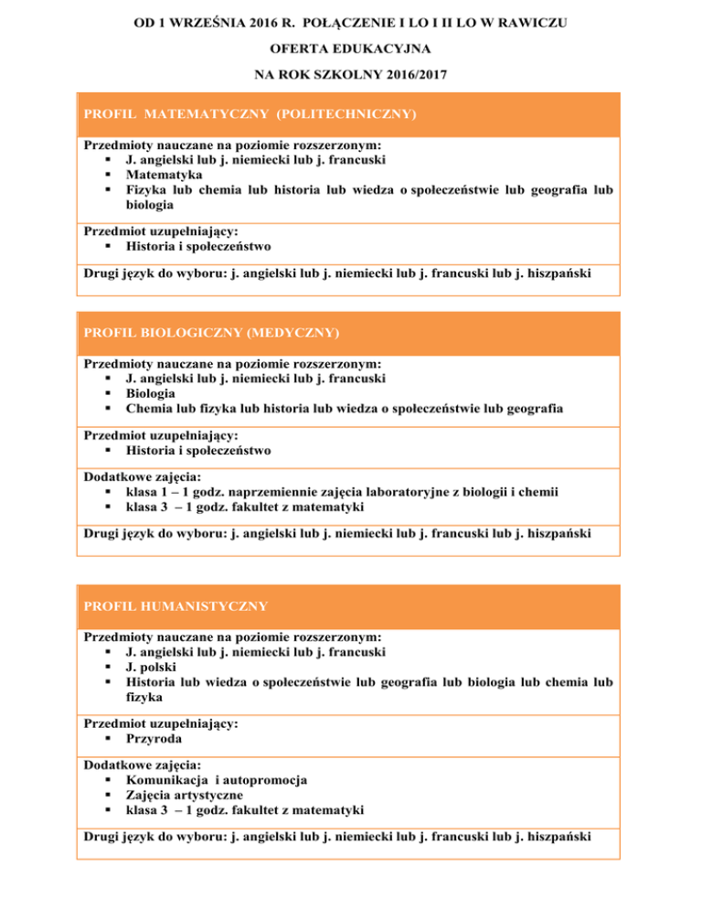 OD 1 WRZEŚNIA 2016 R. POŁĄCZENIE I LO I II LO W RAWICZU OFERTA EDUKACYJNA NA ROK SZKOLNY 2016/2017 PROFIL MATEMATYCZNY (POLITECHNICZNY) Przedmioty nauczane na poziomie rozszerzonym: J. angielski lub j. niemiecki lub j. francuski Matematyka Fizyka lub chemia lub historia lub wiedza o społeczeństwie lub geografia lub biologia Przedmiot uzupełniający: Historia i społeczeństwo Drugi język do wyboru: j. angielski lub j. niemiecki lub j. francuski lub j. hiszpański PROFIL BIOLOGICZNY (MEDYCZNY) Przedmioty nauczane na poziomie rozszerzonym: J. angielski lub j. niemiecki lub j. francuski Biologia Chemia lub fizyka lub historia lub wiedza o społeczeństwie lub geografia Przedmiot uzupełniający: Historia i społeczeństwo Dodatkowe zajęcia: klasa 1 – 1 godz. naprzemiennie zajęcia laboratoryjne z biologii i chemii klasa 3 – 1 godz. fakultet z matematyki Drugi język do wyboru: j. angielski lub j. niemiecki lub j. francuski lub j. hiszpański PROFIL HUMANISTYCZNY Przedmioty nauczane na poziomie rozszerzonym: J. angielski lub j. niemiecki lub j. francuski J. polski Historia lub wiedza o społeczeństwie lub geografia lub biologia lub chemia lub fizyka Przedmiot uzupełniający: Przyroda Dodatkowe zajęcia: Komunikacja i autopromocja Zajęcia artystyczne klasa 3 – 1 godz. fakultet z matematyki Drugi język do wyboru: j. angielski lub j. niemiecki lub j. francuski lub j. hiszpański PROFIL OGÓLNY Przedmioty nauczane na poziomie rozszerzonym: J. angielski lub j. niemiecki lub j. francuski J. polski Matematyka Przedmioty uzupełniające: Przyroda Historia i społeczeństwo Drugi język do wyboru: j. angielski lub j. niemiecki lub j. francuski lub j. hiszpański PROFIL JĘZYKOWY Przedmioty nauczane na poziomie rozszerzonym: J. angielski J. niemiecki J. polski Historia Przedmiot uzupełniający: Przyroda Dodatkowe zajęcia: klasa 3 – 1 godz. fakultet z matematyki PROFIL DZIENNIKARSKO - PRAWNY Przedmioty nauczane na poziomie rozszerzonym: J. polski Wiedza o społeczeństwie Historia Przedmiot uzupełniający: Przyroda Dodatkowe zajęcia: Elementy prawa i dziennikarstwa klasa 3 – 1 godz. fakultet z matematyki Dwa języki obce do wyboru: j. angielski, j. niemiecki, j. francuski, j. hiszpański SEKCJA KOSZYKÓWKI / PIŁKI SIATKOWEJ - dla zainteresowanych uczniów Dodatkowe godziny: wychowanie fizyczne klasa 1 – 2 godz. klasa 2 – 2 godz. klasa 3 – 1 godz.