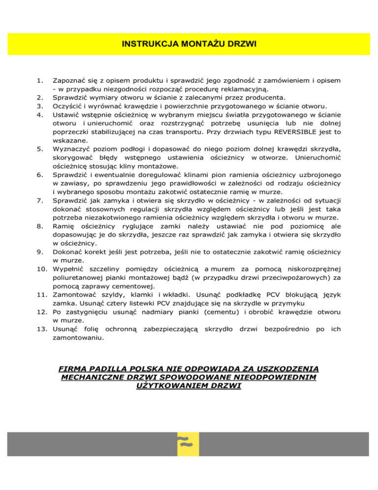INSTRUKCJA MONTAŻU DRZWI 1. 2. 3. 4. 5. 6. 7. 8. 9. 10. 11. 12. 13. Zapoznać się z opisem produktu i sprawdzić jego zgodność z zamówieniem i opisem - w przypadku niezgodności rozpocząć procedurę reklamacyjną. Sprawdzić wymiary otworu w ścianie z zalecanymi przez producenta. Oczyścić i wyrównać krawędzie i powierzchnie przygotowanego w ścianie otworu. Ustawić wstępnie ościeżnicę w wybranym miejscu światła przygotowanego w ścianie otworu i unieruchomić oraz rozstrzygnąć potrzebę usunięcia lub nie dolnej poprzeczki stabilizującej na czas transportu. Przy drzwiach typu REVERSIBLE jest to wskazane. Wyznaczyć poziom podłogi i dopasować do niego poziom dolnej krawędzi skrzydła, skorygować błędy wstępnego ustawienia ościeżnicy w otworze. Unieruchomić ościeżnicę stosując kliny montażowe. Sprawdzić i ewentualnie doregulować klinami pion ramienia ościeżnicy uzbrojonego w zawiasy, po sprawdzeniu jego prawidłowości w zależności od rodzaju ościeżnicy i wybranego sposobu montażu zakotwić ostatecznie ramię w murze. Sprawdzić jak zamyka i otwiera się skrzydło w ościeżnicy - w zależności od sytuacji dokonać stosownych regulacji skrzydła względem ościeżnicy lub jeśli jest taka potrzeba niezakotwionego ramienia ościeżnicy względem skrzydła i otworu w murze. Ramię ościeżnicy ryglujące zamki należy ustawiać nie pod poziomicę ale dopasowując je do skrzydła, jeszcze raz sprawdzić jak zamyka i otwiera się skrzydło w ościeżnicy. Dokonać korekt jeśli jest potrzeba, jeśli nie to ostatecznie zakotwić ramię ościeżnicy w murze. Wypełnić szczeliny pomiędzy ościeżnicą a murem za pomocą niskorozprężnej poliuretanowej pianki montażowej bądź (w przypadku drzwi przeciwpożarowych) za pomocą zaprawy cementowej. Zamontować szyldy, klamki i wkładki. Usunąć podkładkę PCV blokującą język zamka. Usunąć cztery listewki PCV znajdujące się na skrzydle w przymyku Po zastygnięciu usunąć nadmiary pianki (cementu) i obrobić krawędzie otworu w murze. Usunąć folię ochronną zabezpieczającą skrzydło drzwi bezpośrednio po ich zamontowaniu. FIRMA PADILLA POLSKA NIE ODPOWIADA ZA USZKODZENIA MECHANICZNE DRZWI SPOWODOWANE NIEODPOWIEDNIM UŻYTKOWANIEM DRZWI