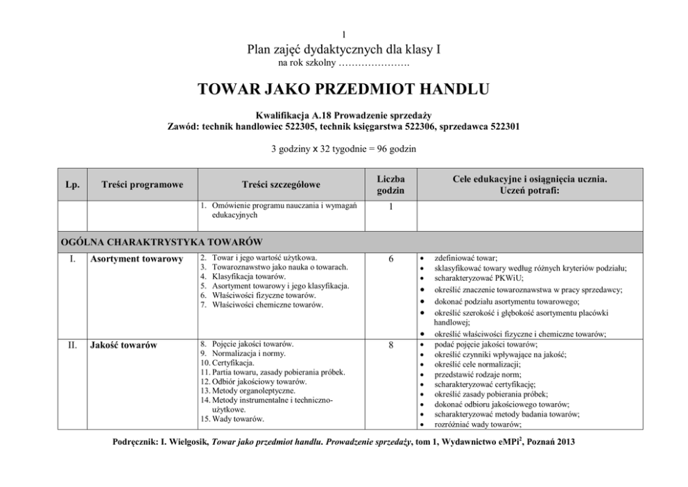 1 Plan zajęć dydaktycznych dla klasy I na rok szkolny …………………. TOWAR JAKO PRZEDMIOT HANDLU Kwalifikacja A.18 Prowadzenie sprzedaży Zawód: technik handlowiec 522305, technik księgarstwa 522306, sprzedawca 522301 3 godziny x 32 tygodnie = 96 godzin Lp. Treści szczegółowe Liczba godzin 1. Omówienie programu nauczania i wymagań edukacyjnych 1 Treści programowe Cele edukacyjne i osiągnięcia ucznia. Uczeń potrafi: OGÓLNA CHARAKTRYSTYKA TOWARÓW I. Asortyment towarowy 2. 3. 4. 5. 6. 7. Towar i jego wartość użytkowa. Towaroznawstwo jako nauka o towarach. Klasyfikacja towarów. Asortyment towarowy i jego klasyfikacja. Właściwości fizyczne towarów. Właściwości chemiczne towarów. 6 II. Jakość towarów 8. Pojęcie jakości towarów. 9. Normalizacja i normy. 10. Certyfikacja. 11. Partia towaru, zasady pobierania próbek. 12. Odbiór jakościowy towarów. 13. Metody organoleptyczne. 14. Metody instrumentalne i technicznoużytkowe. 15. Wady towarów. 8 zdefiniować towar; sklasyfikować towary według różnych kryteriów podziału; scharakteryzować PKWiU; określić znaczenie towaroznawstwa w pracy sprzedawcy; dokonać podziału asortymentu towarowego; określić szerokość i głębokość asortymentu placówki handlowej; określić właściwości fizyczne i chemiczne towarów; podać pojęcie jakości towarów; określić czynniki wpływające na jakość; określić cele normalizacji; przedstawić rodzaje norm; scharakteryzować certyfikację; określić zasady pobierania próbek; dokonać odbioru jakościowego towarów; scharakteryzować metody badania towarów; rozróżniać wady towarów; Podręcznik: I. Wielgosik, Towar jako przedmiot handlu. Prowadzenie sprzedaży, tom 1, Wydawnictwo eMPi2, Poznań 2013 2 III. Magazynowanie i transport towarów 16. Magazyn – pojęcie i zadania. 17. Wyposażenie magazynów. 18. Czynniki obniżające jakość towarów podczas przechowywania. 19. Zmiany zachodzące podczas przechowywania. 20. Ubytki towarowe. Szkodniki magazynowe. 21. Transport towarów. 6 IV. Opakowania towarów 22. Funkcje i klasyfikacje opakowań. 23. Charakterystyka wybranych opakowań. 24. Nowoczesne systemy pakowania. 25. Odpady opakowaniowe. 4 IX. Oznakowanie towarów 6 X. Konserwacja towarów 26. Znakowanie opakowań transportowych. 27. Znakowanie opakowań jednostkowych. 28. Charakterystyka wybranych znaków towarowych. 29. Charakterystyka wybranych znaków towarowych. 30. Znakowanie towarów kodami kreskowymi. 31. Odczytywanie znaków na opakowaniach towarów – ćwiczenia. 32. Znaczenie i podział konserwacji. 33. Konserwacja metodami fizycznymi. 34. Konserwacja metodami chemicznymi. 35. Konserwacja metodami fizyko-chemicznymi. 36. Konserwacja towarów metodami biologicznymi. 37. Nowoczesne i skojarzone metody konserwacji. 38. Konserwacja artykułów nieżywnościowych. 7 przedstawić zasady przechowywania towarów w magazynie; określić wpływ poszczególnych czynników na przechowywane towary; scharakteryzować zmiany zachodzące podczas przechowywania; zdefiniować pojęcie ubytków towarowych; dokonać podziału ubytków towarowych i podać przyczyny ich powstawania; dokonać podziału transportu; określić cechy środka transportu; określić warunki transportu towarów; omówić funkcje opakowań; sklasyfikować opakowania według różnych kryteriów; scharakteryzować poszczególne rodzaje opakowań; dobrać opakowanie do konkretnego towaru; wskazać nowe trendy w opakowalnictwie; określić wpływ opakowań na środowisko; zaproponować sposoby ograniczania odpadów opakowaniowych; określić znaczenie znakowania towarów; sklasyfikować znaki towarowe; przedstawić budowę kodu kreskowego i jego znaczenie; przeanalizować oznakowanie na wybranych towarach. podać cel konserwacji towarów; scharakteryzować podstawowe metody konserwacji towarów żywnościowych i nieżywnościowych; określić wpływ konserwacji na wartość odżywczą żywności; zaproponować metodę konserwacji do konkretnych towarów; podać nowe trendy w zakresie konserwacji towarów; Podręcznik: I. Wielgosik, Towar jako przedmiot handlu. Prowadzenie sprzedaży, tom 1, Wydawnictwo eMPi2, Poznań 2013 3 CHARAKTERYSTYKA TOWAROZNWACZA ŻYWNOŚCI I. II. III. Ogólna charakterystyka żywności Mleko i przetwory mleczne Mięso i przetwory mięsne IV. Drób i przetwory drobiowe. Jaja V. Ryby i przetwory rybne 39. Podstawowe pojęcia związane z żywnością. 40. Klasyfikacja żywności. 41. Podział składników pokarmowych występujących w żywności. 42. Charakterystyka składników odżywczych. 43. Charakterystyka składników odżywczych. 44. Wartość energetyczna i odżywcza. 45. Bezpieczeństwo żywności 46. Znakowanie żywności. 47. Ogólna charakterystyka mleka. 48. Śmietana i śmietanka. 49. Charakterystyka wybranych napojów mlecznych. 50. Sery twarogowe. 51. Sery podpuszczkowe. 52. Sery topione. 53. Charakterystyka masła. 54. Koncentraty mleczne. 55. Ogólna charakterystyka mięsa. 56. Podział tusz zwierzęcych. 57. Charakterystyka wybranych przetworów mięsnych. 58. Charakterystyka wybranych przetworów mięsnych. 59. Dziczyzna i inne mięsa w obrocie towarowym. 60. Ogólna charakterystyka drobiu. 61. Przetwory drobiowe. 62. Charakterystyka jaj. 8 63. Ogólna charakterystyka ryb. 64. Charakterystyka wybranych przetworów rybnych. 65. Charakterystyka „owoców morza”. 8 podać definicję podstawowych pojęć związanych z żywnością; sklasyfikować żywność; scharakteryzować podstawowe składniki odżywcze; podać przykłady dodatków do żywności; scharakteryzować systemy zapewnienia jakości żywności; określić zasady znakowania żywności; wykazać znaczenie mleka w odżywianiu człowieka; scharakteryzować produkty mleczne; określić warunki przechowywania mleka i jego przetworów; zaprezentować nowości w asortymencie produktów mlecznych; dokonać poradnictwa przy sprzedaży; przedstawić znaczenie mięsa w odżywianiu czło