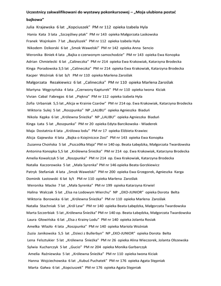 Uczestnicy zakwalifikowani do wystawy pokonkursowej – „Moja ulubiona postać bajkowa” Julia Krajewska 6 lat „Kopciuszek” PM nr 112 opieka Izabela Hyla Hania Kata 3 lata „Szczęśliwy ptak” PM nr 143 opieka Małgorzata Laskowska Franek Wajnkaim 7 lat „Bazyliszek” PM nr 112 opieka Izabela Hyla Nikodem Dzikorski 6 lat „Smok Wawelski” PM nr 142 opieka Anna Sencio Weronika Biniek 4 lata „Bajka o czerwonym samochodzie” PM nr 143 opieka Ewa Konopka Adrian Chmielecki 6 lat „Calineczka” PM nr 214 opieka Ewa Krakowiak, Katarzyna Brodecka Kinga Poradowska 3,5 lat „Calineczka” PM nr 214 opieka Ewa Krakowiak, Katarzyna Brodecka Kacper Woźniak 6 lat b/t PM nr 110 opieka Marlena Zaroślak Małgorzata Rezakiewicz 6 lat „Calineczka” PM nr 110 opieka Marlena Zaroślak Martyna Węgrzyńska 4 lata „Czerwony Kapturek” PM nr 110 opieka Iwona Kiciak Vivian Cabal Fabregas 6 lat „Piękna” PM nr 112 opieka Izabela Hyla Zofia Urbaniak 5,5 lat „Alicja w Krainie Czarów” PM nr 214 op. Ewa Krakowiak, Katarzyna Brodecka Wiktoria Sulej 5 lat „Roszpunka” NP „LALIBU” opieka Agnieszka Biaduń Nikola Kępka 6 lat „Królewna Śnieżka” NP „LALIBU” opieka Agnieszka Biaduń Kinga Łata 5 lat „Roszpunka” PM nr 20 opieka Edyta Barcikowska - Wiaderek Maja Dostatnia 4 lata „Królowa lodu” PM nr 17 opieka Elżbieta Krawiec Alicja Gajewska 4 lata „Bajka o Księżniczce Zosi” PM nr 143 opieka Ewa Konopka Zuzanna Choińska 5 lat „Pszczółka Maja” PM nr 140 op. Beata Łabędzka, Małgorzata Twardowska Antonina Konopka 5,5 lat „Królewna Śnieżka” PM nr 214 op. Ewa Krakowiak, Katarzyna Brodecka Amelia Kowalczyk 5 lat „Roszpunka” PM nr 214 op. Ewa Krakowiak, Katarzyna Brodecka Natalia Kaczorowska 5 lat „Mała Syrenka” PM nr 146 opieka Beata Gorzkiewicz Patryk Stefaniak 4 lata „Smok Wawelski” PM nr 200 opieka Ewa Grzegorek, Agnieszka Karga Dominik Łastowski 6 lat b/t PM nr 110 opieka Marlena Zaroślak Weronika Macke 7 lat „Mała Syrenka” PM nr 199 opieka Katarzyna Kirwiel Halina Walczak 5 lat „Elsa na Lodowym Wierchu” NP „EKO-JUNIOR” opieka Dorota Belta Wiktoria Borowska 6 lat „Królewna Śnieżka” PM nr 110 opieka Marlena Zaroślak Natalia Stachniak 5 lat „Król Lew” PM nr 140 opieka Beata Łabędzka, Małgorzata Twardowska Marta Szczerbiak 5 lat „Królewna Śnieżka” PM nr 140 op. Beata Łabędzka, Małgorzata Twardowska Laura Głowińska 6 lat „Elsa z Krainy Lodu” PM nr 140 opieka Jolanta Rosiak Amelka Wlazło 4 lata „Roszpunka” PM nr 140 opieka Mariola Woźniak Zuzia Janikowska 5,5 lat „Dzieci z Bullerbyn” NP „EKO-JUNIOR” opieka Dorota Belta Lena Felsztukier 5 lat „Królewna Śnieżka” PM nr 26 opieka Alina Wieczorek, Jolanta Olszewska Sylwia Kucharczyk 5 lat „Gucio” PM nr 204 opieka Monika Garbarczyk Amelia Raźniewska 5 lat „Królewna Śnieżka” PM nr 110 opieka Iwona Kiciak Hanna Wojciechowska 6 lat „Kubuś Puchatek” PM nr 176 opieka Agata Stępniak Marta Gałwa 6 lat „Kopciuszek” PM nr 176 opieka Agata Stępniak Weronika Sekular 3,5 lat „Wąż” PM nr 143 opieka Małgorzata Laskowska Zuzia Uba 3 lata „Calineczka” PM nr 143 opieka Małgorzata Laskowska Filip Pajor 4 lata „Mała Śmieciarka” PM nr 143 opieka Ewa Konopka Julia Drozda 4 lata „Dzwoneczek” PM nr 143 opieka Ewa Konopka Olga Kwaszewska 3 lata „Bajka o kotku i żółtym ptaszku” PM nr 143 opieka Ewa Konopka Julia Schulz 4 lata „Kryształowa Celestia” PM nr 228 opieka Marta Góral Hania Kenig 4 lata „Elza z Krainy Lodu” PM nr 228 opieka Marta Góral Marta Zdanowska 4 lata „Jej Wysokość Zosia” PM nr 228 opieka Marta Góral Igor Skupiński 6 lat „Porwanie Królewny przez Smoki” PM nr 99 op. Alina Rogowska, Edyta Małecka Paulina Jarczyńska 6 lat „Kubuś Puchatek” PM nr 214 op. Katarzyna Brodecka, Ewa Krakowiak Karol Laskowski 5,5 lat „Jaś i Małgosia” PM nr 214 op. Katarzyna Brodecka, Ewa Krakowiak Krystian Dudek 5 lat „Jaś i Małgosia” PM nr 214 op. Katarzyna Brodecka, Ewa Krakowiak Julia Rajch 6 lat „Królewna Śnieżka szuka krasnoludków” PM nr 214 op. K. Brodecka, E. Krakowiak Wiktoria Rybicka 7 lat „Czerwony Kapturek” PM nr 112 opieka Izabela Hyla Martyna Kasprowicz 6 lat „Jaś i Małgosia” PM nr 200 opieka Anna Gacek Oliwia Jatkowska 4 lata „Czerwony Kapturek” PM nr 17 opieka Elżbieta Krawiec Emilia Stępień 6 lat „Kot w butach” PM nr 17 opieka Anna Rakowska, Emilia Mańko Iga Kieszek 6 lat „Kubuś Puchatek i przyjaciele” PM nr 99 op. Alina Rogowska, Edyta Małecka Julia Bednarek 7 lat „Jaś i Małgosia” PM nr 199 opieka Katarzyna Kirwiel Zuzanna Małecka 6 lat „Królewna i Królewicz” PM nr 99 op. Alina Rogowska, Edyta Małecka Alina Krzysztofik 6 lat „Gęsiareczka” PM nr 176 opieka Monika Gmosińska, Kinga Kaleta Ola Chrząszczewska 5 lat „Roszpunka” PM nr 207 opieka Monika Wiśniewska, Paulina Frąc Juliusz Witczak 5 lat „O rybaku i złotej rybce” PM nr 17 op. Joanna Szymczyk, Marta Folwarczyk Aleksandra Jaworska 5 lat „Czerwony Kapturek” PM nr 146 opieka Beata Gorzkiewicz Kaja Walczak 4 lata „Kopciuszek” PM nr 200 opieka Ewa Grzegorek, Agnieszka Karga Alicja Lewandowska 3,5 lat „Kubuś Puchatek” PM nr 207 opieka Iwona Szymczak Jakub Pęcherski 3 lata „Czerwony Kapturek” PM nr 83 opieka Ewa Wielądek Wanda Kędzierska 3 lata „Kopciuszek” PM nr 207 opieka Kamila Gibała, Magdalena Duczek Zosia Kobyłecka 4 lata „Jaś i Małgosia” PM nr 26 opieka Alina Wieczorek, Jolanta Olszewska Kuba Jagodziński 4 lata „Wilk czeka na Czerwonego Kapturka” PM nr 200 opieka Ewa Grzegorek Emilka Kozłowska 4 lata „Kopciuszek” PM nr 143 opieka Ewa Konopka Wiktoria Pawlak 7 lat „Kopciuszek” PM nr 199 opieka Katarzyna Kirwiel Karolina Górska 4 lata „Roszpunka” PM nr 200 opieka Ewa Grzegorek, Agnieszka Karga Maja Dębska 6 lat „Śpiąca Królewna” PM nr 214 opieka Katarzyna Brodecka, Ewa K