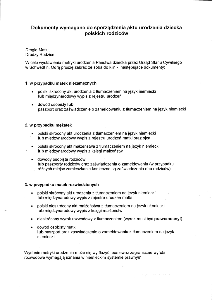 Dokumenty wymagane do sporządzenia £ktu urodzenia dziecka polskich rodziców Drogie Matki, Drodzy Rodzice! W celu wystawienia metryki urodzenia Państwa dziecka przez Urząd Stanu Cywilnego w Schwedt n. Odrą proszę zabrać ze sobą do kliniki następujące dokumenty: 1. w przypadku matek niezamężnych • polski skrócony akt urodzenia z tłumaczeniem na język niemiecki lub międzynarodowy wypis z rejestru urodzeń • dowód osobisty lub paszport oraz zaświadczenie o zameldowaniu z tłumaczeniem na język niemiecki 2. w przypadku mężatek • polski skrócony akt urodzenia z tłumaczeniem na język niemiecki lub międzynarodowy wypis z rejestru urodzeń matki oraz ojca • polski skrócony akt małżeństwa z tłumaczeniem na język niemiecki lub międzynarodowy wypis z księgi małżeństw • dowody osobiste rodziców lub paszporty rodziców oraz zaświadczenia o zameldowaniu (w przypadku różnych miejsc zamieszkania konieczne są zaświadczenia obu rodziców) 3. w przypadku matek rozwiedzionych • polski skrócony akt urodzenia z tłumaczeniem na język niemiecki lub międzynarodowy wypis z rejestru urodzeń matki • polski nieskrócony akt małżeństwa z tłumaczeniem na język niemiecki lub międzynarodowy wypis z księgi małżeństw • nieskrócony wyrok rozwodowy z tłumaczeniem (wyrok musi być prawomocny!) • dowód osobisty matki lub paszport oraz zaświadczenie o zameldowaniu z tłumaczeniem na język niemiecki Wydanie metryki urodzenia może się wydłużyć, ponieważ zagraniczne wyroki rozwodowe wymagają uznania w niemieckim systemie prawnym. 4. w przypadku wdów f • polski skrócony akt urodzenia z tłumaczeniem na język niemiecki lub międzynarodowy wypis z rejestru urodzeń matki • polski nieskrócony akt małżeństwa z tłumaczeniem na język niemiecki lub międzynarodowy wypis z księgi małżeństw • polski nieskrócony akt zgonu z tłumaczeniem na język niemiecki lub międzynarodowy wypis z księgi zgonów • dowód osobisty lub paszport oraz zaświadczenie o zameldowaniu z tłumaczeniem na język niemiecki Informacje dotyczące uznania ojcostwa Jeżeli dziecko zostało urodzone przez kobietę niezamężną, rozwiedzioną lub wdowę ojciec dziecka zostanie wpisany do metryki urodzenia dziecka wyłącznie po uznaniu ojcostwa w stosunku do tego dziecka. Jeżeli w chwili narodzin dziecka rodzice nie posiadają odpowiedniego dokumentu, uznania ojcostwa moża dokonać w Urzędzie Stanu Cywilnego w Schwedt n. Odrą po uiszczeniu opłaty. W tym celu należy dodatkowo dostarczyć następujące dokumenty: • skrócony polski akt urodzenia lub międzynarodowy wypis z rejestru urodzeń ojca • dowód osobisty lub paszport oraz zaświadczenie o zameldowaniu z tłumaczeniem na język niemiecki Ponieważ uznanie ojcostwa następuje według prawa polskiego, zaświadczenie o uznaniu ojcostwa zostanie przesłane do urzędu powiatowego w Prenzlau. W tym przypadku wydanie aktu urodzenia opóźni się o kilka dni. UWAGA: Wszystkie tłumaczenia muszą być sporządzone przez tłumacza przysięgłego. Wszystkie matki oraz wszyscy rodzice proszeni są o umówienie z pracownikiem USC terminu spotkania (telefonicznie lub osobiście, Tel. +49 3332 446 833 lub +49 3332 446 832 lub +49 3332 446 830). Złożenie wymaganych dokumentów w Urzędzie Stanu Cywilnego w Schwedt jest możliwe jeszcze przed poświadczeniem narodzin dziecka. Jeżeli nie mówicie Państwo w języku niemieckim w stopniu komunikatywnym, należy na wyznaczony termin przyprowadzić tłumacza! Z poważaniem Urząd Stanu Cywilnego w Schwedt n. Odrą