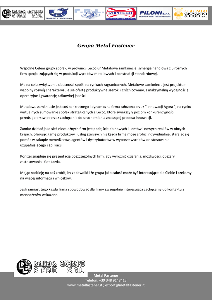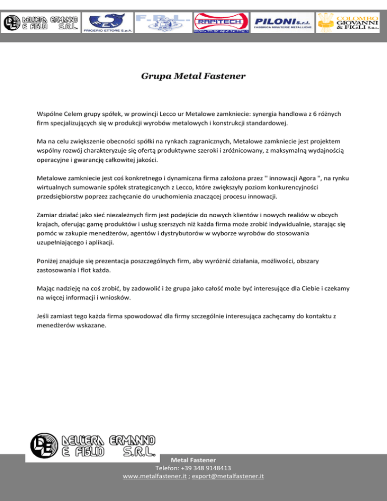 Grupa Metal Fastener Wspólne Celem grupy spółek, w prowincji Lecco ur Metalowe zamkniecie: synergia handlowa z 6 różnych firm specjalizujących się w produkcji wyrobów metalowych i konstrukcji standardowej. Ma na celu zwiększenie obecności spółki na rynkach zagranicznych, Metalowe zamkniecie jest projektem wspólny rozwój charakteryzuje się ofertą produktywne szeroki i zróżnicowany, z maksymalną wydajnością operacyjne i gwarancję całkowitej jakości. Metalowe zamkniecie jest coś konkretnego i dynamiczna firma założona przez '' innowacji Agora ", na rynku wirtualnych sumowanie spółek strategicznych z Lecco, które zwiększyły poziom konkurencyjności przedsiębiorstw poprzez zachęcanie do uruchomienia znaczącej procesu innowacji. Zamiar działać jako sieć niezależnych firm jest podejście do nowych klientów i nowych realiów w obcych krajach, oferując gamę produktów i usług szerszych niż każda firma może zrobić indywidualnie, starając się pomóc w zakupie menedżerów, agentów i dystrybutorów w wyborze wyrobów do stosowania uzupełniającego i aplikacji. Poniżej znajduje się prezentacja poszczególnych firm, aby wyróżnić działania, możliwości, obszary zastosowania i flot każda. Mając nadzieję na coś zrobić, by zadowolić i że grupa jako całość może być interesujące dla Ciebie i czekamy na więcej informacji i wniosków. Jeśli zamiast tego każda firma spowodować dla firmy szczególnie interesująca zachęcamy do kontaktu z menedżerów wskazane. Metal Fastener Telefon: +39 348 9148413 www.metalfastener.it ; [email protected] DELL'ERA ERMANNO & F. S.r.l. Została założona w 1924 roku jako firma specjalizująca się w produkcji śrub drukowanych. Zdjęcia powyżej są tylko przykładem kolektora produkcji oferowanych przez firmę: Metal Fastener Telefon: +39 348 9148413 www.metalfastener.it ; [email protected] Z biegiem lat, wprowadzenie zakładów produkcyjnych coraz bardziej zautomatyzowane mogą osiągnąć roczną produkcję 500 milionów sztuk. Produkcja obejmuje specjalne śruby do projektowania i specjalne standardowe. UNI EN ISO 9001: 2000 oraz automatyczny produkty kontroli obrabianego przedmiotu pozwala nam zagwarantować braku wad dostarczonych przez nas części (50 ppm). Maszyny: Ilość Opis urządzenia 13 Macchine stampatrici doppio colpo Macchine multistazione (3‐4 MATRICI) Macchine per il controllo ottico dei pezzi (garanzia zero difetti) 2 2 Zakres Maksymalna długość CARLO SALVI 2,5 M – M10 80 mm SACMA M4 – M10 65 mm FESTO e DYMAC Controllo dimensionale,presenza filetto e scarto pezzi estranei Materiały: Stali w niskich i wysokich węgla i 12,9 cl.4.8-5.8-6.8-8.8-10.9 A2 stal nierdzewna AISI 304, AISI 430 mosiądz miedź Firma jest w stanie zaoferować swoim klientom zarządzanie dowolnym obróbki powierzchni dostarczającej artykuły Ukończony oddany do użytku. Oprócz ogniowe "standard" Firma współpracuje z dostawcami na zabiegi takie jak: Geomet, Delta Protekt, cynk nikiel, cynk, żelazo, ... Paolo Dell'Era via Santa Vecchia, 82 23868 Valmadrera LC tel. +39 0341 550247 fax +39 0341 551364 www.delleraviterie.com [email protected] Metal Fastener Telefon: +39 348 9148413 www.metalfastener.it ; [email protected] FRIGERIO ETTORE SPA Firma została założona w 1948 roku. Produkcja obejmuje mały metal i zatrzaski i formowanie na zimno z blachy ze specyfikacją klienta. To buduje i projektuje wnętrza foremek. W szczególności firma jest w stanie zaoferować szczególności w plasterkach, formowane, składane i spawane, ze wszystkimi dodatkowymi procesami odpowiednich dla zapewnienia, aby klient zakończył produktów coraz bardziej złożonych. Parco Macchine: Metal Fastener Telefon: +39 348 9148413 www.metalfastener.it ; [email protected] Metal Fastener Telefon: +39 348 9148413 www.metalfastener.it ; [email protected] Maszyny: Maszyny obejmuje pras mechanicznych podwójne pionowe z automatycznym podajnikiem z taśmy z mocą od 100 do 500 ton., Z planami pracy do 2400 mm i pras hydraulicznych i mechanicznych, podwójne kolumny, o mocy do 400 ton w procesach produkcyjnych ustawić okresach wzrostu podręcznik. Szeroka gama urządzeń przeznaczonych zbudowany w czasie, należy podać "know-how", potrzebnych do pracy i realizacji złożonych procesów produkcyjnych, szczególnie trwałych i efektywnych. Firma jest szczególnie znana w Europie do realizacji procesów spawania krytycznych. Flota: - Spawanie Projekcja z elektroniczną kontrolą parametrów spawania; - Spawanie punktowe, projekcja jednofazowe, trójfazowe, - Systemy spawania łukowego Robotic. Mocy do 600 kW. Co do obróbki powierzchni, firma posiada flotę wysoko wyspecjalizowanych dostawców i certyfikowane dla różnych rodzajów powłok ochronnych. Po zakończeniu usługi oferowanej klientowi Frigerio oferuje obróbki mechanicznej i zespołów dodatkowych celu zagwarantowania gotowego produktu jak najwięcej. Sprzęt i maszyny montażowe (także specjalnie zaprojektowane i przewidziane dla pojedynczych procesów przemysłowych) zostały zaprojektowane i zbudowane wewnętrznie. Flaminia Frigerio FRIGERIO ETTORE SPA Via Risorgimento 9 23900 LECCO/ITALY tel. +39 0341 272211 fax. +39 0341 282045 [email protected] www.frigerioettore.com Metal Fastener Telefon: +39 348 9148413 www.metalfastener.it ; [email protected] F.R.L. Srl Przez ponad 100 lat produkcja małego metalu jest przedmiotem działalności tej spółki, poważnego i profesjonalnego.Zabytkowe firma, której tradycja jakości i efektywności zostało przekazane z pokolenia na pokolenie. Podkładki, podkładki sprężynowe oraz systemów mocowania to tylko niektóre z elementów w tym zbiorze. Metal Fastener Telefon: +39 348 9148413 www.metalfastener.it ; [email protected] Maszyny: Ilość Opis urządzenia Prasy tonażu 1 Manzoni Presse 100 t. 3 Manzoni Presse 80 t. 3 San Giacomo 50 t. 1 Manzoni Presse 40 t. 3 San Giacomo 40 t. 1 Invernizzi Presse 40 t. 1 San Giacomo 30 t.