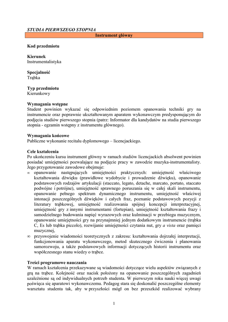 STUDIA PIERWSZEGO STOPNIA Instrument główny Kod przedmiotu Kierunek Instrumentalistyka Specjalność Trąbka Typ przedmiotu Kierunkowy Wymagania wstępne Student powinien wykazać się odpowiednim poziomem opanowania techniki gry na instrumencie oraz poprawnie ukształtowanym aparatem wykonawczym predysponującym do podjęcia studiów pierwszego stopnia (patrz: Informator dla kandydatów na studia pierwszego stopnia - egzamin wstępny z instrumentu głównego). Wymagania końcowe Publiczne wykonanie recitalu dyplomowego – licencjackiego. Cele kształcenia Po ukończeniu kursu instrument główny w ramach studiów licencjackich absolwent powinien posiadać umiejętności pozwalające na podjęcie pracy w zawodzie muzyka-instrumentalisty. Jego przygotowanie zawodowe obejmuje: • opanowanie następujących umiejętności praktycznych: umiejętność właściwego kształtowania dźwięku (prawidłowe wydobycie i prowadzenie dźwięku), opanowanie podstawowych rodzajów artykulacji (staccato, legato, detache, marcato, portato, staccato podwójne i potrójne), umiejętność sprawnego poruszania się w całej skali instrumentu, opanowanie pełnego spektrum dynamicznego instrumentu, umiejętność właściwej intonacji poszczególnych dźwięków i całych fraz, poznanie podstawowych pozycji z literatury trąbkowej, umiejętność realizowania spójnej koncepcji interpretacyjnej, umiejętność gry z innymi instrumentami (fortepian), umiejętność kształtowania frazy i samodzielnego budowania napięć wyrazowych oraz kulminacji w przebiegu muzycznym, opanowanie umiejętności gry na przynajmniej jednym dodatkowym instrumencie (trąbka C, Es lub trąbka piccolo), rozwijanie umiejętności czytania nut, gry a vista oraz pamięci muzycznej, • przyswojenie wiadomości teoretycznych z zakresu: kształtowania dojrzałej interpretacji, funkcjonowania aparatu wykonawczego, metod skutecznego ćwiczenia i planowania samorozwoju, a także podstawowych informacji dotyczących historii instrumentu oraz współczesnego stanu wiedzy o trąbce. Treści programowe nauczania W ramach kształcenia przekazywane są wiadomości dotyczące wielu aspektów związanych z grą na trąbce. Kolejność oraz nacisk położony na opanowanie poszczególnych zagadnień uzależnione są od indywidualnych potrzeb studenta. W pierwszym roku nauki więcej uwagi poświęca się aparatowi wykonawczemu. Pedagog stara się doskonalić poszczególne elementy warsztatu studenta tak, aby w przyszłości mógł on bez przeszkód realizować wybrany 1 materiał muzyczny. Praca nad aparatem wykonawczym złożona jest zarówno z elementów typowo dydaktycznych, jak i z części analitycznej potrzebnej do rozwijania u studenta mechanizmów samokontroli. Doskonalenie techniki następuje poprzez realizację gam i etiud z uwzględnieniem indywidualnych problemów studenta. W trakcie pracy nad repertuarem rozwijana jest wyobraźnia muzyczna ucznia. Pedagog stara się zachęcić go do samodzielnego kształtowania koncepcji interpretacyjnej, zgodnej jednak z powszechnie przestrzeganymi kanonami. W celu uzyskania właściwej i świadomie uformowanej interpretacji, pedagog przedstawia studentowi wiedzę dotyczącą historii trąbki, poszczególnych utworów i ich twórców oraz ogólnie przyjętych zasad wykonawczych. Na zajęciach z akompaniamentem nauczyciel omawia problematykę związaną z graniem w zespole. Zwraca także na bieżąco uwagę na elementy, które destabilizują brzmienie zespołu oraz burzą ustaloną wcześniej koncepcję interpretacji. Istotnym elementem edukacji jest praca nad właściwą emisją dźwięku. Pedagog prezentuje różne sposoby kreowania barwy i charakteru dźwięku, wskazując również, jak poszczególne odcienie i barwy dźwięku stosować w praktyce. Przy okazji realizacji kompozycji XX-wiecznej omawiane są współczesne techniki wykonawcze. W trakcie kształcenia poruszana jest także problematyka związana z tremą oraz właściwym zachowaniem się na scenie. Efekty kształcenia (uczenia się) po ukończeniu przedmiotu - w zakresie wiedzy • Posiada znajomość podstawowego repertuaru związanego z własną specjalnością (K1_W02). - w zakresie umiejętności • Dysponuje umiejętnościami potrzebnymi do tworzenia i realizowania własnych koncepcji artystycznych (K1_U01). • Jest świadomy sposobów wykorzystywania swej intuicji, emocjonalności i wyobraźni w obszarze ekspresji artystycznej (K1_U02). • Posiada znajomość i umiejętność wykonywania reprezentatywnego repertuaru związanego z głównym kierunkiem studiów (K1_U04). • Posiada umiejętność wykorzystywania wiedzy dotyczącej podstawowych kryteriów stylistycznych wykonywanych utworów (K1_U05). • Posiada umiejętność właściwego odczytania tekstu nutowego, biegłego i pełnego przekazania materiału muzycznego, zawartych w utworze idei i jego formy (K1_U09). • Opanował warsztat techniczny potrzebny do profesjonalnej prezentacji muzycznej i ma świadomość problemów specyficznych dla danego instrumentu (K1_U10). • Poprzez opanowanie efektywnych technik ćwiczenia wykazuje umiejętność doskonalenia warsztatu technicznego poprzez samodzielną pracę (K1_U12). • Posiada umiejętność rozumienia i kontrolowania struktur rytmicznych, metrorytmicznych, aspektów dotyczących aplikatury, frazowania, struktury harmonicznej itp. opracowywanych utworów (K1_U13). - w zakresie kompetencji społecznych • Realizuje własne koncepcje i działania artystyczne oparte na zróżnicowanej stylistyce, wynikającej z niezależnego wykorzystania wyobraźni, ekspresji i intuicji (K1_K02). Metody nauczania Wykład, zajęcia indywidualne. 2 Nakład pracy studenta potrzebny do osiągnięcia efektów uczenia się ROK SEMESTR Punkty ECTS Ilość godzin w semestrze Rodzaj zaliczenia LEGENDA I II III 1 2 3 4 5 6 8 8 8 8 10 12 30 30 30 30 30 30 egz egz egz egz egz zal/ed zal – zaliczony; zs – zaliczenie ze stopniem; egz – egzamin