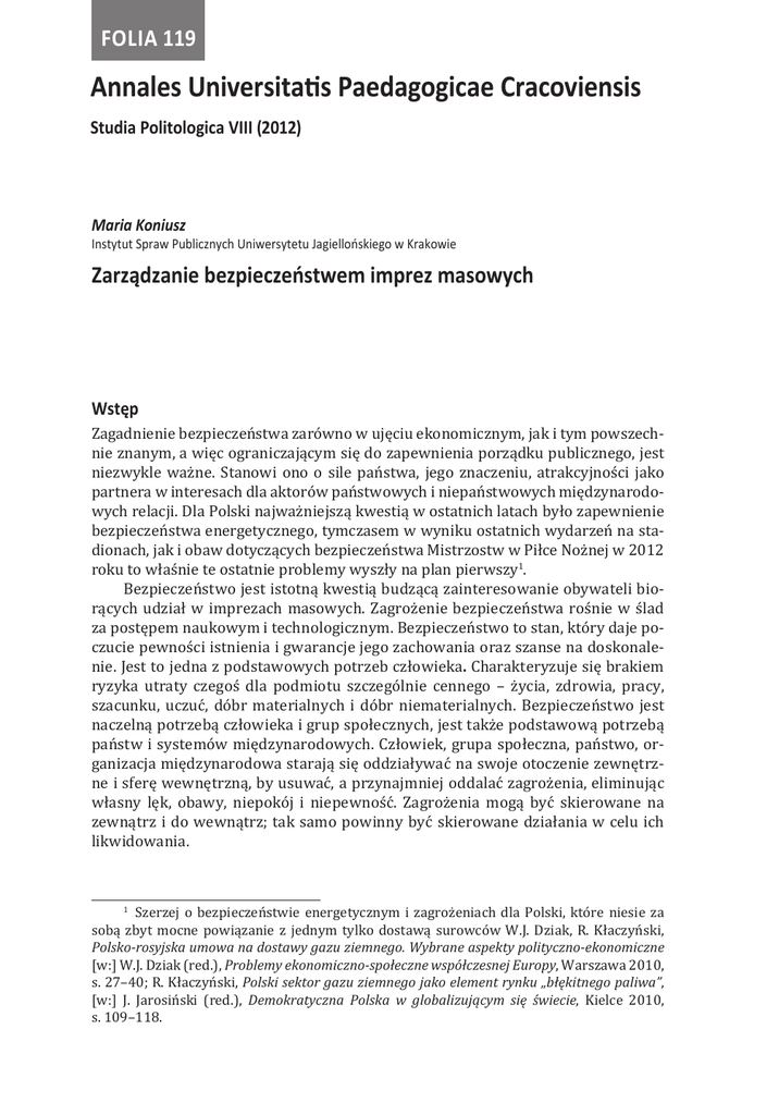 Folia 119 Annales Universitatis Paedagogicae Cracoviensis Studia Politologica VIII (2012) Maria Koniusz Instytut Spraw Publicznych Uniwersytetu Jagiellońskiego w Krakowie Zarządzanie bezpieczeństwem imprez masowych Wstęp Zagadnienie bezpieczeństwa zarówno w ujęciu ekonomicznym, jak i tym powszechnie znanym, a więc ograniczającym się do zapewnienia porządku publicznego, jest niezwykle ważne. Stanowi ono o sile państwa, jego znaczeniu, atrakcyjności jako partnera w interesach dla aktorów państwowych i niepaństwowych międzynarodowych relacji. Dla Polski najważniejszą kwestią w ostatnich latach było zapewnienie bezpieczeństwa energetycznego, tymczasem w wyniku ostatnich wydarzeń na stadionach, jak i obaw dotyczących bezpieczeństwa Mistrzostw w Piłce Nożnej w 2012 roku to właśnie te ostatnie problemy wyszły na plan pierwszy1. Bezpieczeństwo jest istotną kwestią budzącą zainteresowanie obywateli biorących udział w imprezach masowych. Zagrożenie bezpieczeństwa rośnie w ślad za postępem naukowym i technologicznym. Bezpieczeństwo to stan, który daje poczucie pewności istnienia i gwarancje jego zachowania oraz szanse na doskonalenie. Jest to jedna z podstawowych potrzeb człowieka. Charakteryzuje się brakiem ryzyka utraty czegoś dla podmiotu szczególnie cennego – życia, zdrowia, pracy, szacunku, uczuć, dóbr materialnych i dóbr niematerialnych. Bezpieczeństwo jest naczelną potrzebą człowieka i grup społecznych, jest także podstawową potrzebą państw i systemów międzynarodowych. Człowiek, grupa społeczna, państwo, organizacja międzynarodowa starają się oddziaływać na swoje otoczenie zewnętrzne i sferę wewnętrzną, by usuwać, a przynajmniej oddalać zagrożenia, eliminując własny lęk, obawy, niepokój i niepewność. Zagrożenia mogą być skierowane na zewnątrz i do wewnątrz; tak samo powinny być skierowane działania w celu ich likwidowania. 1 Szerzej o bezpieczeństwie energetycznym i zagrożeniach dla Polski, które niesie za sobą zbyt mocne powiązanie z jednym tylko dostawą surowców W.J. Dziak, R. Kłaczyński, Polsko-rosyjska umowa na dostawy gazu ziemnego. Wybrane aspekty polityczno-ekonomiczne [w:] W.J. Dziak (red.), Problemy ekonomiczno-społeczne współczesnej Europy, Warszawa 2010, s. 27–40; R. Kłaczyński, Polski sektor gazu ziemnego jako element rynku „błękitnego paliwa”, [w:] J. Jarosiński (red.), Demokratyczna Polska w globalizującym się świecie, Kielce 2010, s. 109–118. Zarządzanie bezpieczeństwem imprez masowych [177] Rola policji w zabezpieczeniu imprez masowych Głównym organem w obszarze bezpieczeństwa publicznego skierowanym do zadań, których celem jest przeciwdziałanie aktom chuligańskim i zapewnienie bezpiecznego przebiegu imprezy, jest policja. Aby rozpocząć rozważania na temat działań policji w zakresie zabezpieczenia imprez masowych, należy zdefiniować określenie „impreza masowa”. Według Ustawy o bezpieczeństwie imprez masowych (zwanej w dalszej części Ustawą), impreza masowa to taka, która skupia nie mniej niż 1000 osób w obiekcie niebędącym budynkiem (może to być np. stadion). Jeśli natomiast impreza odbywa się w budynku umożliwiającym zorganizowanie imprezy masowej lub w hali sportowej – liczba osób nie może być mniejsza niż 3002. Zgodnie z art. 5 pkt 3 rozdziału 2 Ustawy o bezpieczeństwie imprez masowych Obowiązek zabezpieczenia imprezy masowej spoczywa na organizatorze, a w zakresie określonym w tej ustawie i innych przepisach także na: wójcie, burmistrzu, prezydencie miasta, wojewodzie, Policji, Państwowej Straży Pożarnej i innych jednostkach organizacyjnych ochrony przeciwpożarowej, służbach odpowiedzialnych za bezpieczeństwo i porządek publiczny na obszarach kolejowych, służbie zdrowia, a w razie potrzeby także innych właściwych służbach i organach3. Cytowany powyżej artykuł 5, jak również cała Ustawa o bezpieczeństwie imprez masowych stanowią główną podstawę prawną działań policji w zakresie zabezpieczenia imprez o charakterze masowym. Do uwarunkowań prawnych działań policji w zakresie zabezpieczenia imprez masowych oprócz wspomnianej Ustawy należą: –– Ustawa z dnia 6 kwietnia 1990 r. o Policji (Dz.U. z 2002 r. nr 7, poz. 58, z późn. zm.), –– Zarządzenie nr 213 Komendanta Głównego Policji z dnia 28 lutego 2007 roku w sprawie metod i form przygotowania i realizacji zadań Policji w przypadkach zagrożenia życia i zdrowia ludzi lub ich mienia albo bezpieczeństwa i porządku publicznego. O liczbie funkcjonariuszy oddelegowanych do zabezpieczenia imprezy masowej decyduje Sztab Policji Komendy Miejskiej. Zabezpieczenia prowadzone są w ramach akcji policyjnych. Za przykład imprez masowych wybrałam tu mecze piłki nożnej odbywające się w obiektach sportowych Krakowa w latach 2006–2010. Tabela 1 przedstawia dane na temat liczby funkcjonariuszy policji zabezpieczających mecze piłki nożnej we wspomnianym okresie. Analiza danych zamieszczonych w tabeli wskazuje na następujące tendencje: –– zmniejszenie liczby policjantów zaangażowanych w zabezpieczenie meczy piłkarskich na terenie Krakowa w roku 2010 o 12% w stosunku do roku 2006; wpłynął na to fakt, że agencje ochrony przejęły uprawnienia policji w zakresie 2 Por. art. 3 pkt 3a, 3b Ustawy o bezpieczeństwie imprez masowych (Dz.U. z 2009 r. nr 62, poz. 504, z późn. zm.). Ibidem. 3 [178] Maria Koniusz zapewnienia bezpieczeństwa na stadionach podczas meczów piłkarskich; powodem może być wzrost kosztów wyposażenia funkcjonariuszy w odpowiedni sprzęt, –– najwyższą od 5 lat liczbę policjantów skierowanych do patroli zabezpieczających przejazdy uczestników imprez masowych – w roku 2010 było ich 1418, a dla porównania w roku 2006 tylko 59; nastąpił więc 24-krotny wzrost w tym zakresie; wzrost ten spowodowany jest znacznym zwiększeniem liczby kibiców „wyjazdowych”, udających si