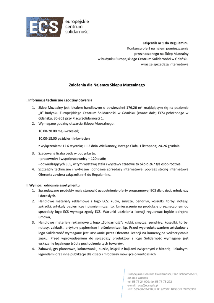 Załącznik nr 1 do Regulaminu Konkursu ofert na najem pomieszczenia przeznaczonego na Sklep Muzealny w budynku Europejskiego Centrum Solidarności w Gdańsku wraz ze sprzedażą internetową Założenia dla Najemcy Sklepu Muzealnego I. Informacje techniczne i godziny otwarcia 1. Sklep Muzealny jest lokalem handlowym o powierzchni 176,26 m² znajdującym się na poziomie „0” budynku Europejskiego Centrum Solidarności w Gdańsku (zwane dalej ECS) położonego w Gdańsku, 80-863 przy Placu Solidarności 1. 2. Wymagane godziny otwarcia Sklepu Muzealnego: 10.00-20.00 maj-wrzesień; 10.00-18.00 październik-kwiecień z wyłączeniem: 1 i 6 stycznia; 1 i 2 dnia Wielkanocy, Bożego Ciała, 1 listopada; 24-26 grudnia. 3. Szacowana liczba osób w budynku to: - pracownicy i współpracownicy – 120 osób; - odwiedzających ECS, w tym wystawę stała i wystawy czasowe to około 267 tyś osób rocznie. 4. Szczegóły techniczne i wytyczne odnośnie sprzedaży internetowej poprzez stronę internetową Oferenta zawiera załącznik nr 6 do Regulaminu. II. Wymogi odnośnie asortymentu 1. Sprzedawane produkty mają stanowić uzupełnienie oferty programowej ECS dla dzieci, młodzieży i dorosłych. 2. Handlowe materiały reklamowe z logo ECS: kubki, smycze, pendrivy, koszulki, torby, notesy, zakładki, artykuły papiernicze i piśmiennicze, itp. Umieszczenie na produkcie przeznaczonym do sprzedaży logo ECS wymaga zgody ECS. Warunki udzielenia licencji regulować będzie odrębna umowa, 3. Handlowe materiały reklamowe z logo „Solidarność”: kubki, smycze, pendrivy, koszulki, torby, notesy, zakładki, artykuły papiernicze i piśmiennicze, itp. Przed wyprodukowaniem artykułów z logo Solidarność wymagane jest uzyskanie przez Oferenta licencji na komercyjne wykorzystanie znaku. Przed wprowadzeniem do sprzedaży produktów z logo Solidarność wymagane jest wskazanie legalnego źródła pochodzenia tych towarów, 4. Zabawki, gry planszowe, kolorowanki, puzzle, książki z bajkami związanymi z historią i lokalnymi legendami oraz inne publikacje dla dzieci i młodzieży mówiące o wartościach Europejskie Centrum Solidarności, Plac Solidarności 1, 80–863 Gdańsk tel. 58 77 24 000; fax 58 77 78 292 e-mail: [email protected] NIP: 583-30-03-226; RIK: 9/2007; REGON: 22050902 demokratycznych, takich jak współpraca, zaufanie, szacunek dla innych, solidarność, wolność; 5. Dedykowane pamiątki z Polski, Pomorza i Miasta Gdańsk, w tym wyroby autorstwa młodych artystów i dizajnerów; 6. Pamiątki związane z wydarzeniami rocznicowymi i wystawami czasowymi organizowanymi przez ECS; 7. Wydawnictwa książkowe i albumowe ECS. Zasady sprzedaży wyrobów własnych ECS regulować będzie odrębna umowa; 8. Wydawnictwa książkowe i albumowe w języku polskim, angielskim, rosyjskim i niemieckim pozostałych wydawców związane z historią współczesną, solidarnością, historią Stoczni Gdańskiej oraz dotyczące sfery społecznej, gospodarczej czy politycznej. 9. Produkty wytwarzane przez polskie i zagraniczne podmioty ekonomii społecznej (m.in. organizacje pozarządowe, spółdzielnie socjalne, zakłady aktywności zawodowej, warsztaty terapii zajęciowej) skonsultowane wcześniej z ECS i wyróżnione z całego asortymentu. 10. Wszystkie sprzedawane artykuły muszą spełniać wymogi najwyższej jakości a produkty przeznaczone dla dzieci posiadać atesty obowiązujące na terenie Unii Europejskiej oraz instrukcję w języku polskim. 11. Zabrania się wprowadzania do sprzedaży: alkoholu, papierosów, środków odurzających, broni oraz przedmiotów obrażających uczucia religijne. 12. ECS zastrzega sobie prawo do żądania wycofania artykułów, które nie spełniają wymogów jakości lub nie są zgodne z misją i programem działalności ECS. III. Pracownicy Sklepu Muzealnego 1. Oferent musi zapewnić odpowiednią liczbę pracowników, aby zapewnić nieprzerwane funkcjonowanie Sklepu Muzealnego w dniach i godzinach określonych w punkcie I.3. 2. Oferent zobowiązany jest w wyposażenie pracowników w strój służbowy według dostarczonego przez ECS projektu. Na stój obowiązkowy składa się koszula i sweter na chłodniejsze dni. Pozostałe części garderoby mają być estetyczne, czyste i schludne. 3. Pracownicy Sklepu Muzealnego muszą co najmniej w stopniu komunikatywnym posługiwać się językiem angielskim, niemieckim lub rosyjskim. 4. Pracownicy Sklepu Muzealnego muszą posiadać wysoką kulturę osobistą i umiejętność szybkiego uczenia. IV. Opłaty 1. Oferent jest zobowiązany do płacenia ECS przez cały okres trwania umowy opłat z tytułu najmu lokalu oraz opłat eksploatacyjnych. Europejskie Centrum Solidarności, Plac Solidarności 1, 80–863 Gdańsk tel. 58 77 24 000; fax 58 77 78 292 e-mail: [email protected] NIP: 583-30-03-226; RIK: 9/2007; REGON: 22050902 2. Opłaty eksploatacyjne wynoszą 16 PLN netto (słownie: szesnaście 00/100 zł) za 1 m2 najmowanej powierzchni. Kwota ta każdorazowo będzie powiększona o należny podatek VAT. 3. ECS będzie uprawniony do corocznej weryfikacji wysokości opłat eksploatacyjnych. W związku z weryfikacją, wysokość opłat eksploatacyjnych może ulec zmianie. 4. ECS w ramach opłaty ryczałtowej zobowiązuje się do ponoszenia wszelkich kosztów w szczególności: opłaty z tytułu zużycia prądu (w częściach wspólnych), opłaty za dostawę wody i odprowadzania ścieków (w częściach wspólnych), opłata za wywóz śmieci, opłata za sieć Internet, opłata za utrzymanie czystości części wspólnej, opłata za ochronę, naprawy, konserwacje i utrzymanie czystości części wspólnych nieruchomości, zakup materiałów gospodarczych i eksploatacyjnych w zakresie obsługi części wspólnych, zarządzanie i administrowanie nieruchomością. 5. Oprócz opłat wymienionych powyżej ECS jest zobowiązany ponosić koszty innych usług świadczonych na jego rzecz przez Wynajmującego tj. a) zużycia energii elektrycznej 