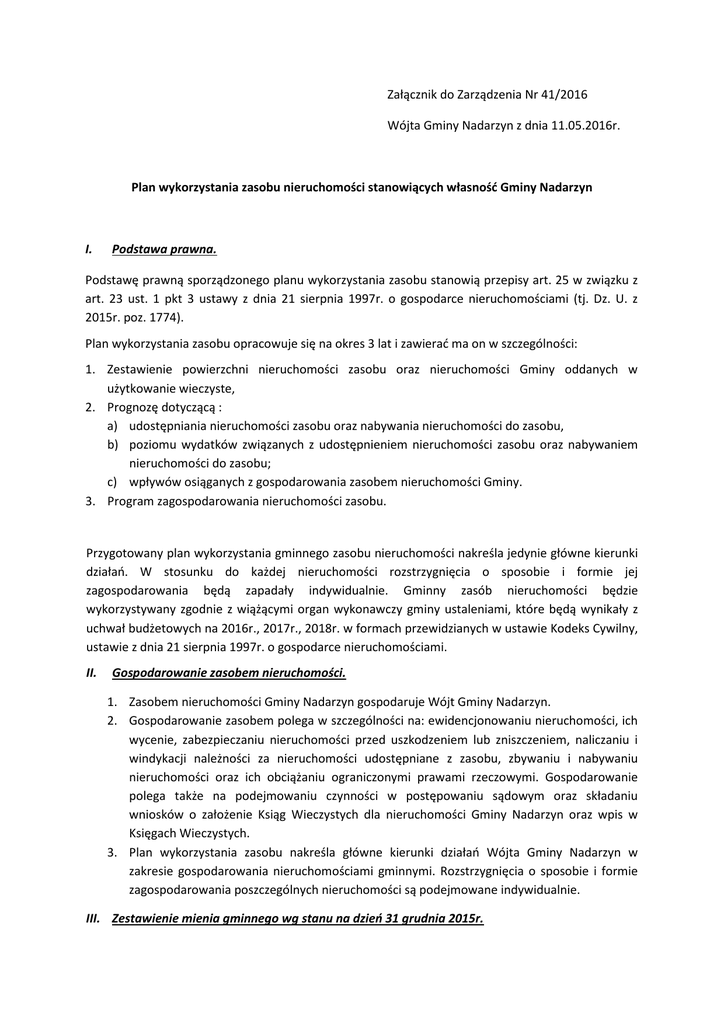 Załącznik do Zarządzenia Nr 41/2016 Wójta Gminy Nadarzyn z dnia 11.05.2016r. Plan wykorzystania zasobu nieruchomości stanowiących własność Gminy Nadarzyn I. Podstawa prawna. Podstawę prawną sporządzonego planu wykorzystania zasobu stanowią przepisy art. 25 w związku z art. 23 ust. 1 pkt 3 ustawy z dnia 21 sierpnia 1997r. o gospodarce nieruchomościami (tj. Dz. U. z 2015r. poz. 1774). Plan wykorzystania zasobu opracowuje się na okres 3 lat i zawierać ma on w szczególności: 1. Zestawienie powierzchni nieruchomości zasobu oraz nieruchomości Gminy oddanych w użytkowanie wieczyste, 2. Prognozę dotyczącą : a) udostępniania nieruchomości zasobu oraz nabywania nieruchomości do zasobu, b) poziomu wydatków związanych z udostępnieniem nieruchomości zasobu oraz nabywaniem nieruchomości do zasobu; c) wpływów osiąganych z gospodarowania zasobem nieruchomości Gminy. 3. Program zagospodarowania nieruchomości zasobu. Przygotowany plan wykorzystania gminnego zasobu nieruchomości nakreśla jedynie główne kierunki działań. W stosunku do każdej nieruchomości rozstrzygnięcia o sposobie i formie jej zagospodarowania będą zapadały indywidualnie. Gminny zasób nieruchomości będzie wykorzystywany zgodnie z wiążącymi organ wykonawczy gminy ustaleniami, które będą wynikały z uchwał budżetowych na 2016r., 2017r., 2018r. w formach przewidzianych w ustawie Kodeks Cywilny, ustawie z dnia 21 sierpnia 1997r. o gospodarce nieruchomościami. II. Gospodarowanie zasobem nieruchomości. 1. Zasobem nieruchomości Gminy Nadarzyn gospodaruje Wójt Gminy Nadarzyn. 2. Gospodarowanie zasobem polega w szczególności na: ewidencjonowaniu nieruchomości, ich wycenie, zabezpieczaniu nieruchomości przed uszkodzeniem lub zniszczeniem, naliczaniu i windykacji należności za nieruchomości udostępniane z zasobu, zbywaniu i nabywaniu nieruchomości oraz ich obciążaniu ograniczonymi prawami rzeczowymi. Gospodarowanie polega także na podejmowaniu czynności w postępowaniu sądowym oraz składaniu wniosków o założenie Ksiąg Wieczystych dla nieruchomości Gminy Nadarzyn oraz wpis w Księgach Wieczystych. 3. Plan wykorzystania zasobu nakreśla główne kierunki działań Wójta Gminy Nadarzyn w zakresie gospodarowania nieruchomościami gminnymi. Rozstrzygnięcia o sposobie i formie zagospodarowania poszczególnych nieruchomości są podejmowane indywidualnie. III. Zestawienie mienia gminnego wg stanu na dzień 31 grudnia 2015r. 1. Nieruchomości stanowiące własność Gminy – 153,3929 ha w tym 112,2146 ha dróg (bez oddanych w dzierżawę, użytkowanie). 2. Nieruchomości w użytkowaniu wieczystym Gminy - 20,9917 ha. 3. Nieruchomości stanowiące współwłasność – 0,8186 ha. 4. Nieruchomości oddane w użytkowanie wieczyste – 15,101 ha. 5. Nieruchomości oddane w użytkowanie – 99,4473 ha. 6. Nieruchomości przekazanych w trwały zarząd (dotyczy jednostek komunalnych nie posiadających osobowości prawnej – przedszkola, biblioteki, domy kultury, ośrodki sportu, gospodarstwa pomocnicze) – nie przekazano. 8. Nieruchomości oddane w dzierżawę (brano pod uwagę powierzchnię całych działek ewidencyjnych nawet w przypadku gdy oddano w dzierżawę tylko część działki) – 12,1915 ha. IV. Nabycie nieruchomości na rzecz Gminy Nadarzyn. Nabywanie nieruchomości na rzecz Gminy w latach 2016-2018 będzie następowało poprzez: 1. Zakup, zamianę, 2. Komunalizację gdzie przedmiotem postępowania jest stwierdzenie własności nieruchomości na rzecz Gminy – dotyczy nieruchomości Skarbu Państwa , 3. Nabywanie na podstawie decyzji administracyjnych – wydanych w trybie art. 73 ustawy z dnia 13 października 1998r. – przepisy wprowadzające ustawy reformujące administrację publiczną), oraz w trybie art. 98 ustawy z dnia 21 sierpnia 1997r. o gospodarce nieruchomościami, 4. Inne czynności prawne jak np. pierwokup, zamianę, nabycie w drodze darowizny. Do gminnego zasobu będą nabywane nieruchomości służące realizacji zadań własnych. Na powiększenie majątku gminnego wpływ mają również przeprowadzane inwestycje. W latach 20162018 nabywanie nieruchomości zaplanowanych w budżecie na poszczególne lata. V. Prognoza dotycząca wykorzystania nieruchomości Gminy. 1. Zbywanie nieruchomości Zbywanie nieruchomości gminnych odbywa się zgodnie z przeznaczeniem w miejscowym planie zagospodarowania przestrzennego. W roku 2016 przewiduje się zbycie nieruchomości w następujących formach: a) W drodze przetargu nieograniczonego − sprzedaż nieruchomości przeznaczonych pod budownictwo usługowe – 4 nieruchomości, b) w drodze bezprzetargowej − sprzedaż lokali mieszkalnych na rzecz najemców – 2 lokale, − zamiana nieruchomości – ( 2 nieruchomości), Ponadto przewiduje się sprzedaż nieruchomości stanowiących własność Gminy Nadarzyn w ramach realizacji wniosków w sprawie ich nabycia oraz decyzji Rady Gminy. 2. Przekształcenie prawa użytkowania wieczystego w prawo własności nieruchomości. a) W latach 2016-2018 realizowane będą wnioski o przekształcenie prawa użytkowania wieczystego w prawo własności nieruchomości zgodnie z aktualnymi przepisami w tym zakresie. b) Na podstawie analizy wniosków złożonych w latach wcześniejszych szacuje się, że przedmiotem przekształcenia prawa użytkowania wieczystego w prawo własności w 2016r. będzie około 5 nieruchomości. c) Zakłada się że w latach 2017-2018 proces przekształceń będzie utrzymywał się na poziomie zbliżonym do roku 2016. 3. Pozostałe formy udostępniania nieruchomości z zasobu. Nieruchomości, które nie będą zagospodarowane na cele inwestycyjne będą udostępniane na warunkach określonych w umowie lub decyzji administracyjnej. W szczególności będą oddawane w dzierżawę, najem, użyczenie lub użytkowanie. VI. Wydatki związane z udostępnieniem nieruchomości z zasobu oraz nabywaniem nieruchomości do zasobu Na podstawie analizy lat poprzed