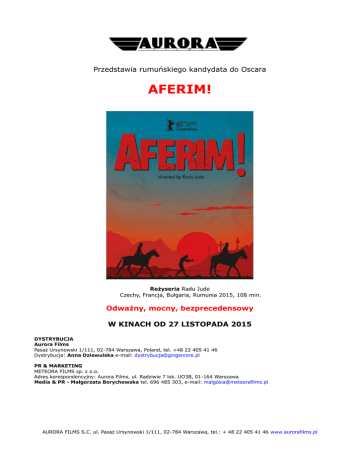 Przedstawia rumuńskiego kandydata do Oscara AFERIM! Reżyseria Radu Jude Czechy, Francja, Bułgaria, Rumunia 2015, 108 min. Odważny, mocny, bezprecedensowy W KINACH OD 27 LISTOPADA 2015 DYSTRYBUCJA Aurora Films Pasaż Ursynowski 1/111, 02-784 Warszawa, Poland, tel. +48 22 405 41 46 Dystrybucja: Anna Dziewulska e-mail: [email protected] PR & MARKETING METEORA FILMS sp. z o.o. Adres korespondencyjny: Aurora Films, ul. Radziwie 7 lok. UO3B, 01-164 Warszawa Media & PR - Małgorzata Borychowska tel. 696 485 303, e-mail: [email protected] AURORA FILMS S.C. ul. Pasaż Ursynowski 1/111, 02-784 Warszawa, tel.: + 48 22 405 41 46 www.aurorafilms.pl AURORA FILMS przedstawia laureata Srebrnego Niedźwiedzia na Berlinale AFERIM! Tytuł oryginalny: Aferim! w reżyserii Radu Jude TWÓRCY FILMU: Reżyseria: Radu Jude Scenariusz: Radu Jude, Florin Lazarescu Zdjęcia: Marius Panduru Montaż: Catalin Cristutiu Kostiumy: Dana Paparuz Dźwięk: Dana Bunescu Producent: Ada Solomon OBSADA: Teodor Corban Costandin Mihai Comănoiu Ionita Toma Cuzin Carfin Alexandru Dabija Iordache Victor Rebengiuc Rzemieślnik Luminiţa Gheorghiu Żona rzemieślnika AURORA FILMS S.C. ul. Pasaż Ursynowski 1/111, 02-784 Warszawa, tel.: + 48 22 405 41 46 www.aurorafilms.pl Nagrody i festiwale: Rumuński kandydat do Oscara! 2015 – Berlinale, Srebrny Niedźwiedź za reżyserię 2015 – Międzynarodowy Festiwal Filmowy w Sofii, Sofia Municipality Award 2015 – Międzynarodowy Festiwal Filmowy w Hong Kongu 2015 – Międzynarodowy Festiwal Filmowy w Wilnie 2015 – Tribeca Film Festival 2015 – IndieLisboa – Międzynarodowy Festiwal Filmów Niezaleznych, Wielka Nagroda Miasta Lisbony, Nagroda Dystrybutorów 2015 – Międzynarodowy Festiwal Filmowy w Transylwanii 2015 – Międzynarodowy Festiwal Filmowy w Sydney 2015 – Międzynarodowy Festiwal Filmowy w Karlowych Warach 2015 – Międzynarodowy Festiwal Filmowy w Taipei 2015 – Nowe Horyzonty 2015 – Międzynarodowy Festiwal Filmowy w Melbourne 2015 – Międzynarodowy Festiwal Filmowy w Sarajewie 2015 – Letnia Akademia Filmowa w Zwierzyńcu 2015 – Międzynarodowy Festiwal Filmowy w Helsinkach 2015 – Międzynarodowy Festiwal Filmowy w Hajfie 2015 – Międzynarodowy Festiwal Filmowy w Vancouver 2015 – Międzynarodowy Festiwal Filmowy w Pusan 2015 – Londyński Festiwal Filmowy 2015 – Mill Valley Film Festival AURORA FILMS S.C. ul. Pasaż Ursynowski 1/111, 02-784 Warszawa, tel.: + 48 22 405 41 46 www.aurorafilms.pl Opis filmu: Rumuński kandydat do Oscara w kategorii najlepszy film nieanglojęzyczny, który doceniło jury Berlinale, przyznając mu statuetką Srebrnego Niedźwiedzia za reżyserię. Radu Jude podzielił się nią z nagrodzoną ex aequo Małgorzatą Szumowską za „Body/Ciało”. Wołoszczyzna, 1835 rok. Dwóch jeźdźców przemierza jałowy krajobraz. To lokalny policjant Constandin i jego syn. Jeden ma na wszystko gotowy aforyzm, drugi prezentuje bardziej kontemplacyjny stosunek do świata. Szukają zbiegłego "cygańskiego niewolnika", który uciekł pewnemu szlachcicowi i podejrzany jest o kradzież. W podróży spotykają ludzi różnych narodowości i przekonań: Turków i Rosjan, Rumunów i Węgrów, chrześcijan i żydów. Wszyscy pielęgnują uprzedzenia i przesądy przekazywane z pokolenia na pokolenie. I nawet gdy ów zbieg zostaje odnaleziony, przygoda wcale się nie kończy… Wzbudzający uznanie krytyki i widzów „Aferim!” (tytuł w języku tureckim oznacza brawa) w odważny sposób pokazuje, na jakich fundamentach wyrosła współczesna Rumunia. Twórca jest wierny rzeczywistej historii. Wszelkie dialogi, które pojawiają się w jego filmie, pełne wyzwisk, uprzedzeń, nienawiści i „hejtu”, pochodzą z oryginalnych dokumentów pisanych przed laty. AURORA FILMS S.C. ul. Pasaż Ursynowski 1/111, 02-784 Warszawa, tel.: + 48 22 405 41 46 www.aurorafilms.pl Prasa o filmie: Język, jakim posługują się bohaterowie i jego soczysty, gargantuiczny ton jest jedną z największych zalet filmu Anna Bielak, FilmWeb Odważny głos sprzeciwiający idealizowaniu minionych lat się naiwnej nostalgii i bezkrytycznemu Diana Dąbrowska, Stopklatka Radu Jude należy się głośne Aferim! Salonik Filmowy Pięknie sfotografowany Stephen Dalton, The Hollywood Reporter Wyjątkowa filmowa wizja Anna Tatarska, Onet AURORA FILMS S.C. ul. Pasaż Ursynowski 1/111, 02-784 Warszawa, tel.: + 48 22 405 41 46 www.aurorafilms.pl Biogram reżysera: AURORA FILMS S.C. ul. Pasaż Ursynowski 1/111, 02-784 Warszawa, tel.: + 48 22 405 41 46 www.aurorafilms.pl Radu Jude – Radu Jude ukończył Wydział Filmowy Wyższej Szkoły Mediów w Bukareszcie w 2003 roku. Doświadczenie reżyserskie zdobywał, pracując jako asystent przy filmach fabularnych „Amen” Costy Gavrasa, „Vacuums” Luke’a Creswella i Steve’a McNicholasa, „Furia” Radu Munteana oraz „Śmierć pana Lăzărescu” Cristiego Puiu. Następnie zaczął reżyserować własne filmy reklamowe i krótkometrażowe. Jego dwudziestotrzyminutowa etiuda „Lampa z kapturkiem” (Lampa ca caciula) z 2006 roku zdobyła kilkadziesiąt prestiżowych nagród i wyróżnień na międzynarodowych festiwalach filmowych, m.in. w Cottbus, Sundance, San Francisco, Brukseli, Krakowie, Los Angeles i Hamburgu. Jego fabularnym debiutem był film „Najszczęśliwsza dziewczyna na świecie" z 2009 roku, który wzbudził zachwyt krytyków i selekcjonerów festiwali filmowych, co znalazło odzwierciedlenie w przyznanych mu nagrodach. Druga fabuła reżysera „Wszyscy w naszej rodzinie” miała swoją premierę w sekcji Forum na Berlinale. Także trzeci film reżysera, „Aferim!” miał swoją światową premierę na tym samym festiwalu. Startował w konkursie głównym, gdzie zdobył nagrodę Srebrnego Niedźwiedzia za reżyserię. Rumuni wystawili obraz w wyścigu po Oscara w kategorii najlepszy film nieanglojęzyczny. Filmografia: 2015 Aferim! 2012 Wszyscy w naszej rodzinie / Toată lumea din familia noastr