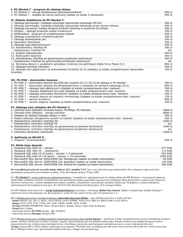 I. PC-Market 7 - program do obsługi sklepu 1. PC-Market 7 - wersja podstawowa jednostanowiskowa 2. PC-Market 7 - dopłata do wersji sieciowej (opłata za każde 5 stanowisk) 550 zł 450 zł II. Moduły dodatkowe do PC-Market 7: 1. Obsługa pierwszego i każdego kolejnego stanowiska kasowego off-line off 2. Obsługa pierwszego i każdego kolejnego stanowiska kasowego przez serwer kasowy ka 3. Obsługa pierwszej i każdej kolejnej drukarki fiskalnej w systemie (Drukfisk) 4. KKSpec - obsługa drukarek kodów kreskowych 5. KKStandard - program do projektowania etykiet 6. Obsługa przenośnych inwentaryzatorów 7. Obsługa sprawdzarek cen 8. Generator Zamówień 9. Obsługa wag elektronicznych 10. Standardowy interfejs FK — Dedykowany interfejs FK 11. System lojalnościowy 12. Rozliczanie kasjerów 13. Standardowy interfejs do generowania przelewów bankowych — Dedykowany interfejs do generowania przelewów bankowych 14. Wymiana danych z systemem sprzedaży mobilnej (na palmtopy) eSale firmy Mayer S.C. 15. Obsługa liczników klientów 16. Obsługa kart płatniczych na stanowiskach Drukfisk [II.3] (dopłata za każde zarejestrowane stanowisko Drukfisk) 300 zł 450 zł 300 zł 350 zł 350 zł 350 zł 350 zł 350 zł 350 zł 350 zł tel. 350 zł 350 zł 350 zł tel. 850 zł 350 zł 150 zł III. PC-POS - stanowisko kasowe: 1. PC-POS 3 - stanowisko kasowe dla DOS bez modułu [II.1] i [II.2] do obsługi w PC-Market PC 2. PC-POS 7 - stanowisko kasowe dla Windows®/Linux z modułem m do serwera kasowego [II.2] 3. PC-POS 7 – obsługa kart płatniczych (dopłata za każde zarejestrowane stan. kasowe) 4. PC-POS 7 – obsługa doładowań pre-paid paid (dopłata za każde zarejestrowane stan. kasowe) 5. PC-POS 7 – obsługa rachunków domowych (dopłata za każde zarejestrowane stan. kasowe) 6. PC-POS 7 – eksport danych do systemu monitoringu (dopłata za każde zarejestrowane stan. kasowe) 7. PC-POS 7 – serwer kuchenny 8. PC-POS 7 – serwer wagowy (dopłata ata za każde zarejestrowane stan. kasowe) 390 850 150 150 150 150 850 150 IV. Obsługa sieci sklepów dla PC-Market Market 7: 1. Centrala Sieci Sklepów (Konsola Kupca, PCMRepl, PC-Market) PC 2. Centrala Sieci Sklepów - wersja sieciowa 3. Dopłata do obsługi każdego sklepu w sieci 4. Moduł zdalnego zarządzania cenami na kasach (dopłata za każde zarejestrowane stan. kasowe) 5. Standardowy centralny interfejs FK — Dedykowany centralny interfejs FK 6. Standardowy centralny interfejs do generowania przelewów bankowych — Dedykowany centralny interfejs do generowania przelewów bankowych 7. Centralny Generator Zamówień 4500 zł 6000 zł 550 zł 450 zł 1500 zł tel. 1500 zł tel. 1500 zł V. Aplikacje na WinCE 5: 1. Program "Inwentaryzator" VI. Silnik bazy danych: 1. Sybase® SQL ASA 10 – serwer 2. Sybase® SQL ASA 10 – użytkownik 3. Sybase® SQL ASA 10 (5-pack) – serwer + 5 stanowisk 4. Sybase® SQL ASA 10 (10-pack) – serwer + 10 stanowisk 5. Microsoft® SQL Server 2005/2008 CAL Workgroup (opłata za każde stanowisko) 6. Microsoft® SQL Server 2005/2008 CAL Standard (opłata za każde stanowisko) 7. Microsoft® SQL Server 2005/2008 2008 CAL Enterprise (opłata za każde stanowisko) zł zł zł zł zł zł zł zł 500 zł 377 113 567 1040 65 130 260 EUR EUR EUR EUR EUR EUR EUR Do wszystkich powyższych cen netto należy doliczyćć 22% podatku VAT VAT. Są to ceny dla końcowego użytkownika. ytkownika. Przy zakupach większych wi ilości egzemplarzy programów przewidziane są rabaty. Ceny obowi obowiązują od dnia 25 lipca 2009. [I.1] PC-Market 7 - wersja podstawowa jednostanowiskowa – kompleksowe oprogramowanie do obsługi sklepu dla MS Windows, z bazą baz danych opartą na silniku SQL; ewidencja towarów i kontrahentów oraz prowadzenie pełnej gospodarki magazynowej, magazynowej, kompletny obieg dokumentów, raportowanie finansowe, ilościowo-wartościowe, ciowe, wydruk standardowych etykiet, cenników, dokumentów, prowadzenie sprzedaży sprzeda y detalicznej. Współpraca z kasami fiska fiskalnymi, elektronicznymi lub komputerowymi [poz. II.1 lub II.2] i/lub drukarkami fiskalnymi [poz. II.3] wymaga dopłaty. [I.2] PC-Market może pracować w wersji wielostanowiskowej korzystając z wybranego silnika bazy danych.. Opłata w ramach tego modułu obejmuje 5 stanowisk sieciowych programu; np. dla programu w wersji 20 stan. należy kwotę z pkt. [I.2] pomnożyć x 4. [II.1] Obsługa pierwszego i każdego kolejnego stanowiska kasowego off-line – typy obsługiwanych kas w trybie off-line: line: - Elzab (EXCEL 261, 261 A, ALFA, ALFA PLUS, ALFA SUPER, ALFA LUX, DELTA, DELTA RS i LAN, L JOTA) - Sharp (227P, 237P, 277P, 277PS, 445, 455P, 495PN, 495PF, 457P, 457PF) - Novitus (PS3000, PS3000 FTP, Soleo, System, Bravo, Rumba, Fiesta, Frigo, Frigo II, Bonita) - Posnet Neo, Combo - stanowisko kasowe PC-POS [cennik – III.1 lub III.2] - stanowisko kasowe Europos, Europos SM [II.2] Obsługa pierwszego i każdego dego kolejnego stanowiska kasowego przez serwer kasowy – umożliwia liwia w pełni zautomatyzowany proces komunikacji (eksport i import, zarówno off-line jak i on-line) line) z kasami, wagami i sprawdzarkami sprawdzarka cen, bez udziału użytkownika. Ponadto możliwy liwy jest podgląd podgl bieżących stanów magazynowych oraz wykonywanie transmisji do kas z dowolnego stanowiska (jeżeli (je eli program zainstalowany jest w wersji wielostano wielostanowiskowej). Uwaga: pozycje [II.1] i [II.2] cennika wykluczają sięę wzajemnie. Wszystkie kasy są s obsługiwane albo przez serwer kasowy [II.2] albo bez serwera kasowego [II.1]. Obsługa on-line wag i sprawdzarek możliwa tylko lko przy zakupie serwera kasowego. [II.3] Obsługa pierwszego i każdego kolejnego stanowiska drukarki fiskalnej – drukarki fiskalne obsługiwane przez PC-Market 7: - Posnet: Thermal (28.1 i zgodne, 39.1 i zgodne, 1.01, 1.02), 3001, DF 300, DF 301, DF 302 - Torell / Emar Duo Pro, Emar Printo 57T, Andros - Innova: Market, Profit, Profi