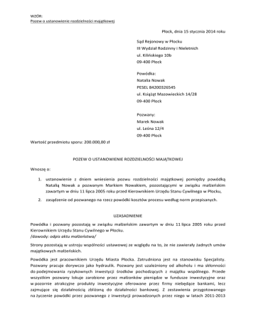 WZÓR: Pozew o ustanowienie rozdzielności majątkowej Płock, dnia 15 stycznia 2014 roku Sąd Rejonowy w Płocku III Wydział Rodzinny i Nieletnich ul. Kilińskiego 10b 09-‐400 Płock Powódka: Natalia Nowak PESEL 84200326545 ul. Książąt Mazowieckich 14/28 09-‐400 Płock Pozwany: Marek Nowak ul. Leśna 12/4 09-‐400 Płock Wartość przedmiotu sporu: 200.000,00 zł POZEW O USTANOWIENIE ROZDZIELNOŚCI MAJĄTKOWEJ Wnoszę o: 1. ustanowienie z dniem wniesienia pozwu rozdzielności majątkowej pomiędzy powódką Natalią Nowak a pozwanym Markiem Nowakiem, pozostającymi w związku małżeńskim zawartym w dniu 11 lipca 2005 roku przed Kierownikiem Urzędu Stanu Cywilnego w Płocku, 2. zasądzenie od pozwanego na rzecz powódki kosztów procesu według norm przepisanych. UZASADNIENIE Powódka i pozwany pozostają w związku małżeńskim zawartym w dniu 11 lipca 2005 roku przed Kierownikiem Urzędu Stanu Cywilnego w Płocku. /dowody: odpis aktu małżeństwa/ Strony pozostają w ustroju wspólności ustawowej ze względu na to, że nie zawierały żadnych umów majątkowych małżeńskich. Powódka jest pracownikiem Urzędu Miasta Płocka. Zatrudniona jest na stanowisku Specjalisty. Pozwany pracuje dorywczo jako hydraulik. Pozwany jest uzależniony od alkoholu i ma skłonności do podejmowania ryzykownych inwestycji środków pochodzących z majątku wspólnego. Przede wszystkim pozwany lokuje zarobione przez małżonków pieniądze w fundusze inwestycyjne oraz w pozornie atrakcyjne produkty inwestycyjne oferowane przez firmy niebędące bankami, lecz zajmujące się działalnością zbliżoną do działalności bankowej. Z zestawienia przygotowanego na życzenie powódki przez pozwanego z inwestycji prowadzonych przez niego w latach 2011-‐2013 2 wynika, że stracił on ok. 45% zainwestowanych środków. Kolejne inwestycje służą odwróceniu niekorzystnej sytuacji, ale są nieprzemyślane i nieskuteczne. /dowody: zeznania stron, zaświadczenie o podjęciu terapii leczenia uzależnienia od alkoholu przez pozwanego, zestawienie rentowności inwestycji z lat 2011-‐2013 przygotowane przez pozwanego/ W ocenie powódki, działania podejmowane przez pozwanego prowadzą do poważnego zagrożenia jej interesów majątkowych. Nieporozumienia, do których dochodzi na skutek niepowodzeń pozwanego prowadzą do utraty zdolności do wykonywania racjonalnego (wspólnego) zarządu majątkiem wspólnym. W tym stanie rzeczy powództwo jest uzasadnione. Ustanowienie rozdzielności majątkowej uzasadnione jest ważnymi powodami w postaci ryzykownych inwestycji pozwanego, które zagrażają stanowi majątku wspólnego. Biorąc to wszystko pod uwagę, wnoszę jak na wstępie. Natalia Nowak (własnoręczny podpis powódki) Załączniki: -‐ odpis pozwu i innych załączników, -‐ odpis aktu małżeństwa rodziców, -‐ zaświadczenie o podjęciu terapii odwykowej, -‐ zestawienie rentowności inwestycji powoda, -‐ dowód uiszczenia opłaty sądowej w wysokości 200 zł. Uwagi: • • • • • Zgodnie z art. 52 § 1 Kodeksu rodzinnego i opiekuńczego z ważnych powodów każdy z małżonków może żądać ustanowienia przez sąd rozdzielności majątkowej. Sądem właściwym rzeczowo do rozpoznania sprawy jest sąd rejonowy niezależnie od wartości przedmiotu sporu (art. 16 w zw. z art. 17 pkt 4 Kodeksu postępowania cywilnego). Wartość przedmiotu sporu stanowi wartość majątku wspólnego małżonków. Właściwość miejscową ustala się w oparciu o art. 41 Kodeksu postępowania cywilnego. Jest to powództwo ze stosunku małżeństwa. Pozew u ustanowienie rozdzielności majątkowej podlega opłacie stałej w wysokości 200 zł (art. 27 pkt 6 ustawy o kosztach sądowych w sprawach cywilnych).