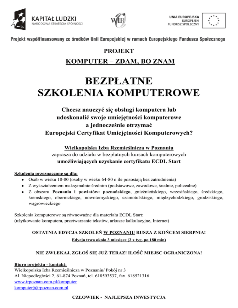 PROJEKT KOMPUTER – ZDAM, BO ZNAM BEZPŁATNE SZKOLENIA KOMPUTEROWE Chcesz nauczyć się obsługi komputera lub udoskonalić swoje umiejętności komputerowe a jednocześnie otrzymać Europejski Certyfikat Umiejętności Komputerowych? Wielkopolska Izba Rzemieślnicza w Poznaniu zaprasza do udziału w bezpłatnych kursach komputerowych umożliwiających uzyskanie certyfikatu ECDL Start Szkolenia przeznaczone są dla: Osób w wieku 18-80 (osoby w wieku 64-80 o ile pozostają bez zatrudnienia) Z wykształceniem maksymalnie średnim (podstawowe, zawodowe, średnie, policealne) Z obszaru Poznania i powiatów: poznańskiego, gnieźnieńskiego, wrzesińskiego, średzkiego, śremskiego, obornickiego, nowotomyskiego, szamotulskiego, międzychodzkiego, grodziskiego, wągrowieckiego Szkolenia komputerowe są równoważne dla materiału ECDL Start: (użytkowanie komputera, przetwarzanie tekstów, arkusze kalkulacyjne, Internet) OSTATNIA EDYCJA SZKOLEŃ W POZNANIU RUSZA Z KOŃCEM SIERPNIA! Edycja trwa około 3 miesiące (2 x tyg. po 180 min) NIE ZWLEKAJ, ZGŁOŚ SIĘ JUŻ TERAZ! ILOŚĆ MIEJSC OGRANICZONA! Biuro projektu - kontakt: Wielkopolska Izba Rzemieślnicza w Poznaniu/ Pokój nr 3 Al. Niepodległości 2, 61-874 Poznań, tel. 618593537, fax. 618521316 www.irpoznan.com.pl/komputer [email protected] CZŁOWIEK - NAJLEPSZA INWESTYCJA