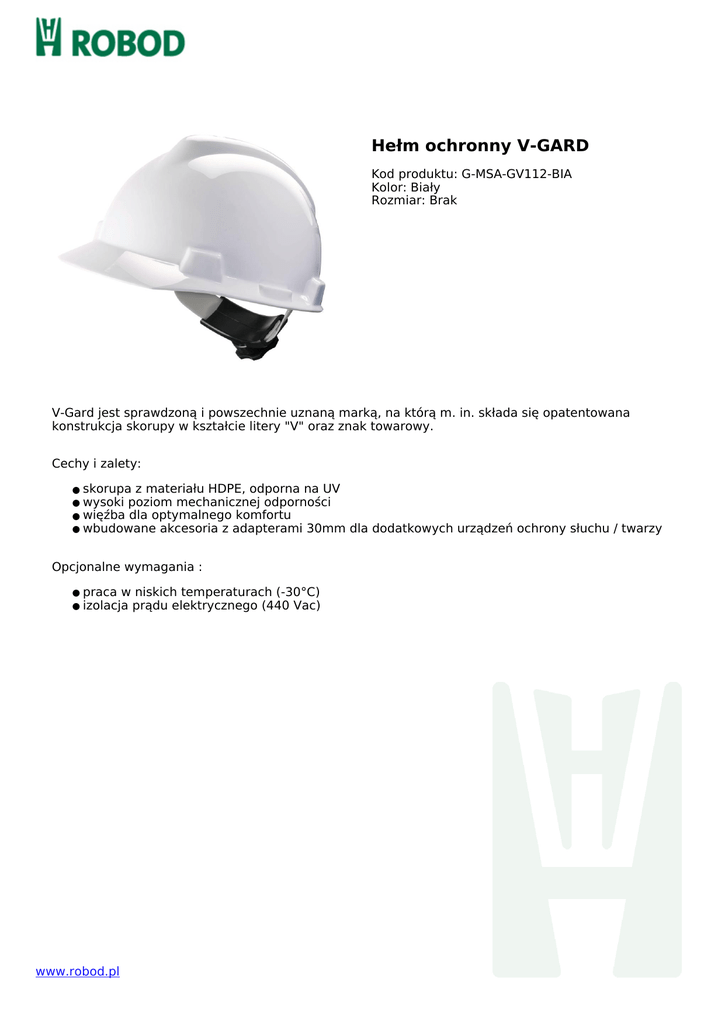 Hełm ochronny V-GARD Kod produktu: G-MSA-GV112-BIA Kolor: Biały Rozmiar: Brak V-Gard jest sprawdzoną i powszechnie uznaną marką, na którą m. in. składa się opatentowana konstrukcja skorupy w kształcie litery "V" oraz znak towarowy. Cechy i zalety: ● ● ● ● skorupa z materiału HDPE, odporna na UV wysoki poziom mechanicznej odporności więźba dla optymalnego komfortu wbudowane akcesoria z adapterami 30mm dla dodatkowych urządzeń ochrony słuchu / twarzy Opcjonalne wymagania : ● ● praca w niskich temperaturach (-30°C) izolacja prądu elektrycznego (440 Vac) www.robod.pl