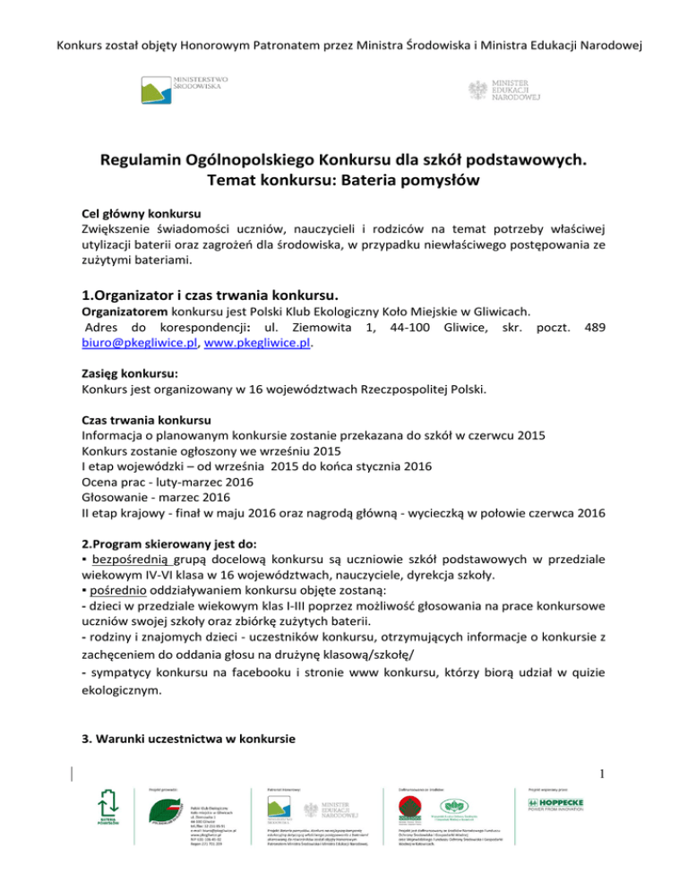 Konkurs został objęty Honorowym Patronatem przez Ministra Środowiska i Ministra Edukacji Narodowej Regulamin Ogólnopolskiego Konkursu dla szkół podstawowych. Temat konkursu: Bateria pomysłów Cel główny konkursu Zwiększenie świadomości uczniów, nauczycieli i rodziców na temat potrzeby właściwej utylizacji baterii oraz zagrożeń dla środowiska, w przypadku niewłaściwego postępowania ze zużytymi bateriami. 1.Organizator i czas trwania konkursu. Organizatorem konkursu jest Polski Klub Ekologiczny Koło Miejskie w Gliwicach. Adres do korespondencji: ul. Ziemowita 1, 44-100 Gliwice, skr. poczt. [email protected], www.pkegliwice.pl. 489 Zasięg konkursu: Konkurs jest organizowany w 16 województwach Rzeczpospolitej Polski. Czas trwania konkursu Informacja o planowanym konkursie zostanie przekazana do szkół w czerwcu 2015 Konkurs zostanie ogłoszony we wrześniu 2015 I etap wojewódzki – od września 2015 do końca stycznia 2016 Ocena prac - luty-marzec 2016 Głosowanie - marzec 2016 II etap krajowy - finał w maju 2016 oraz nagrodą główną - wycieczką w połowie czerwca 2016 2.Program skierowany jest do: ▪ bezpośrednią grupą docelową konkursu są uczniowie szkół podstawowych w przedziale wiekowym IV-VI klasa w 16 województwach, nauczyciele, dyrekcja szkoły. ▪ pośrednio oddziaływaniem konkursu objęte zostaną: - dzieci w przedziale wiekowym klas I-III poprzez możliwość głosowania na prace konkursowe uczniów swojej szkoły oraz zbiórkę zużytych baterii. - rodziny i znajomych dzieci - uczestników konkursu, otrzymujących informacje o konkursie z zachęceniem do oddania głosu na drużynę klasową/szkołę/ - sympatycy konkursu na facebooku i stronie www konkursu, którzy biorą udział w quizie ekologicznym. 3. Warunki uczestnictwa w konkursie 1 Konkurs został objęty Honorowym Patronatem przez Ministra Środowiska i Ministra Edukacji Narodowej Szkoła przystępuje do konkursu poprzez wypełnienie deklaracji uczestnictwa, akceptuje tym samym regulamin. Prace drużyn przyjmowane będą wyłącznie w wersji elektronicznej na płytach CD - w terminie do 31 stycznia 2016 r. (decyduje data wpływu do organizatora) Szkoła wysyła tylko jedną wybraną pracę na adres: Polski Klub Ekologiczny w Krakowie Koło Miejskie w Gliwicach, ul. Ks. Ziemowita1 44-100 Gliwice skr.poczt.489 4.Zadania konkursowe 4.1 Przygotowanie kampanii edukacyjno-informacyjnej dla rówieśników na temat potrzeby właściwego zagospodarowania zużytych baterii i sposobów na ograniczenie użycia jednorazowych baterii, która: ▪ popularyzuje temat z wykorzystaniem różnych narzędzi – w tym Internetu - np. strony internetowe szkół, blogi, media społecznościowe - (np. facebook, nasza klasa, twitter i in.). Forma pracy jest dowolna, a uczestnicy zachęcani są do korzystania z różnorodnych narzędzi - poza tradycyjnymi (plakaty, ulotki, prace plastyczne, opowiadania, zdjęcia, wystąpienia podczas organizowanych przez szkoły akademii itp.) - także multimedialnych, audiowizualnych, internetowych i innych (np. filmiki umieszczane na youtube, audycje w radiowęźle, prowadzenie bloga, wysyłka maili z opracowaniem graficznym do znajomych i inne). 4.2 Zbiórka zużytych baterii przez szkołę, która przystąpiła do konkursu. Pod pojęciem baterii rozumiemy: zużyte baterie i akumulatory przenośne. Baterie i akumulatory, które są przeznaczone do używania w telefonach mobilnych, elektronarzędziach bezprzewodowych, zabawkach, sprzęcie gospodarstwa domowego, zebrane do dnia 31 stycznia 2016. 5.Struktura i etapy realizacji konkursu- rozpoczęcie i prowadzenie konkursu – etap wojewódzki (wrzesień 2015 - styczeń 2016) etap krajowy (luty- maj 2016) 2 Konkurs został objęty Honorowym Patronatem przez Ministra Środowiska i Ministra Edukacji Narodowej 6. Działania szkoły przystępującej do konkursu ▪ szkoła poinformuje rodziców o przystąpieniu placówki do konkursu, przekazując im podstawowe informacje na temat zasad projektu i zachęci ich do głosowania na drużynę szkolną we wszystkich klasach w szkole. ▪ nauczyciele w klasach I-III przeprowadzą jednogodzinne zajęcia lekcyjne na temat: Jaki wpływ na środowisko mają porzucone, zużyte baterie i co należy z nimi zrobić? ▪ szkoła wyłoni we własnym zakresie drużynę składającą się z 10 uczniów z klas IV- VI reprezentujących placówkę w konkursie na szczeblu wojewódzkim wraz z opiekunem drużyny – nauczycielem, która reprezentuje szkołę w kolejnych etapach konkursu. ▪ uczniowie szkoły współpracują z wytypowaną drużyną poprzez upowszechnianie działań wśród swoich znajomych i rodziny i zachęcenie ich do dzielenia się informacją na portalach społecznościowych oraz poprzez zbiórkę zużytych baterii na terenie szkoły ▪ za wyłonienie najlepszego pomysłu na projekt kampanii na poziomie szkolnym będzie odpowiedzialne grono pedagogiczne i dyrekcja danej placówki. ▪ warunkiem udziału w konkursie będzie również udział w elektronicznym quizie ekologicznym. Quiz skierowany będzie do wszystkich, bez względu na wiek. Elektroniczny quiz ekologiczny. ▪ warunkiem udziału w quizie, będzie rejestracja na stronie internetowej z podaniem adresu email, na który raz w tygodniu (4 w miesiącu), wysyłane będzie pytanie, rebus lub krzyżówka, zadanie do rozwiązania etc. ▪ każde pytanie jest tak skonstruowane, że odpowiedź jest jednoznaczna, aby nie było wątpliwości podczas przyznawania punktów. ▪ tematyka pytań będzie związana z bateriami i prawidłowym postępowaniem ze zużytymi bateriami. ▪ raz w miesiącu, spośród osób, które udzielą najwięcej poprawnych odpowiedzi, wylosowana zostanie przez komputer osoba, która otrzyma nagrodę- USB dużej pojemności w kształcie baterii z hasłem zwracającym uwagę, że trzeba je wrzucać do odpowiedniego pojemnika ▪ dodatkowo na zakończenie, spośród osób, które zdobędą największą licz
