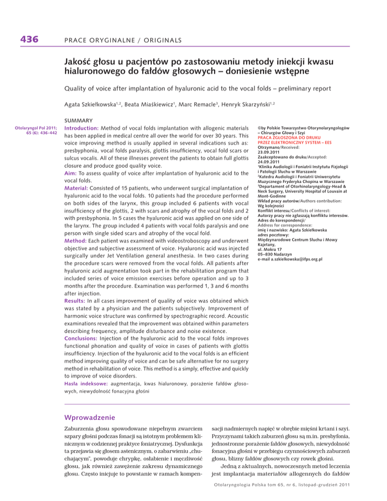 436 PRACE ORYGINALNE / ORIGINALS -DNRĂÊJïRVXXSDFMHQWöZSR]DVWRVRZDQLXPHWRG\LQLHNFMLNZDVX KLDOXURQRZHJRGRIDïGöZJïRVRZ\FKļGRQLHVLHQLHZVWÚSQH Quality of voice after implantation of hyaluronic acid to the vocal folds – preliminary report $JDWD6]NLHïNRZVND%HDWD0LDĂNLHZLF], Marc Remacle3+HQU\N6NDU]\ñVNL 2WRODU\QJRO3RO SUMMARY ,QWURGXFWLRQ0HWKRGRIYRFDOIROGVLPSODQWDWLRQZLWKDOORJHQLFPDWHULDOV KDVEHHQDSSOLHGLQPHGLFDOFHQWUHDOORYHUWKHZRUOGIRURYHU\HDUV7KLV voice improving method is usually applied in several indications such as: SUHVE\SKRQLDYRFDOIROGVSDUDO\VLVJORWWLVLQVXIğFLHQF\YRFDOIROGVFDUVRU VXOFXVYRFDOLV$OORIWKHVHLOOQHVVHVSUHYHQWWKHSDWLHQWVWRREWDLQIXOOJORWWLV FORVXUHDQGSURGXFHJRRGTXDOLW\YRLFH $LP7RDVVHVVTXDOLW\RIYRLFHDIWHULPSODQWDWLRQRIK\DOXURQLFDFLGWRWKH YRFDOIROGV 0DWHULDO&RQVLVWHGRISDWLHQWVZKRXQGHUZHQWVXUJLFDOLPSODQWDWLRQRI K\DOXURQLFDFLGWRWKHYRFDOIROGVSDWLHQWVKDGWKHSURFHGXUHSHUIRUPHG RQ ERWK VLGHV RI WKH ODU\Q[ WKLV JURXS LQFOXGHG SDWLHQWV ZLWK YRFDO LQVXIğFLHQF\RIWKHJORWWLVZLWKVFDUVDQGDWURSK\RIWKHYRFDOIROGVDQG ZLWKSUHVE\SKRQLD,QFDVHVWKHK\DOXURQLFDFLGZDVDSSOLHGRQRQHVLGHRI WKHODU\Q[7KHJURXSLQFOXGHGSDWLHQWVZLWKYRFDOIROGVSDUDO\VLVDQGRQH SHUVRQZLWKVLQJOHVLGHGVFDUVDQGDWURSK\RIWKHYRFDOIROG 0HWKRG(DFKSDWLHQWZDVH[DPLQHGZLWKYLGHRVWURERVFRS\DQGXQGHUZHQW REMHFWLYHDQGVXEMHFWLYHDVVHVVPHQWRIYRLFH+\DOXURQLFDFLGZDVLQMHFWHG VXUJLFDOO\ XQGHU -HW 9HQWLODWLRQ JHQHUDO DQHVWKHVLD ,Q WZR FDVHV GXULQJ WKHSURFHGXUHVFDUVZHUHUHPRYHGIURPWKHYRFDOIROGV$OOSDWLHQWVDIWHU hyaluronic acid augmentation took part in the rehabilitation program that included series of voice emission exercises before operation and up to 3 PRQWKVDIWHUWKHSURFHGXUH([DPLQDWLRQZDVSHUIRUPHGDQGPRQWKV DIWHULQMHFWLRQ 5HVXOWV,QDOOFDVHVLPSURYHPHQWRITXDOLW\RIYRLFHZDVREWDLQHGZKLFK ZDVVWDWHGE\DSK\VLFLDQDQGWKHSDWLHQWVVXEMHFWLYHO\,PSURYHPHQWRI KDUPRQLFYRLFHVWUXFWXUHZDVFRQğUPHGE\VSHFWURJUDSKLFUHFRUG$FRXVWLF H[DPLQDWLRQVUHYHDOHGWKDWWKHLPSURYHPHQWZDVREWDLQHGZLWKLQSDUDPHWHUV GHVFULELQJIUHTXHQF\DPSOLWXGHGLVWXUEDQFHDQGQRLVHH[LVWHQFH &RQFOXVLRQVInjection of the hyaluronic acid to the vocal folds improves IXQFWLRQDOSKRQDWLRQDQGTXDOLW\RIYRLFHLQFDVHVRISDWLHQWVZLWKJORWWLV LQVXIğFLHQF\,QMHFWLRQRIWKHK\DOXURQLFDFLGWRWKHYRFDOIROGVLVDQHIğFLHQW method improving quality of voice and can be safe alternative for no surgery PHWKRGLQUHKDELOLWDWLRQRIYRLFH7KLVPHWKRGLVDVLPSO\HIIHFWLYHDQGTXLFNO\ WRLPSURYHRIYRLFHGLVRUGHUV ŅE\3ROVNLH7RZDU]\VWZR2WRU\QRODU\QJRORJöZ ļ&KLUXUJöZ*ïRZ\L6]\L 35$&$=*26=21$'2'58.8 35=(=(/(.7521,&=1<6<67(0ļ((6 2WU]\PDQR5HFHLYHG =DDNFHSWRZDQRGRGUXNX$FFHSWHG .OLQLND$XGLRORJLLL)RQLDWULL,QVW\WXWX)L]MRORJLL L3DWRORJLL6ïXFKXZ:DUV]DZLH .DWHGUD$XGLRORJLLL)RQLDWULL8QLZHUV\WHWX 0X]\F]QHJR)U\GHU\ND&KRSLQDZ:DUV]DZLH 'HSDUWDPHQWRI2WRUKLQRODU\QJRORJ\+HDG 1HFN6XUJHU\8QLYHUVLW\+RVSLWDORI/RXYDLQDW 0RQW*RGLQQH :NïDGSUDF\DXWRUöZ$XWKRUVFRQWULEXWLRQ :JNROHMQRĂFL .RQIOLNWLQWHUHVX&RQIOLFWVRILQWHUHVW $XWRU]\SUDF\QLH]JïDV]DMÈNRQIOLNWXLQWHUHVöZ $GUHVGRNRUHVSRQGHQFML/ $GGUHVVIRUFRUUHVSRQGHQFH LPLÚLQD]ZLVNR$JDWD6]NLHïNRZVND DGUHVSRF]WRZ\ 0LÚG]\QDURGRZH&HQWUXP6ïXFKXL0RZ\ .DMHWDQ\ XO0RNUD ļ1DGDU]\Q HPDLODV]NLHONRZVND#LISVRUJSO +DVïD LQGHNVRZH DXJPHQWDFMD NZDV KLDOXURQRZ\ SRUDĝHQLH IDïGöZ JïRVRZ\FKQLHZ\GROQRĂÊIRQDF\MQDJïRĂQL :SURZDG]HQLH Zaburzenia głosu spowodowane niepełnym zwarciem szpary głośni podczas fonacji są istotnym problemem klinicznym w codziennej praktyce foniatrycznej. Dysfunkcja ta przejawia się głosem astenicznym, o zabarwieniu „chuchającym”, powoduje chrypkę, osłabienie i męczliwość głosu, jak również zawężenie zakresu dynamicznego głosu. Często inicjuje to powstanie w ramach kompen- sacji nadmiernych napięć w obrębie mięśni krtani i szyi. Przyczynami takich zaburzeń głosu są m.in. presbyfonia, jednostronne porażenie fałdów głosowych, niewydolność fonacyjna głośni w przebiegu czynnościowych zaburzeń głosu, blizny fałdów głosowych czy rowek głośni. Jedną z aktualnych, nowoczesnych metod leczenia jest implantacja materiałów allogennych do fałdów 2 WROD U \QJRORJLD3ROVNDWRP QU OLV WRSDGJU XG]LHñ PRACE ORYGINALNE / ORIGINALS Tabela I.&KDUDNWHU\VW\NDJUXS\EDGDQHMQ 7DEOH,&KDUDFWHULVWLFRIJURXSQ 3DFMHQW 3ïHÊ :LHNODWD 2NUHVREVHUZDFML (WLRORJLD 6WURQDSDWRORJLL M PLHVLÚF\ SRUDĝHQLHIDïGXJïRVRZHJR OHZD M PLHVLÚF\ SRUDĝHQLHIDïGXJïRVRZHJR OHZD . PLHVLÚF\ SRUDĝHQLHIDïGXJïRVRZHJR OHZD . PLHVLÚF\ SRUDĝHQLHIDïGXJïRVRZHJR SUDZD M PLHVLÚF\ SUHVE\IRQLD REXVWURQQLH M PLHVLÚF\ SUHVE\IRQLD REXVWURQQLH . PLHVLÚF\ EOL]QDLbDWURğDIDïGöZJïRVRZ\FK REXVWURQQLH . PLHVLÚF\ EOL]QDLbDWURğDIDïGXJïRVRZHJR OHZD . PLHVLÚF\ EOL]QDLbDWURğDIDïGöZJïRVRZ\FK REXVWURQQLH . PLHVLÚF\ QLHZ\GROQRĂÊIRQDF\MQDJïRĂQL REXVWURQQLH . PLHVLÚF\ QLHZ\GROQRĂÊIRQDF\MQDJïRĂQL REXVWURQQLH . PLHVLÚF\ QLHZ\GROQRĂÊIRQDF\MQDJïRĂQL SUDZD . PLHVLÚF\ QLHZ\GROQRĂÊIRQDF\MQDJïRĂQL REXVWURQQLH . PLHVLÚF\ QLHZ\GROQRĂÊIRQDF\MQDJïRĂQL REXVWURQQLH M PLHVLÚF\ QLHZ\GROQRĂÊIRQDF\MQDJïRĂQL REXVWURQQLH głosowych. Iniekcyjna laryngoplastyka została po raz pierwszy opisana przez Bruningsa w 1911 roku, a wprowadzona ponownie przez Arnolda w latach 60. XX wieku [1]. Idealny materiał do iniekcji powinien być łatwo osiągalny, niedrogi, dobrze tolerowany przez pacjenta, odporny na resorpcję, łatwy do zastosowania oraz całkowicie biokompatybilny [1, 2]. Na przestrzeni ostatnich kilku dekad wykorzystywano do augmentacji różne preparaty, takie jak teflon, kolagen wołowy, kolagen autogenny, kolagen homogenny, hydroxyapatyty wapniowe oraz tłuszcz autogenny. W ostatnim czasie wielu fonochirurgów stosuje kwas hialuronowy (cross-linked), który nie daje odczynów zapalnych w obrębie fałdów głosowych. Kwas hialuronowy jest jednym z naturalnych składników przestrzeni Reinkego, zapewnia po iniekcji elastyczność warstwy powierzchownej blaszki właściwej, wykazuje dość długą trwałość po wstrzyknięciu do fałdu głosowego oraz, jak wskazują wstępne badania histologiczne, ma zdolność pobudzania