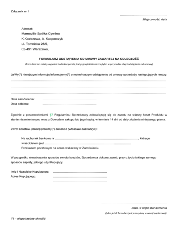 Załącznik nr 1 …………..……………………………. Miejscowość, data Adresat: Mamaville Spółka Cywilna K.Kostrzewa, A. Kacperczyk ul. Tomnicka 25/5, 02-491 Warszawa, FORMULARZ ODSTĄPIENIA OD UMOWY ZAWARTEJ NA ODLEGŁOŚĆ (formularz ten należy wypełnić i odesłać pocztą tradycyjną/elektroniczną tylko w przypadku chęci odstąpienia od umowy) Ja/My(*) niniejszym informuję/informujemy(*) o moim/naszym odstąpieniu od umowy sprzedaży następujących rzeczy: ………………………………………………………………………………………………………………………………………… ………………………………………………………………………………………………………………………………………… ………………………………………………………………………………………………………………………………………… Data zamówienia: ……………………………………………… Data odbioru: ……………………………………………… Zgodnie z postanowieniami §7 Regulaminu Sprzedawcy zobowiązuję się do zwrotu na własny koszt Produktu w stanie niezmienionym, wraz z Dowodem zakupu lub jego kopią, w terminie 14 dni od daty złożenia niniejszego pisma. Zwrot kosztów, proszę/prosimy(*) dokonać (właściwe zaznaczyć): Na rachunek bankowy nr ……………………………………………………………………….. , którego właścicielem jest ……………………………………………………………...…………… Przekazem pocztowym na adres wskazany w Zamówieniu. W przypadku niewskazania sposobu zwrotu kosztów, Sprzedawca dokona zwrotu przy u życiu takiego samego sposobu zapłaty, jakiego użył Kupujący. Imię i Nazwisko Kupującego: ……………………………………………… Adres Kupującego: ……………………………………………… ……………………………………………… ………………………………………………………… Data i Podpis Konsumenta (tylko jeżeli formularz jest przesyłany w wersji papierowej) (*) – niepotrzebne skreślić