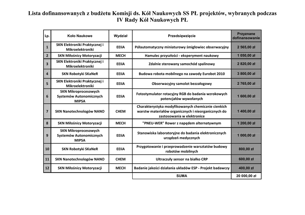 Lista dofinansowanych z budżetu Komisji ds. Kół Naukowych SS PŁ projektów, wybranych podczas IV Rady Kół Naukowych PŁ Lp. Koło Naukowe Wydział Przedsięwzięcie Przyznane dofinansowanie 1 SKN Elektroniki Praktycznej i Mikroelektroniki EEIiA Półautomatyczny miniaturowy śmigłowiec obserwacyjny 2 565,00 zł SKN Miłośnicy Motoryzacji SKN Elektroniki Praktycznej i Mikroelektroniki MECH Hamulec przyszłości ‐ eksperyment naukowy 1 050,00 zł EEIiA Zdalnie sterowany samochód spalinowy 2 820,00 zł SKN Robotyki SKaNeR EEIiA Budowa robota mobilnego na zawody Eurobot 2010 3 800,00 zł EEIiA Obserwacyjny samolot bezzałogowy 2 765,00 zł EEIiA Fotostymulator rotacyjny RGB do badania wzrokowych potencjałów wywołanych 1 600,00 zł 1 400,00 zł 2 3 4 5 6 SKN Elektroniki Praktycznej i Mikroelektroniki SKN Mikroprocesowych Systemów Autonomicznych MIPSA 7 SKN Nanotechnologów NANO CHEM Charakterystyka modyfikowanych chemicznie cienkich warstw materiałów organicznych i nieorganicznych do zastosowania w elektronice 8 SKN Miłośnicy Motoryzacji MECH "PNEU‐WER" Rower z napędem alternatywnym 1 200,00 zł 9 SKN Mikroprocesowych Systemów Autonomicznych MIPSA EEIiA Stanowiska laboratoryjne do badania elektronicznych urządzeń medycznych 1 000,00 zł 10 SKN Robotyki SKaNeR EEIiA Przygotowanie i przeprowadzenie warsztatów budowy robotów mobilnych 800,00 zł 11 SKN Nanotechnologów NANO CHEM Ultraczuły sensor na białko CRP 600,00 zł 12 SKN Miłośnicy Motoryzacji MECH Badanie jakości działania układów ESP ‐ Projekt badawczy 400,00 zł SUMA 20 000,00 zł