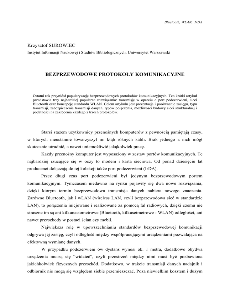 Bluetooth, WLAN, IrDA Krzysztof SUROWIEC Instytut Informacji Naukowej i Studiów Bibliologicznych, Uniwersytet Warszawski BEZPRZEWODOWE PROTOKOŁY KOMUNIKACYJNE Ostatni rok przyniósł popularyzację bezprzewodowych protokołów komunikacyjnych. Ten krótki artykuł przedstawia trzy najbardziej popularne rozwiązania: transmisję w oparciu o port podczerwieni, sieci Bluetooth oraz koncepcję standardu WLAN. Celem artykułu jest prezentacja i porównanie zasięgu, typu transmisji, zabezpieczenia transmisji danych, typów połączenia, możliwości budowy sieci strukturalnej i podatności na zakłócenia każdego z trzech protokołów. Starsi stażem użytkownicy przenośnych komputerów z pewnością pamiętają czasy, w których nieustannie towarzyszył im kłąb różnych kabli. Brak jednego z nich mógł skutecznie utrudnić, a nawet uniemożliwić jakąkolwiek pracę. Każdy przenośny komputer jest wyposażony w zestaw portów komunikacyjnych. Te najbardziej rzucające się w oczy to modem i karta sieciowa. Od ponad dziesięciu lat producenci dołączają do tej kolekcji także port podczerwieni (IrDA). Przez długi czas port podczerwieni był jedynym bezprzewodowym portem komunikacyjnym. Tymczasem niedawno na rynku pojawiły się dwa nowe rozwiązania, dzięki którym termin bezprzewodowa transmisja danych nabiera nowego znaczenia. Zarówno Bluetooth, jak i wLAN (wireless LAN, czyli bezprzewodowa sieć w standardzie LAN), to połączenia inicjowane i realizowane za pomocą fal radiowych, dzięki czemu nie straszne im są ani kilkunastometrowe (Bluetooth, kilkusetmetrowe - WLAN) odległości, ani nawet przeszkody w postaci ścian czy mebli. Największa rolę w upowszechnianiu standardów bezprzewodowej komunikacji odgrywa jej zasięg, czyli odległość między współpracującymi urządzeniami pozwalająca na efektywną wymianę danych. W przypadku podczerwieni ów dystans wynosi ok. 1 metra, dodatkowo obydwa urządzenia muszą się “widzieć”, czyli przestrzeń między nimi musi być pozbawiona jakichkolwiek fizycznych przeszkód. Dodatkowo, w trakcie transmisji danych nadajnik i odbiornik nie mogą się względem siebie przemieszczać. Poza niewielkim kosztem i dużym nasyceniem rynku modułami podczerwieni trudno jest znaleźć jakiekolwiek zalety standardu IrDA. Biorąc pod uwagę brak konieczności autoryzacji transmisji wnet okazuje się, że port podczerwieni jest niebezpieczny i najlepiej w ogóle go wyłączyć (dla przykładu, pobranie treści wszystkich smsów, listy połączeń i zawartości książki adresowej z telefonu komórkowego leżącego na stoliku w kawiarni przez nieuprawnioną osobę zajmie raptem kilkadziesiąt sekund i nie pozostawi żadnych śladów. Wystarczy mieć palmtop). Bluetooth, pierwszy z dwóch najnowszych protokołów bezprzewodowych skutecznie zabezpiecza użytkownika przed nieuprawnionym dostępem do danych. To poparte praktyczną ideą łączenia pozostających w pobliżu urządzeń rozwiązanie nie dość, że szyfruje przesyłane dane, to w trakcie inicjacji połączenia wymaga wprowadzenia czterocyfrowego kodu PIN. Sam kod PIN wymyśla użytkownik (nie zachodzi konieczność wcześniejszej definicji czy jakiejkolwiek instalacji czy rejestracji urządzeń); warunkiem połączenia jest podanie identycznego kodu w obydwu łączonych urządzeniach. Przy kolejnym połączeniu urządzenia mogą się “zapamiętać” i łączyć bez uwierzytelniania – bowiem każdy moduł Bluetooth posiada unikalny numer seryjny, który może zostać zapisany w pamięci innych urządzeń z którymi się łączy – i na tej podstawie traktowany jak urządzenie, w przypadku którego podawanie kodu PIN jest niepotrzebne. W takiej sytuacji, podczas kolejnego połączenia autoryzacja nie będzie wymagana. Bluetooth jest także pierwszym protokołem, który umożliwia jednoczesne połączenie do ośmiu urządzeń. Taka sieć nosi wówczas nazwę Personal Area Network, czyli “sieć osobista”. Różnorodność urządzeń peryferyjnych, możliwość nawiązywania połączeń ad hoc oraz sprzętowa identyfikacja dobrze wróży sieciom wykorzystującym protokół Bluetooth. Wątpliwości wzbudza jedynie przepustowość łączy (patrz tabela poniżej), lecz trwają już pracę nad zwiększeniem przepustowości tego standardu. Kolejny z protokołów wykorzystujący fale radiowe, to WLAN (zwany także Wi-Fi). Oferowany przezeń zasięg wynosi od 100 do 300 metrów i pozwolił na realizację podstawowego postulatu Wireless LAN(bezprzewodowej sieci lokalnej): każdy sieciowy kabel został zastąpiony łączem radiowym. Analogicznie do rozwiązań LAN, sieci WLAN oferują możliwość bezpośredniego połączenia dwóch urządzeń, ale w celu podłączenia większej ich liczby wymagane jest urządzenie pełniące rolę koncentratora (huba, switcha) – w terminologii WLAN takie urządzenie nosi nazwę punktu dostępowego. Każdy punkt dostępowy może podłączyć do 128 urządzeń; punkty dostępowe można też wzajemnie łączyć. WLAN skutecznie zastępuje tradycyjne sieci LAN, ustępuje im w kwestii prędkości – ta maleje wraz ze wzrostem odległości od punktu dostępowego (im dalej do punktu dostępowego – tym transfer danych jest wolniejszy). Zakłada się, że w budynkach odległość, powyżej której występuje zauważalny spadek prędkości transmisji, wynosi 40 m. Podsumowując, do budowy typowej sieci komputerowej dla większości komputerów osobistych, laptopów i palmtopów optymalnym rozwiązaniem jest WLAN. Mniejszy zasięg, oferowany przez rozwiązanie Bluetooth doskonale sprawdzi się w konieczności łączenia rozmaitych urządzeń peryferyjnych. IrDA – “bezprzewodowy kabel” – umożliwia transfer danych na niewielkie odległości. W przypadku tego ostatniego protokołu można się spodziewać, że zostanie zastąpiony przez Bluetooth. Zestawienie wybranych cech protokołów bezprzewodowej komunikacji IrDA Częstotliwość Bluetooth WL