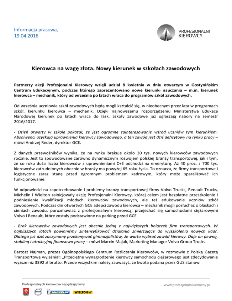 Informacja prasowa, 19.04.2016 Kierowca na wagę złota. Nowy kierunek w szkołach zawodowych Partnerzy akcji Profesjonalni Kierowcy wzięli udział 8 kwietnia w dniu otwartym w Gostynińskim Centrum Edukacyjnym, podczas którego zaprezentowano nowe kierunki nauczania – m.in. kierunek kierowca – mechanik, który od września po latach wraca do programów szkół zawodowych. Od września uczniowie szkół zawodowych będą mogli kształcić się, w nieobecnym przez lata w programach szkół, kierunku kierowca – mechanik. Dzięki najnowszemu rozporządzeniu Ministerstwa Edukacji Narodowej kierunek po latach wraca do łask. Szkoły zawodowe już ogłaszają nabory na semestr 2016/2017. - Dzień otwarty w szkole pokazał, że jest ogromne zainteresowanie wśród uczniów tym kierunkiem. Absolwenci uzyskają uprawnienia kierowcy zawodowego, a ten zawód jest dziś deficytowy na rynku pracy – mówi Andrzej Reder, dyrektor GCE. Z danych przewoźników wynika, że na rynku brakuje około 30 tys. nowych kierowców zawodowych rocznie. Jest to spowodowane zarówno dynamicznym rozwojem polskiej branży transportowej, jak i tym, że co roku duża liczba kierowców z uprawnieniami C+E odchodzi na emeryturę. Aż 40 proc. z 700 tys. kierowców zatrudnionych obecnie w branży ma powyżej 65 roku życia. To oznacza, że firmy transportowe i logistyczne zaraz staną przed ogromnym problemem kadrowym, który może sparaliżować ich funkcjonowanie. W odpowiedzi na zapotrzebowanie i problemy branży transportowej firmy Volvo Trucks, Renault Trucks, Michelin i Wielton zainicjowały akcję Profesjonalni Kierowcy, której celem jest bezpłatne przeszkolenie i podniesienie kwalifikacji młodych kierowców zawodowych, ale też edukowanie uczniów szkół zawodowych. Podczas dni otwartych GCE adepci zawodu kierowca – mechanik mogli posłuchać o blaskach i cieniach zawodu, porozmawiać z profesjonalnym kierowcą, przejechać się samochodami ciężarowymi Volvo i Renault, które zostały podstawione na parking przed GCE - Brak kierowców zawodowych jest obecnie jedną z największych bolączek firm transportowych. W najbliższych latach powinniśmy zintensyfikować działania zmierzające do wyszkolenia nowych kadr. Dlatego już dziś zaczynamy przekonywać gimnazjalistów, że warto wybrać zawód kierowy. Daje on pewną, stabilną i atrakcyjną finansowo pracę – mówi Marcin Majak, Marketing Manager Volvo Group Trucks. Bartosz Najman, prezes Ogólnopolskiego Centrum Rozliczania Kierowców, w rozmowie z Polską Gazetą Transportową wyjaśniał: „Przeciętne wynagrodzenie kierowcy samochodu ciężarowego jest zdecydowanie wyższe niż 3392 zł brutto. Przede wszystkim należy zauważyć, że kwota podana przez GUS stanowi podstawę wynagrodzenia. Pensja kierowcy zawiera natomiast także inne składniki, jak ryczałt i dieta. Jeśli zsumujemy całość, otrzymamy kwotę sięgającą przedziału około 4000-6000 zł.” Zdaniem przedstawicieli szkół zawodowych w kraju kierunek kierowca – mechanik będzie jednym z najbardziej popularnych w tegorocznym naborze. Podobnie jak GCE, nabór na ten kierunek uruchomiło wiele szkół w całej Polsce m.in. Zespół Szkół Samochodowych we Włocławku, Zespół Szkół Rolniczych w Czartajewie na Podlasiu, Zespół Szkół Samochodowych w Bydgoszczy, Zespół Szkół Elektronicznych i Samochodowych w Zielonej Górze. Więcej informacji udziela: Agencja Medialna All inclusive [email protected] tel. 663 751 444 lub 691 724 099