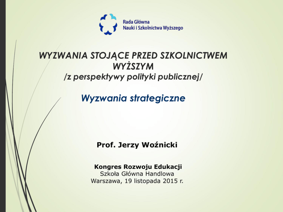 WYZWANIA STOJĄCE PRZED SZKOLNICTWEM WYŻSZYM /z perspektywy polityki publicznej/ Wyzwania strategiczne Prof. Jerzy Woźnicki Kongres Rozwoju Edukacji Szkoła Główna Handlowa Warszawa, 19 listopada 2015 r. 2 WPROWADZENIE Motywacja: Ułatwienie myślenia o uwarunkowaniach teraźniejszości i przyszłości szkolnictwa wyższego w perspektywie integrującej zróżnicowane wątki Intencja: Przedstawienie przeglądu rysujących się wyzwań w sposób systematyczny i syntetyczny, z uwzględnieniem grupowania i agregacji problemów …….. Kontekst: Zdynamizowanie publicznej debaty programowej w 2015 r. oraz zmiana władz RP Jerzy Woźnicki 3 1. Założenia koncepcyjne i metodyczne prezentacji perspektywa polityki publicznej przeglądowy charakter referatu odwoływanie się do krajowych opracowań strategicznych z ostatnich lat: ministerialnych i środowiskowych, opracowanych przez podmioty najbardziej reprezentatywne uwzględnienie uwarunkowań międzynarodowych, w tym zwłaszcza europejskich własny, autorski wybór zagadnień i układ prezentacji obejmujący diagnozę, prognozę i syntezę założenie selekcji i grupowania problemów: zasada grup pięcioelementowych i dominacji prognozy (przyszłości) Jerzy Woźnicki 4 2. Główne opracowania wykorzystane jako bazowe (KRASP, FRP, RGNiSW, MNiSW) Strategia rozwoju szkolnictwa wyższego 2010-20; projekt środowiskowy opracowany przez FRP dla Konsorcjum z udziałem KRASP, poddany debacie publicznej i poparty lub przyjęty m.in. przez KRASP, RGNiSW, KRZaSP i innych partnerów w latach 2009-11 Program rozwoju szkolnictwa wyższego do 2020 r., opracowany przez FRP dla KRASP i przyjęty przez Zgromadzenie Plenarne Rektorów w I połowie 2015 r. Program rozwoju szkolnictwa wyższego i nauki na lata 2015-30 oraz Program Umiędzynarodowienia Szkolnictwa Wyższego; dokumenty opracowane i ogłoszone przez MNiSW w II połowie 2015 r. Jerzy Woźnicki 5 3. Inne wykorzystane opracowania programowe Raporty własne RGNiSW (nowa forma działalności Rady od 2014 r): o Problematyka odbiurokratyzowania systemu kształcenia, w tym KRK, z uwzględnieniem treści regulacji i stosowanych praktyk, pod redakcją Zbigniewa Marciniaka, Warszawa, luty 2015 (raport nr 1/2015) o Inwestycje w infrastrukturę badawczą w polskich uczelniach, instytutach badawczych i instytutach PAN, pod redakcją Janusza Igrasa oraz Mariana Szczerka Warszawa, luty 2015 (raport nr 2/2015) o Studia doktoranckie i mobilność młodych naukowców, pod redakcją Andrzeja Sobkowiaka, Warszawa, kwiecień 2015 (raport nr 3/2015) „Analiza współpracy uczelni polskich i ukraińskich na tle porównania systemów szkolnictwa wyższego. Wnioski i rekomendacje.” - raport opracowany przez FRP-ISW w 2015 r. dla Ministrów i Konferencji Rektorów z obu naszych krajów Jerzy Woźnicki 6 4. Pozostałe propozycje o charakterze programowym Dokumenty Komitetu Kryzysowego Humanistyki Polskiej, a w tym Postulaty Programowe „Pakt dla nauki, Obywatelski projekt zmian w nauce i szkolnictwie wyższym w Polsce.” Opracowanie zbiorowe pod redakcją A. Muszewskiej, Ł. Niesiołowskiego-Spanò, A. Pieniądz, 2015 Opracowanie programowe z 2015 r. Kancelarii Prezydenta RP B. Komorowskiego pod red. Min. O. Dziekońskiego pt. „Postulaty zmian zwiększających innowacyjność polskiej gospodarki” oraz inicjatywa ustawodawcza Prezydenta (projekt ustawy o zmianie niektórych ustaw w związku z wspieraniem innowacyjności) Jerzy Woźnicki 7 4. Pozostałe propozycje o charakterze programowym - dok. Wydawnictwo Rady Głównej Instytutów Badawczych pt. „Polska gospodarka w 2020 roku – szanse i zagrożenia.” Raport FRP-ISW pt. „Ochrona własności intelektualnej w kontekście naruszania praw w tym zakresie”. (Analiza uczelnianych regulaminów własności intelektualnej ze wskazaniem dobrych praktyk) Poradnik opracowany przez Urząd Patentowy RP pt. „Regulaminy zarządzania własnością intelektualną w szkołach wyższych w świetle znowelizowanej ustawy Prawo o szkolnictwie wyższym”, 2014 Projekt Fundacji na rzecz Nauki Polskiej „Międzynarodowe Agendy Badawcze” Jerzy Woźnicki 5. Podstawowe kryteria grupowania problemów przyjęte w prezentacji oraz jej struktura1 8 I. DIAGNOZA - wyzwania i problemy odniesione do oceny aktualnego stanu i istniejących uwarunkowań działania uczelni systemowe warunki dotyczące funkcjonowania szkół wyższych – uwarunkowania wewnątrz-systemowe warunki wynikające z otoczenia uczelni – uwarunkowania zewnątrz-systemowe II. PROGNOZA – wyzwania i problemy formułowane z odniesieniem się do oczekiwanych uwarunkowań zmieniających się w przewidywalnej przyszłości w obszarach: kształcenie i nowa służebność społeczna badania naukowe i relacje z otoczeniem rozwiązania regulacyjne o charakterze zarządczym typu good governance finansowanie procesu kształcenia w uczelniach umiędzynarodowienie szkolnictwa wyższego III. SYNTEZA: wyzwania związane z osiągnięciem oczekiwanego stanu w szkolnictwie wyższym --------------------------------------------------------------------------------------------------------------------------------------------------------------------- 1Przyjęto zasadę wyróżnienia pięciu elementów w strukturze poszczególnych grup i podgrup problemowych Jerzy Woźnicki 9 I. DIAGNOZA - wyzwania i problemy odniesione do oceny aktualnego stanu i istniejących uwarunkowań działania uczelni Systemowe warunki dotyczące funkcjonowania szkół wyższych – uwarunkowania wewnątrz-systemowe odpowiedzialność za różne typy szkół wyższych rozdzielona na różne ministerstwa (nadmierna branżowość systemu i deficyt planowania strategicznego w obszarze polityki publicznej); brak utrwalonej praktyki i odpowiednich narzędzi do monitorowania stanu systemu i badań komparatywnych niedostateczne zakorzenienie się kultury myślenia i działania strategicznego w uczelniach (fragmentaryczność realizowanych zamierzeń, niedostateczny sp