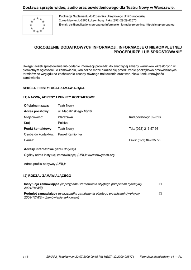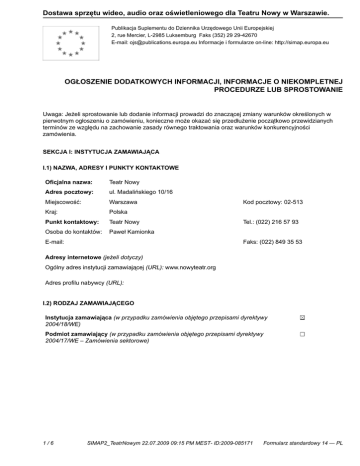 Dostawa sprzętu wideo, audio oraz oświetleniowego dla Teatru Nowy w Warszawie. Publikacja Suplementu do Dziennika Urzędowego Unii Europejskiej 2, rue Mercier, L-2985 Luksemburg Faks (352) 29 29-42670 E-mail: [email protected] Informacje i formularze on-line: http://simap.europa.eu OGŁOSZENIE DODATKOWYCH INFORMACJI, INFORMACJE O NIEKOMPLETNEJ PROCEDURZE LUB SPROSTOWANIE Uwaga: Jeżeli sprostowanie lub dodanie informacji prowadzi do znaczącej zmiany warunków określonych w pierwotnym ogłoszeniu o zamówieniu, konieczne może okazać się przedłużenie początkowo przewidzianych terminów ze względu na zachowanie zasady równego traktowania oraz warunków konkurencyjności zamówienia. SEKCJA I: INSTYTUCJA ZAMAWIAJĄCA I.1) NAZWA, ADRESY I PUNKTY KONTAKTOWE Oficjalna nazwa: Teatr Nowy Adres pocztowy: ul. Madalińskiego 10/16 Miejscowość: Warszawa Kraj: Polska Punkt kontaktowy: Teatr Nowy Osoba do kontaktów: Paweł Kamionka E-mail: _____________________________________________ Faks: (022) 849 35 53 Kod pocztowy: 02-513 Tel.: (022) 216 57 93 Adresy internetowe (jeżeli dotyczy) Ogólny adres instytucji zamawiającej (URL): www.nowyteatr.org Adres profilu nabywcy (URL): ________________________________________ I.2) RODZAJ ZAMAWIAJĄCEGO Instytucja zamawiająca (w przypadku zamówienia objętego przepisami dyrektywy 2004/18/WE) Podmiot zamawiający (w przypadku zamówienia objętego przepisami dyrektywy 2004/17/WE – Zamówienia sektorowe) 1/6 SIMAP2_TeatrNowym 22.07.2009 09:15 PM MEST- ID:2009-085171 Formularz standardowy 14 — PL Dostawa sprzętu wideo, audio oraz oświetleniowego dla Teatru Nowy w Warszawie. SEKCJA II: PRZEDMIOT ZAMÓWIENIA II.1) OPIS II.1.1) Nazwa nadana zamówieniu przez instytucję zamawiającą (podano w pierwotnym ogłoszeniu) Dostawa sprzętu wideo, audio oraz oświetleniowego dla Teatru Nowy w Warszawie. II.1.2) Krôtki opis (podano w pierwotnym ogłoszeniu) Dostawa sprzętu wideo, audio oraz oświetleniowego dla Teatru Nowy w Warszawie. II.1.3) Wspólny Słownik Zamówień (CPV) (podano w pierwotnym ogłoszeniu) Słownik główny Słownik uzupełniający (jeżeli dotyczy) Główny przedmiot 31300000 ______________________________ Dodatkowe przedmioty 32323400 ______________________________ 31000000 ______________________________ 32340000 ______________________________ 32343000 ______________________________ 32333200 ______________________________ 32352000 ______________________________ 2/6 SIMAP2_TeatrNowym 22.07.2009 09:15 PM MEST- ID:2009-085171 Formularz standardowy 14 — PL Dostawa sprzętu wideo, audio oraz oświetleniowego dla Teatru Nowy w Warszawie. SEKCJA IV: PROCEDURA IV.1) RODZAJ PROCEDURY IV.1.1) Rodzaj procedury (podano w pierwotnym ogłoszeniu) Otwarta Ograniczona Ograniczona przyspieszona Negocjacyjna Negocjacyjna przyspieszona Dialog konkurencyjny IV.2) INFORMACJE ADMINISTRACYJNE IV.2.1) Numer referencyjny nadany sprawie przez instytucję zamawiającą /podmiot zamawiający (podano w pierwotnym ogłoszeniu, o ile dotyczy) 3/PN/2009 IV.2.2) Dane referencyjne ogłoszenia w przypadku ogłoszeń przesłanych drogą elektroniczną (jeżeli są znane): Pierwotne ogłoszenie przesłane przez: SIMAP OJS eSender Login: SIMAP2_TeatrNowym Dane referencyjne ogłoszenia: 2009-070323 (rok i numer dokumentu) IV.2.3) Ogłoszenie, którego dotyczy niniejsza publikacja (jeżeli dotyczy) 2009/S 118-170923 z dnia 24/06/2009 IV.2.4) Data wysłania niniejszego ogłoszenia: 20/06/2009 3/6 SIMAP2_TeatrNowym 22.07.2009 09:15 PM MEST- ID:2009-085171 Formularz standardowy 14 — PL Dostawa sprzętu wideo, audio oraz oświetleniowego dla Teatru Nowy w Warszawie. SEKCJA VI: INFORMACJE UZUPEŁNIAJĄCE VI.1) OGŁOSZENIE DOTYCZY (o ile ma zastosowanie; zaznaczyć tyle punktów, ile jest to konieczne) Procedury niepełnej Sprostowania Informacji dodatkowych VI.2) INFORMACJE NA TEMAT NIEPEŁNEJ PROCEDURY UDZIELENIA ZAMÓWIENIA (o ile ma zastosowanie; zaznaczyć tyle punktów, ile jest to konieczne) Postępowanie o udzielenie zamówienia została przerwane. Postępowanie o udzielenie zamówienia uznano za nieskuteczne. Zamówienia nie udzielono. Zamówienie może być przedmiotem ponownej publikacji. VI.3) INFORMACJE DO POPRAWIENIA LUB DODANIA (o ile dotyczy; należy określić miejsce, w którym tekst lub daty mają być zmienione lub dodane, proszę zawsze podawać odpowiedni numer sekcji i akapitu pierwotnego ogłoszenia) VI.3.1 Zmiana oryginalnej informacji lub publikacja w witrynie TED niezgodna z oryginalnymi informacjami. Zmiana oryginalnej informacji podanej przez instytucję zamawiającą Publikacja w witrynie TED niezgodna z oryginalną informacją, przekazaną przez instytucję zamawiającą W obu przypadkach VI.3.2 Ogłoszenie lub odpowiednia dokumentacja przetargowa W ogłoszeniu pierwotnym W odpowiedniej dokumentacji przetargowej "więcej informacji w odpowiedniej dokumentacji przetargowej" W obu przypadkach "więcej informacji w odpowiedniej dokumentacji przetargowej" VI.3.3) Tekst, który należy poprawić w pierwotnym ogłoszeniu (jeżeli dotyczy) Miejsce, w którym znajduje się zmieniany tekst: Zamiast: Powinno być: III.1.4) Tak. Do oferty należy dołączyć: 1. Karty katalogowe oferowanego sprzętu zawierające parametry techniczne sprzętu. 2. Certyfikat potwierdzający, że Wykonawca jest autoryzowanym partnerem producenta w Polsce w zakresie sprzedaży oferowanego sprzętu i został odpowiednio Tak. Do oferty należy dołączyć: 1. Karty katalogowe oferowanego sprzętu zawierające parametry techniczne sprzętu z wyłączeniem: Z części nr 1 (dostawa sprzętu wideo) : pozycja 2 i 3 (w całości) Z części nr 2 (dostawa sprzętu audio): pozycje 1 e, 1 f, 1 g,1 h, 1 i, 1 j, 1 k, 1 l, 3 j, 3 k 4/6 SIMAP2_TeatrNowym 22.07.2009 09:15 PM MEST- ID:2009-085171 Formularz standardowy 14 — PL Dostawa sprzętu wideo, audio oraz oświetleniowego dla Teatru Nowy w Warszawie. Miejsce, w którym znajduje się zmieniany tekst: Zamiast: Powinno być: Z czę
