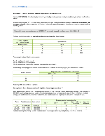 Norma ISO 13406-2 Norma ISO 13406-2 a błędne piksele w panelach monitorów LCD Norma ISO 13406-2 określa między innymi typ i liczbę możliwych do wystąpienia błędnych pikseli na 1 milion pikseli. Norma dzieli panele TFT LCD na klasy określające liczbę i rodzaj defektów matrycy. Defekty te mogą ale nie muszą wystąpić w danym panelu. Ich liczba i położenie są podstawą przy określaniu warunków gwarancji na monitory LCD. Wszystkie ekrany sprzedawane w RECOM IT to panele klasy II według normy ISO 13406-2 Podane poniżej wartości są wartościami maksymalnymi w danej klasie. Liczba błędów na 1 milion pikseli Klasa panela I II III IV Typy błędów Typ 1 0 2 5 50 Typ 2 0 2 15 150 Typ 3 0 5 50 500 Poszczególne typy błędów oznaczają: Typ 1 - całkowicie biały piksel Typ 2 - całkowicie czarny piksel Typ 3 - sub-piksel (czerwony, zielony, niebieski lub jego brak). Jeżeli błędy występują obok siebie w obszarze 5 na 5 pikseli to obowiązująca jest dodatkowa norma: Klasa panela I II III IV Dopuszczalna liczba błędów w klastrze typu 1 lub 2 typu 3 0 0 0 2 0 5 5 50 Klaster jest to obszar 5 na 5 pikseli. Jak wyliczyć ilość dopuszczalnych błędów dla danego monitora ? Ilość błędów można wyliczyć z odpowiedniej proporcji (ilość błędów = ilość błędów wg normy x ilość pikseli / 1 000 000) zaokrąglając zawsze w górę. Poniżej przedstawiono wyliczenia dla paneli klasy II. Należy zwrócić uwagę, że rozdzielczość podana w tabeli nie jest rozdzielczością w jakiej się aktualnie pracuje ale tzw. Dopuszczalna liczba błędów typu 1 lub 2 w typu 3 w typu 1 typu 2 typu 3 klastrze klastrze 15" 1024 x 768 768 432 2 2 4 0 2 17"-19" 1280 x 1024 1 310 720 3 3 7 0 3 20"-24" 1600 x 1200 1 920 000 4 4 10 0 4 rozdzielczością naturalną - jest to rozdzielczość wynikająca z rzeczywistej liczby pikseli na ekranie. Panel Rozdzielczość Ilość pikseli Norma ISO 13406-2 Norma ISO 13406-2 opisuje standardy w zakresie jakości i ergonomii, jakie powinny spełniać dostępne w sprzedaży produkty. Dotyczy ona głównie paneli LCD i jest odpowiedzią na potrzebę stworzenia jednolitej dla wszystkich producentów metody pomiaru i oceny niektórych parametrów i właściwości monitorów ciekłokrystalicznych. Norma ta obowiązuje od 2001 roku. Najważniejsze kwestie, które reguluje norma ISO 13406-2 to: - Jasność wyświetlacza, - Kontrast, - Odbicia, - Reprodukcja kolorów, - Jednolitość podświetlenia i odwzorowania kolorów, - Analiza czcionek, - Migotanie obrazu, - Martwe piksele, - Klasyfikacja kąta widzenia. Skoncentruje się dalej na przedostatnim zagadnieniu, dokładne omówienie pozostałych pozostawiając sobie na przyszłość. Obraz wyświetlany na monitorze LCD składa się setek tysięcy pikseli - pojedynczych punktów, które można wyświetlić na ekranie i które tworzą obraz. Piksel Subpiksel Dodatkowo każdy piksel składa się z trzech mniejszych elementów - subpikseli. Przeciętny monitor 17 calowy posiada ekran o rozdzielczości 1280 na 1024px, czyli ma prawie 2 miliony pikseli. W procesie produkcyjnym, na skutek zanieczyszczeń lub niewystarczającej precyzji, niektóre piksele lub ich składowe mogą ulec trwałemu uszkodzeniu, włączając się lub wyłączając na stałe. To właśnie one widoczne są na ekranie w postaci jasnych lub ciemnych punktów. Norma ISO 13406-2 definiuje zarówno rodzaj wadliwych pikseli, ich liczbę oraz zagęszczenie. Rodzaj wad pikseli Wyróżnia się 3 rodzaje wad pikseli: Wada typu 1 - piksel jest całkowicie ciemny (wyłączony), Wada typu 2 - piksel jest całkowicie jasny (włączony), Wada typu 3 - jeden z subpikseli (czerwony, zielony lub niebieski) jest stale włączony (świeci swoim kolorem) lub ciemny (wygaszony). Wada typu 1 Wada typu 2 Wada typu 3 Wada typu 3 Norma definiuje także dopuszczalna liczbę i rodzaj wad w klastrze - obszarze ekranu o wymiarach 5 x 5 pikseli. Rodzaje wad klastra Wyróżnia się następujące rodzaje wad klastra pikseli: Wada typu 1 lub 2: całkowicie jasne lub ciemne piksele w obrębie klastra, Wada typu 3: wadliwe subpiksele (czerwone, zielone lub niebieskie) trwale święcące lub wygaszone. Wada typu 1 Wada typu 2 Wada typu 3 Wada typu 3 Klasy No tak, dużo się już wyjaśniło, ale ciągle nie jest jasne jak to wszystko ma się do poziomu jakości, którą rzekomo prezentuje dany monitor. Do tego celu służą właśnie klasy, jakie wyznacza norma. Za ich pomocą, bez zbędnego wgłębiania się w szczegóły czy operowania niepotrzebnymi liczbami, producent mówi nam jak dobrze (lub nie) prezentuje się panel. Oczywiście pod względem wad pikseli. Klasa wyznacza granice ilościowe i jakościowe defektów matrycy. Aby mogła być swobodnie stosowana (dla panelów o dowolnej wielkości) limity podawane są w przeliczeniu na milion pikseli. Liczba błędów na 1 milionów pikseli Typ 1 Typ 2 Typ 3 I 0 0 0 II 2 2 5 III 5 15 50 IV 50 150 500 Tabela 1. Klasy matrycy - liczba i rodzaj wad na milion pikseli Klasa panela Dopuszczalna liczba błędów w klastrze Typ 1 lub 2 Typ 3 I 0 0 II 0 2 III 0 5 IV 5 50 Tabela 2. Klasy matrycy - liczba i rodzaj wad w klastrze na milion pikseli Klasa panela Co więcej, liczbę dopuszczalnych wad pikseli można obliczyć za pomocą wzoru: Liczba błędów = liczba pikseli rozdzielczości fizycznej / 1 000 000 x liczba wad pikseli danego typu* * dopuszczana w ramach klasy, do której zakwalifikowano panel Badanie matrycy na obecność wad pikseli Według normy, do prawidłowego pomiaru muszą być spełnione następujące warunki: Czas nagrzewania testowanego monitora: min. 60 minut, Temperatura otoczenia: -5 do +25 stopni C,>br />Względna wilgotność powietrza 40-70%, Test musi być przeprowadzony w zaciemnionym pomieszczeniu. W praktyce nie ma prostego i uniwersalnego sposobu, ułatwiającego lokalizację czy rozróżnienie wad pikseli. Pomocne mogą się okazać programy do testowania monitorów LCD. Można także