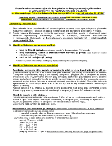Kryteria naborowo-selekcyjne dla kandydatów do klasy sportowej – piłka nożna w Gimnazjum nr 16 im. Fryderyka Chopina w Lublinie do Gimnazjalnego Ośrodka Szkolenia Sportowego Młodzieży na rok szkolny 2016/2017 Zawodnicy klubów Lubelskiego Związku Piłki Nożnej/staż zawodnika – minimum 2-3 lata premiowana jest przynależność do reprezentacji Lubelskiego Związku Piłki Nożnej Zawodnicy - rocznik 2003 1. Stan zdrowia: brak przeciwwskazań zdrowotnych orzeczony przez specjalistyczną placówkę medycyny sportowej - aktualne badania lekarskie jak dla zawodnika piłki nożnej w klubie. 2. Opinie trenera klubowego o poziomie sportowym zawodnika, opinia z obserwacji przez trenerów reprezentacji Lubelskiego ZPN w turniejach, meczach mistrzowskich w rozgrywkach klubowych, w konsultacjach, meczach kontrolnych i mistrzowskich reprezentacji LZPN. 3. Wyniki prób testów sprawności ogólnej: bieg na 50m (2 próby) czas mierzony ręcznie* z dokładnością do 1/10 sekundy bieg wahadłowy 4x10m z przenoszeniem klocków (2 próby) czas mierzony ręcznie z dokładnością do 1/10 sekundy skok w dal z miejsca (2 próby) * możliwość pomiaru fotokomórką // punktacja wg Międzynarodowego Testu Sprawności Fizycznej. 4. Wyniki prób testów sprawności specjalnej: Żonglerka, przyjęcia piłki, zwody, prowadzenie piłki (nr 4) w kwadracie 20 m x20 m., gdzie ustawione są pachołki - na - żonglerkę rozpoczynamy nogą prowadzenie piłki i wykonywanie między pachołkami, prowadzenie prowadzenie piłki: slalomem, po prostej, na ominięcie ze zwodem z piłki leżącej -żonglerka i przyjęcie piłki z żonglerki do boiska, zwodów przy ominięciu pachołków, prowadzenie piłki w slalomie piłki po prostej na wyznaczonym odcinku (po rozpoczęciu żonglerki, prezentacji przyjęć, kolejne ćwiczenia w dowolnej kolejności, przeplatane żonglerką). Wszystkie ćwiczenia wykonywane w oznaczonym kwadracie /czas na wykazanie się umiejętnościami technicznymi wynosi 2-3 minuty. Ocena szkolna 1-6. Ocena 6, bardzo dobre panowanie nad piłką przy żonglerce prawą i lewą nogą, wykonywanie w/w ćwiczeń lewą i prawą nogą (ocenia 2-3 szkoleniowców). Strzał do bramki z piłki stojącej. - strzały wykonujemy na bramkę pełnowymiarową 7,32 m x 2,44 m. podzieloną na sektory (2 sektory boczne A - po 2 m od słupka – wiszącym pachołkiem). Sześć piłek (nr 4) ustawiamy na wysokości 16,5 m. na przeciwko bramki i w odległości 1 m od siebie (strzał dowolną nogą). Maksymalna ilość punktów do zdobycia: 6 pkt. Prowadzenie piłki slalomem (2 próby) /dla zawodników lewonożnych odcinek 2 m.+2 m. ustawiony w odwrotnym kierunku (w lewo od miejsca startu) - zawodnik prowadzi piłkę (nr 4) po wyznaczonym torze (40 metrów) wg schematu; - czas mierzony ręcznie z dokładnością do 1/10 sekundy; Wynik końcowy to czas pokonania dystansu w przeliczeniu na punkty: poniżej 20 sekund – 6 pkt. 20,0 – 21,0 – 5 pkt. 21,1 – 22,0 – 4 pkt. 22,1 – 23,0 – 3 pkt. 23,1 – 24,0 – 2 pkt powyżej 24 sekund – 1 pkt. *-dostosowanie czasu i punktacji do wyników grupy po sprawdzianie. Zagranie - przerzut na dokładność z odległości 25 m. w kwadrat 5x5 m. (ćwiczenie – sprawdzian w dwójkach) - zawodnicy ustawienie od siebie w odległości 25 m. poruszają się w oznaczonym polu (kwadrat 5x5 m), zagrywając do siebie piłkę (nr 4) po prowadzeniu (po zagraniu - tor lotu piłki w powietrzu), liczy się dokładność zagrania – w pole kwadratu w kolejnych 10 zagraniachprzerzutach wykonywanych do siebie na zmianę przez zawodników dowolną nogą. Maksymalna ilość punktów do zdobycia: 6 pkt.(10 x piłka trafia w pole kwadratu, lub przyjęta jest w polu kwadratu przez zawodnika - współpartnera z próby-sprawdzianu). Gra 7x7 lub 8 x 8 (w zależności od ilości zawodników do podziału na grupy do kolejnych sprawdzianów). - poziom umiejętności techniczno - taktycznych na podstawie obserwacji w małej grze z bramkarzami, czas gry – do 20 minut, bramki 5x2 m, boisko o wymiarach 45-50x35-40 m. Przy braku bramkarzy gra na polu gry j/w na 4 bramki. Bramki o szer. 2m ustawione na liniach końcowych wyznaczonego boiska, w odległości 5 m. od linii bocznych, oznaczone tyczkami. Ocenie gry podlegają: Umiejętność gry kombinacyjnej (zmysł do gry), szybkość działania, podejmowania właściwych, trafnych decyzji, szybkość z piłką (szybkość specjalna) oraz szybkość lokomocyjna (starty, przyśpieszenia), technika, sposób poruszania się, aktywność i kreatywność w grze. Ocena szkolna 1-6 (ocenia 2-3 szkoleniowców) Bramkarze – sprawdzian umiejętności pod nadzorem trenerów bramkarzy / m. in. sprawność – przewroty, pady, chwyt piłki, obrona strzałów, wyrzut piłki, gra nogą. Za nabór do klasy sportowej w Gimnazjum nr 16 w Lublinie, do GOSSM odpowiedzialny jest Lubelski Związek Piłki Nożnej. TESTY SPRAWNOŚCIOWE DO KLASY SPORTOWEJ ZE SPECJALNOŚCIĄ PIŁKA NOŻNA NA ROK SZKOLNY 2016/2017 – 16 MAJA 2016 (PONIEDZIAŁEK) Zbiórka uczniów-zawodników, kandydatów do klasy sportowej, rocznik 2003 – GIMNAZJUM nr 16 w Lublinie, ul. Poturzyńska 2: -dnia 16.05.2016 r. (poniedziałek), godz. 10.00, hol przy sali gimnastycznej (wejście od strony boiska i basenu). - miejsce sprawdzianów: boisko szkolne, piłkarskie ze sztuczną trawą; - niezbędny sprzęt sportowy: koszulka, spodenki, skarpetogetry, ochraniacze, buty piłkarskie, buty z płaską podeszwą do sprawdzianów biegowych na bieżni lekkoatletycznej, bramkarze - pełny sprzęt do gry; - dokumenty: legitymacja szkolna lub paszport, karta zdrowia z klubu lub zaświadczenie od uprawnionego lekarza; - inne: długopis, ręcznik, klapki. Zaplanowano rozmowę z kandydatami oraz wypełnienie ankiety. Przewidywany czas na przeprowadzenie sprawdzianów – od 1000 - do 1500 Dla uczestników sprawdzianów przewidziano posiłek ok. godz.1200/1200 /-/ Tomasz Złomańczuk Koordynator GOSSM w Lublinie Kontakt: tel