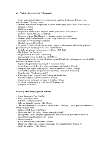a) Projekty inwestycyjne (18 marca): – Ursus- przystanek tradycja i współczesność Centrum Kulturalno-Integracyjne mieszkańców Dzielnicy Ursus – Budowa nawierzchni bezpiecznej na placu zabaw przy ulicy Dzieci Warszawy 42 – Ścianka do tenisa – Wybieg dla psów – Bezpieczna nawierzchnia na placu zabaw przy Dzieci Warszawy 42 – Budowa Fitness Parku na Gołąbkach – Rowerem ominąć Plac Bankowy - trasa po stronie wschodniej – Budowa oświetlenia chodnika wzdłuż ulicy Jana Marcina Szancera. – Remont ulicy Wincentego Kadłubka – Chodnik przy ul. Regulskiej – Aktywna Prawnicza - miejsce rozwoju i wsparcia aktywności lokalnej i organizacji pozarządowych działających na rzecz mieszkańców. – Dodatkowe miejsca parkingowe przy Placu 1905 Roku – Plac Zabaw Dla Dorosłych – Bezpłatny klub dla dzieci i młodzieży. – Zadaszenie trybuny na stadionie OSiR Ursus – Termomodernizacja, remont sali gimnastycznej i budynku klubowego na terenie OSIR – Dzielnicy Warszawa Ursus. – Poprawa bezpieczeństwa pieszych w Dzielnicy Ursus – Oświetlenie przejść dla pieszych w wybranych miejscach w Ursusie – Zakup sprzętu nagłaśniającego dla społecznego klubu seniora "Promyk" – Doświetlenie przejść dla pieszych w Dzielnicy Ursus m.st. Warszawy – Park dla psów "Dżekusiowe pole" – Klimatyzacja sali imprez Domu Kultury KOLOROWA – Ratujmy zabytkową kolekcję fabryki Ursus! – Usprawnienie ruchu rowerowego w Dzielnicy Ursus – 10 miejsc postojowych przy ul. Dzieci Warszawy 11 – Fortepian dla Ursusa Projekty nieinwestycyjne (19 marca) – Ursus Street Art- Free Graffiti – Warsztaty- Street Artu – Szkolna akademia przyrody – Łąka kwietna dla Ursusa – Eko Miasto – "Świat w obiektywie"- aktywacja społeczności Dzielnicy "Ursus" przez działalność w sekcji fotograficznej – Bajkowy Park Rozrywki "Oaza" – Plenerowe bajki dla dzieci "Nasze wakacyjne bajki" – Ekologiczny Ursus- Program ograniczenia zanieczyszczeń powietrza w Ursusie – Internet dla niepełnosprawnych – Ursus – Zdrowe wakacje – STOP narkotykom w szkole na Ursusie – Plenerowe widowisko teatralno-muzyczne protest robotników Ursusa 76' – Budki dla ptaków – Eko Miasto – Bezpłatne zajęcia pozalekcyjne ze sztuki wystąpień publicznych dla dzieci ze szkół podstawowych w Ursusie – Wypożyczalnia Zabawek – "Międzypokoleniowe Śpiewanie" - Otwarte Warsztaty dla Dzieci - pieśni Powstania Warszawskiego – Integracja rodzin z terenu Ursusa poprzez wycieczki krajoznawcze – Ocalić pamięć Zakładów Mechanicznych "Ursus" – Piosenki retro w kolorowej – Pierwszy krok w przedszkolu do wielkiego futbolu – "PIK"- przyjdź i korzystaj – Monografia Chóru Cantate Deo – Koncert JWP i ZBUKU – Zieleń wokół budynku wspólnoty mieszkaniowej Walerego Sławka 3/5 w Warszawie – Promocja czytelnictwa- Zakup nowości wydawniczych i e-booków – Sportowa lekcja z nauczycielem w-fu ( "od zabawy do sportu") w klasach 1-3 – Ursus bez nienawiści. Usuwamy mowę nienawiści z ursuskich murów – XXXI Rajd "Szlakiem Naszej Historii" im. por. hm. Jana Cierlińskiego