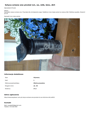 Sztyca octane one pivotal (o1, oo, mtb, bmx, dirt [Sprzedam] Pivotal Witam, Sprzedam sztyce octane one. Przycięta dla zmniejszenia wagi. Siodło(na innej mojej aukcji) ze sztycą 18zł. Możliwa wysyłka. Dzwonić po 16. Sprawdź inne moje aukcje. Informacje dodatkowe Stan Używany Ilość 1 Oferta prywatna/sklepu Oferta prywatna Długość (mm) ok. 30 Średnica 27,2 Adres ogłoszenia http://rowerowybazar.com.pl/-sztyca-octane-one-pivotal-o1-oo-mtb-bmx-dirt,o4021 Kontakt Mail: [email protected] Telefon: 572 625 059 Lokalizacja , rzeszów Podkarpackie (pl) Ogłoszenie dodano: 2016-06-03 20:44:19 Ogłoszenie wygasa: 2016-12-01 15:18:27 Powered by TCPDF (www.tcpdf.org)